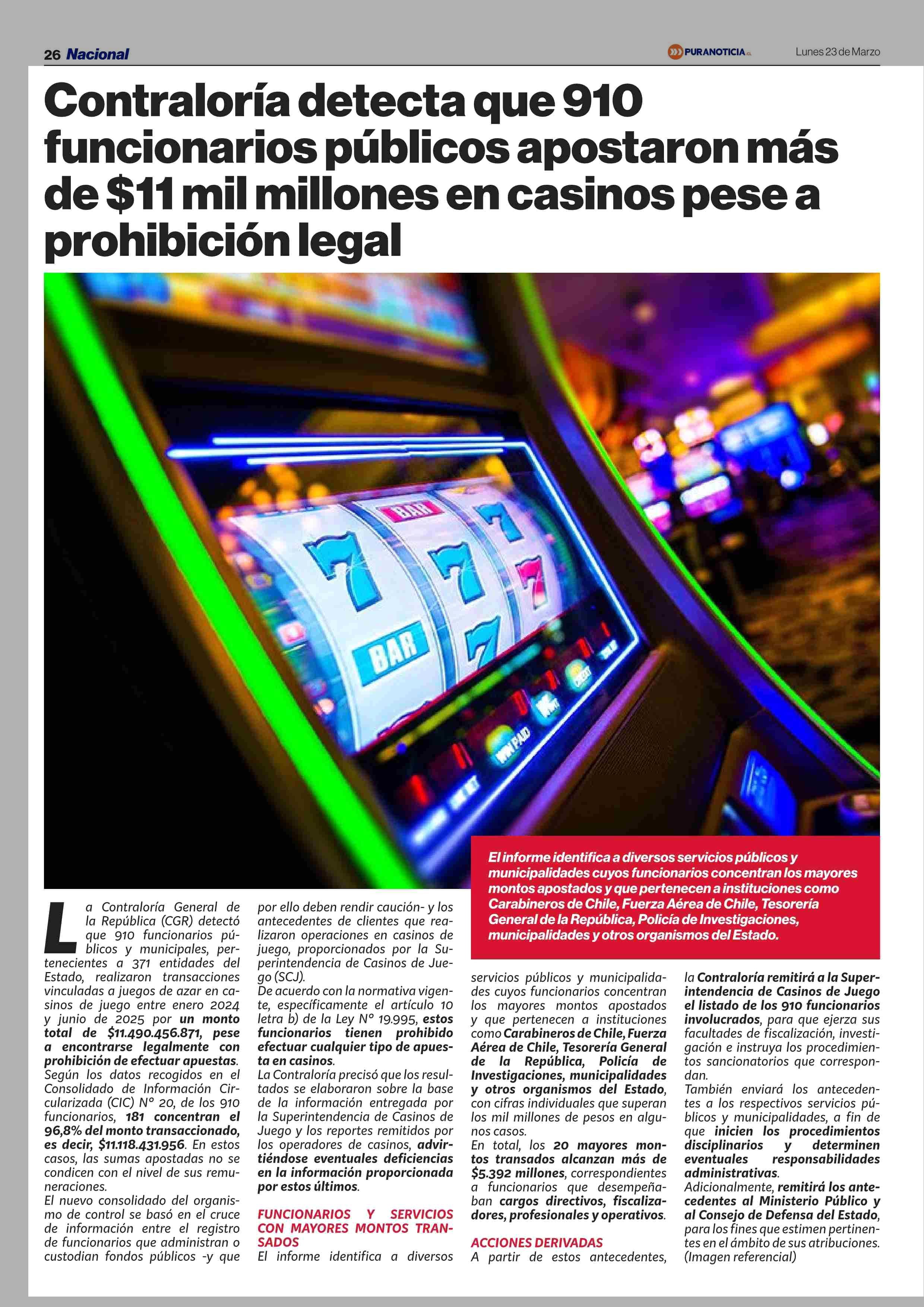 Contraloría detecta que 910 funcionarios públicos apostaron más de $11 mil millones en casinos pese a prohibición legal 23-03-2026 Puranoticia.cl |