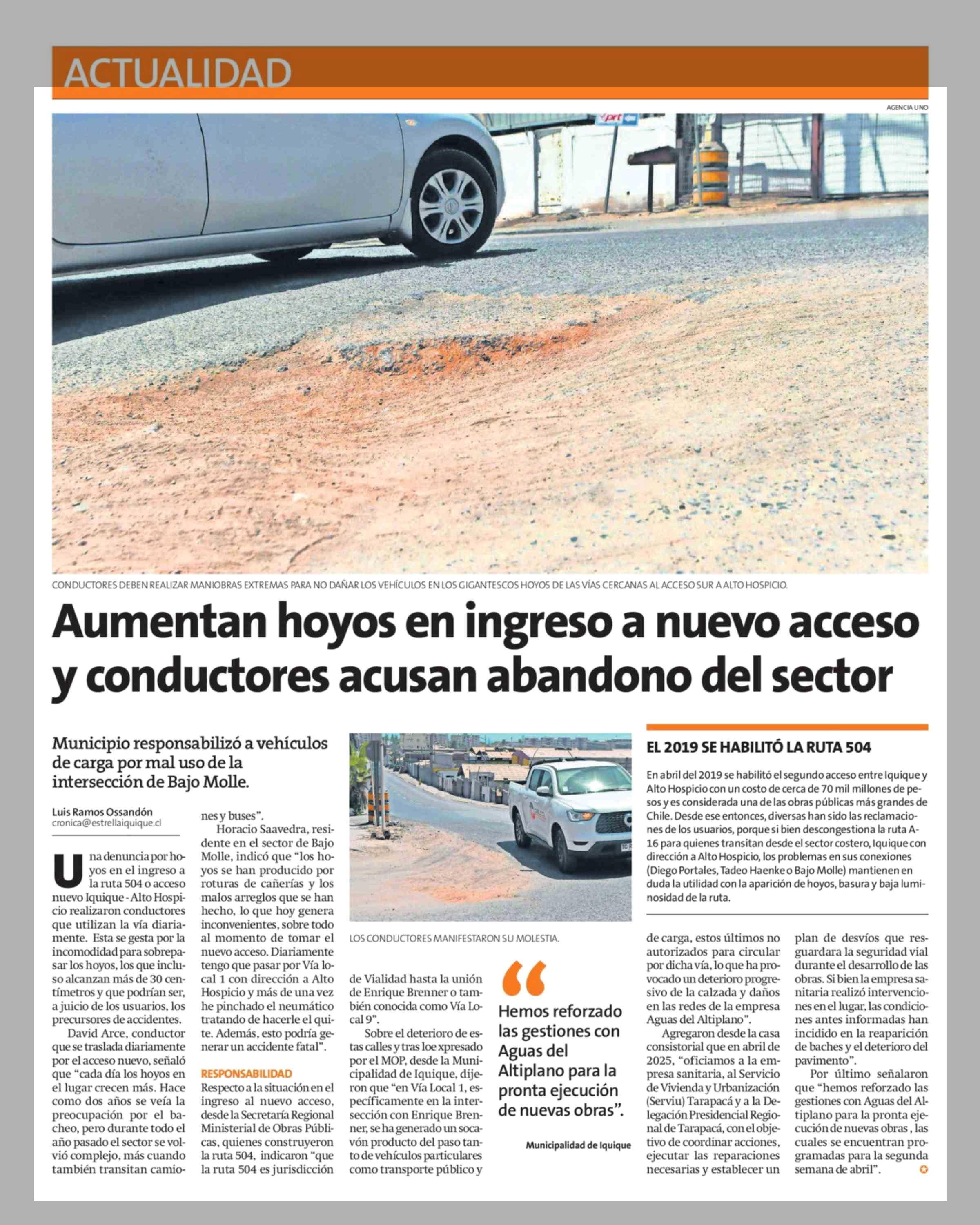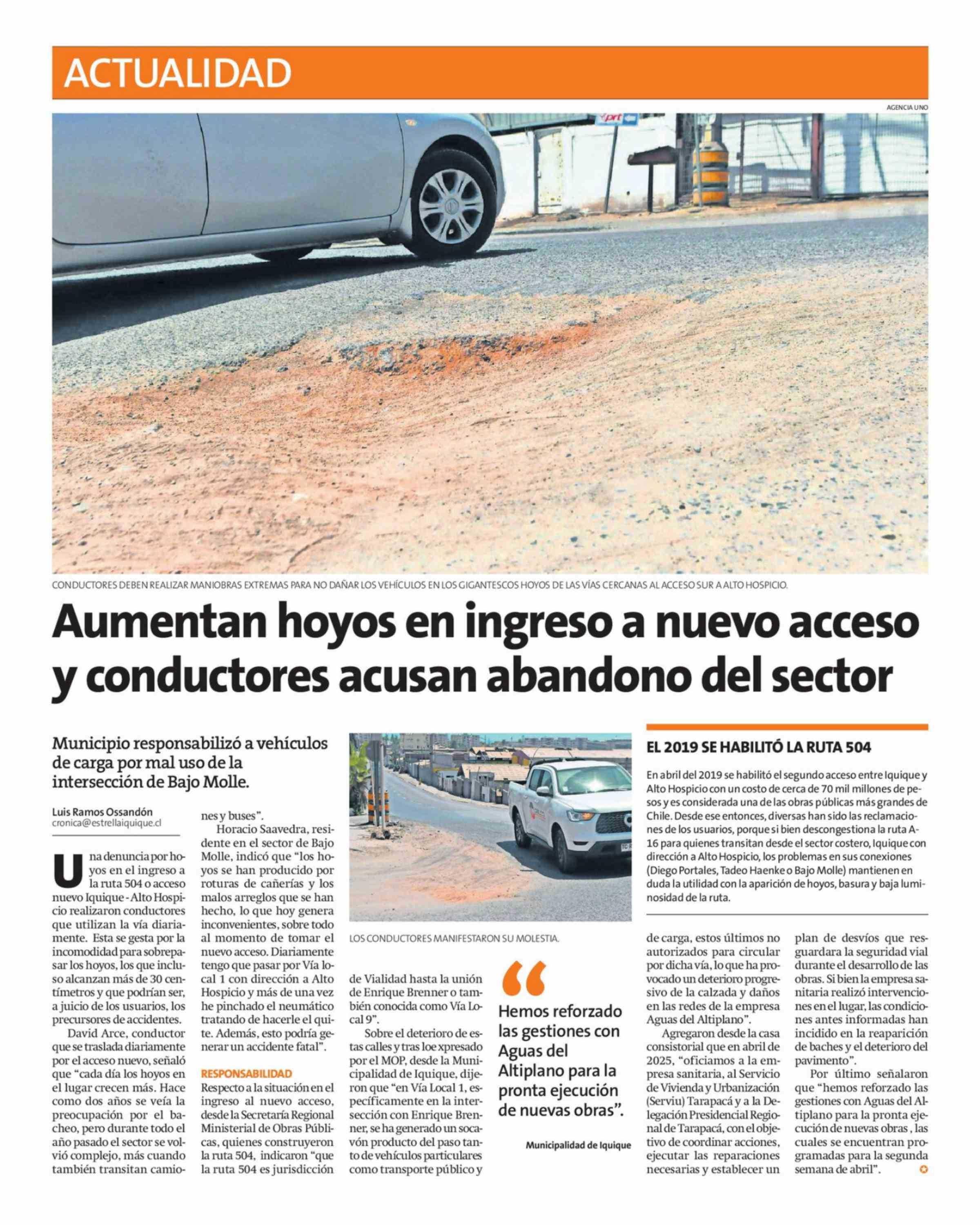 Aumentan hoyos en ingreso a nuevo acceso y conductores acusan abandono del sector 19-03-2026 La Estrella de Iquique |