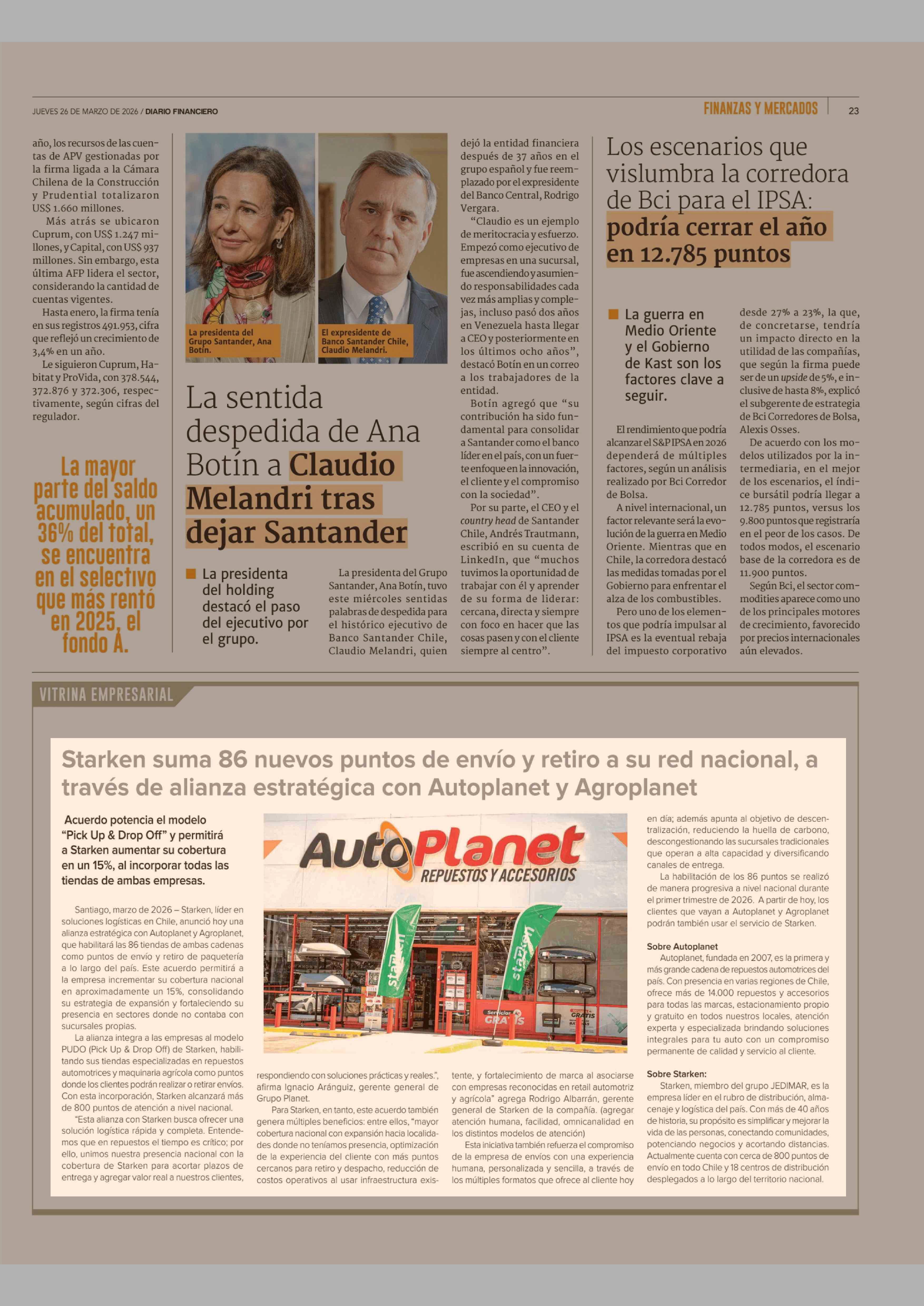 Starken suma 86 nuevos puntos de envío y retiro a su red nacional, a través de alianza estratégica con Autoplanet y Agroplanet 26-03-2026 Diario Financiero |