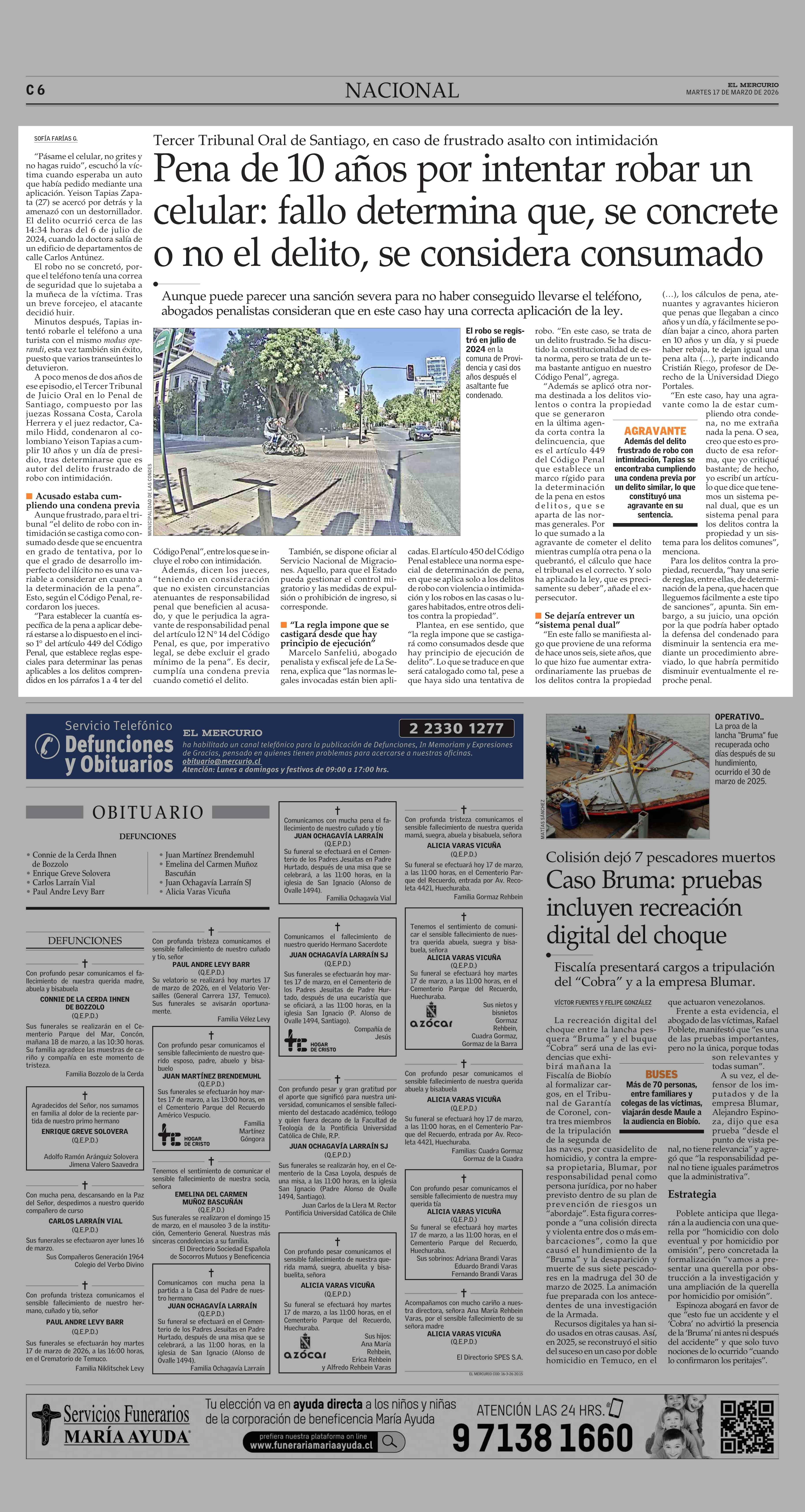 Pena de 10 años por intentar robar un celular: fallo determina que, se concrete o no el delito, se considera consumado 17-03-2026 El Mercurio |