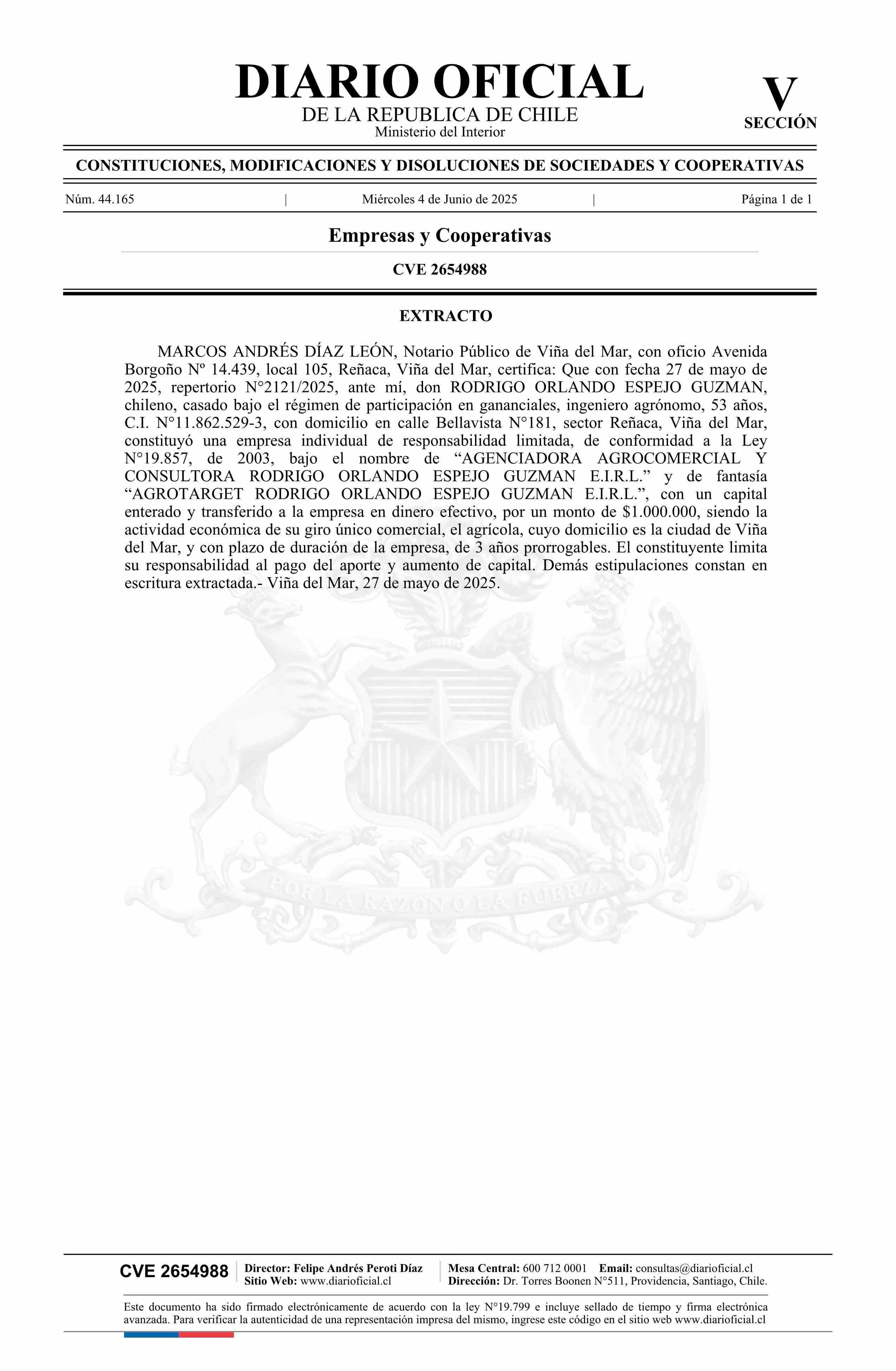 AGENCIADORA AGROCOMERCIAL Y CONSULTORA RODRIGO ORLANDO ESPEJO GUZMAN E.I.R.L. 04-06-2025 Diario Oficial Edición Electrónica |