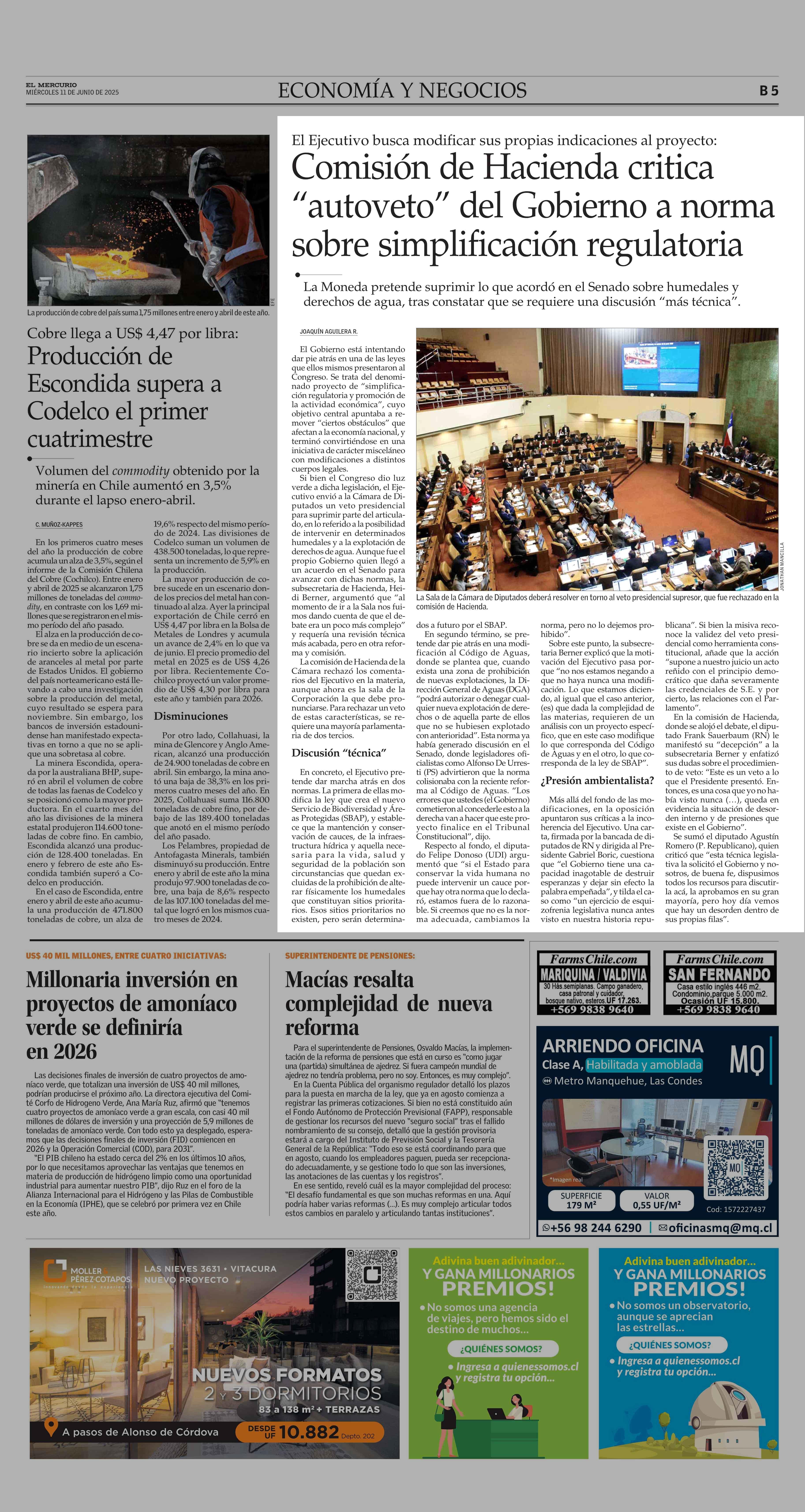 Comisión de Hacienda critica "autoveto" del Gobierno a norma sobre simplificación regulatoria 11-06-2025 El Mercurio |