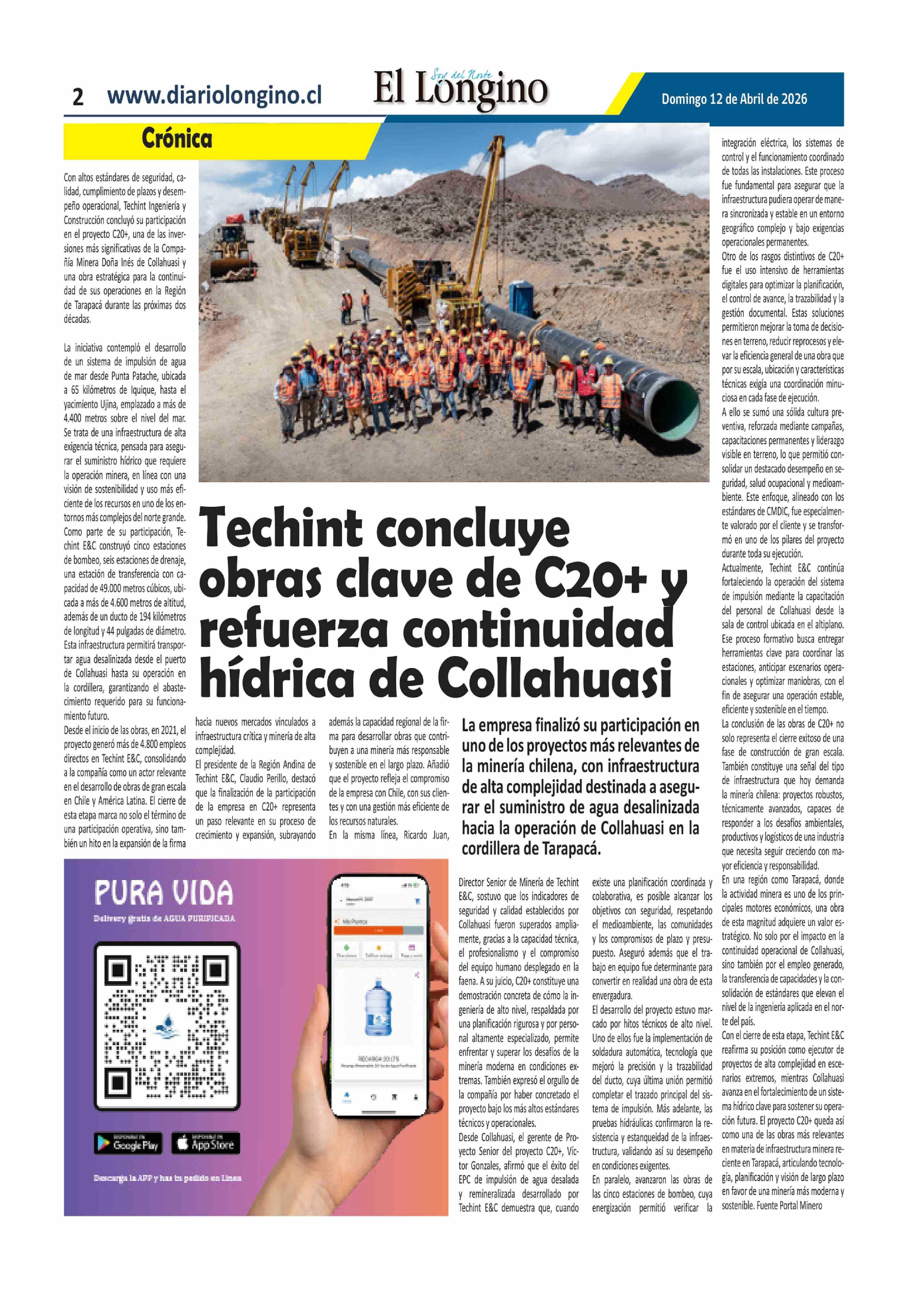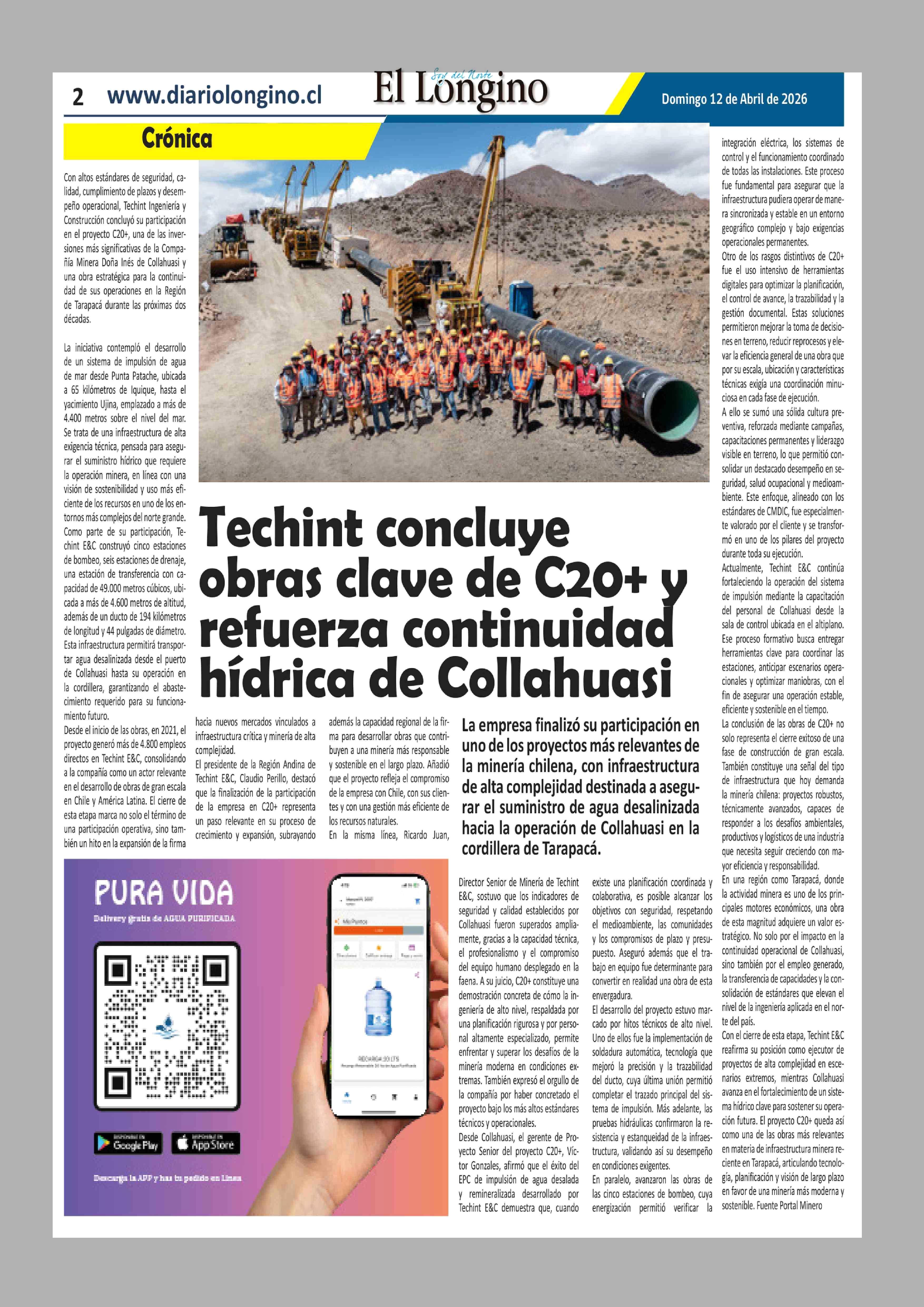 Título: Techint concluye obras clave de C20+ y refuerza continuidad hídrica de Collahuasi