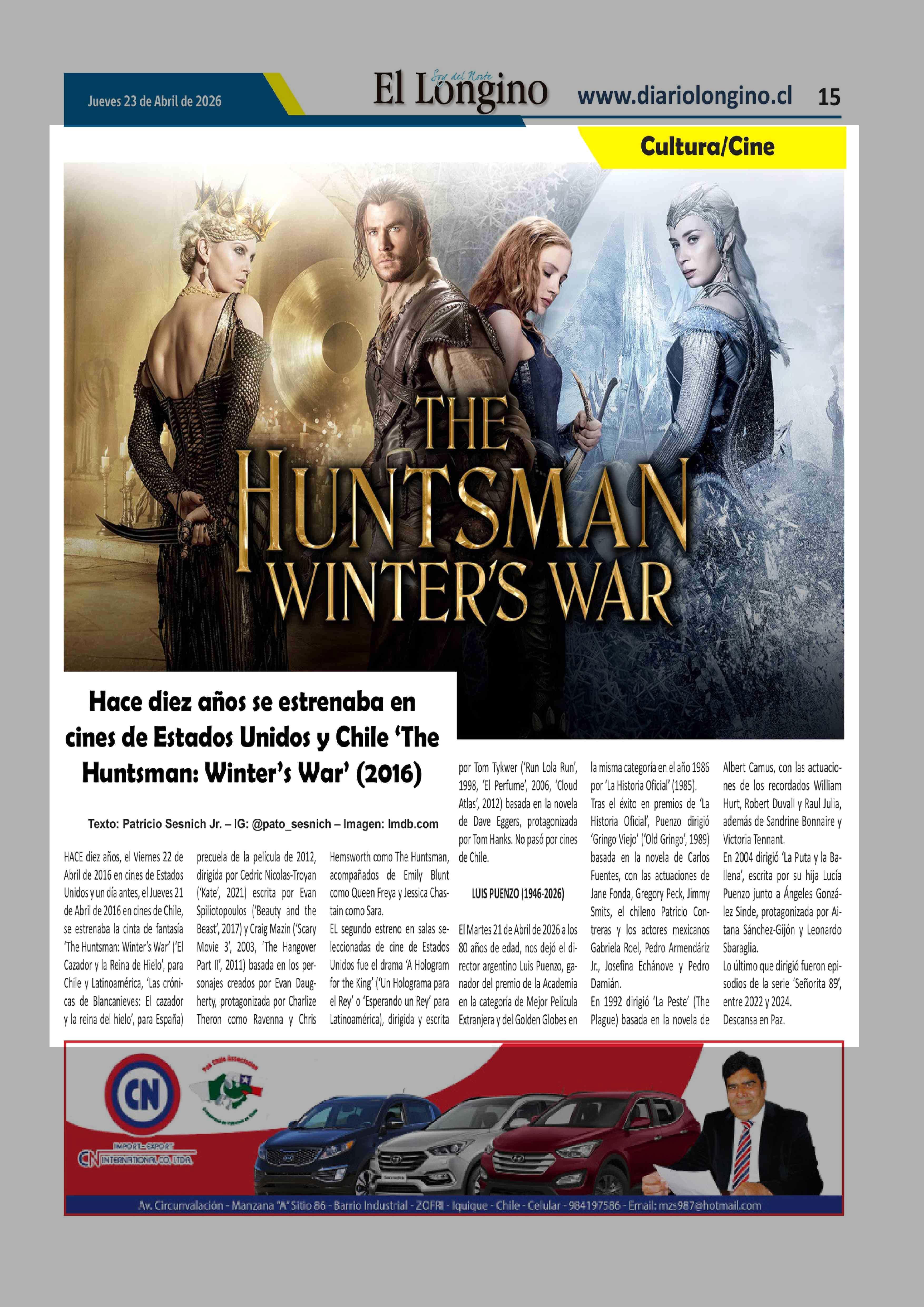 Hace diez años se estrenaba en cines de Estados Unidos y Chile 'The Huntsman: Winter's War' (2016) 23-04-2026 El Longino |