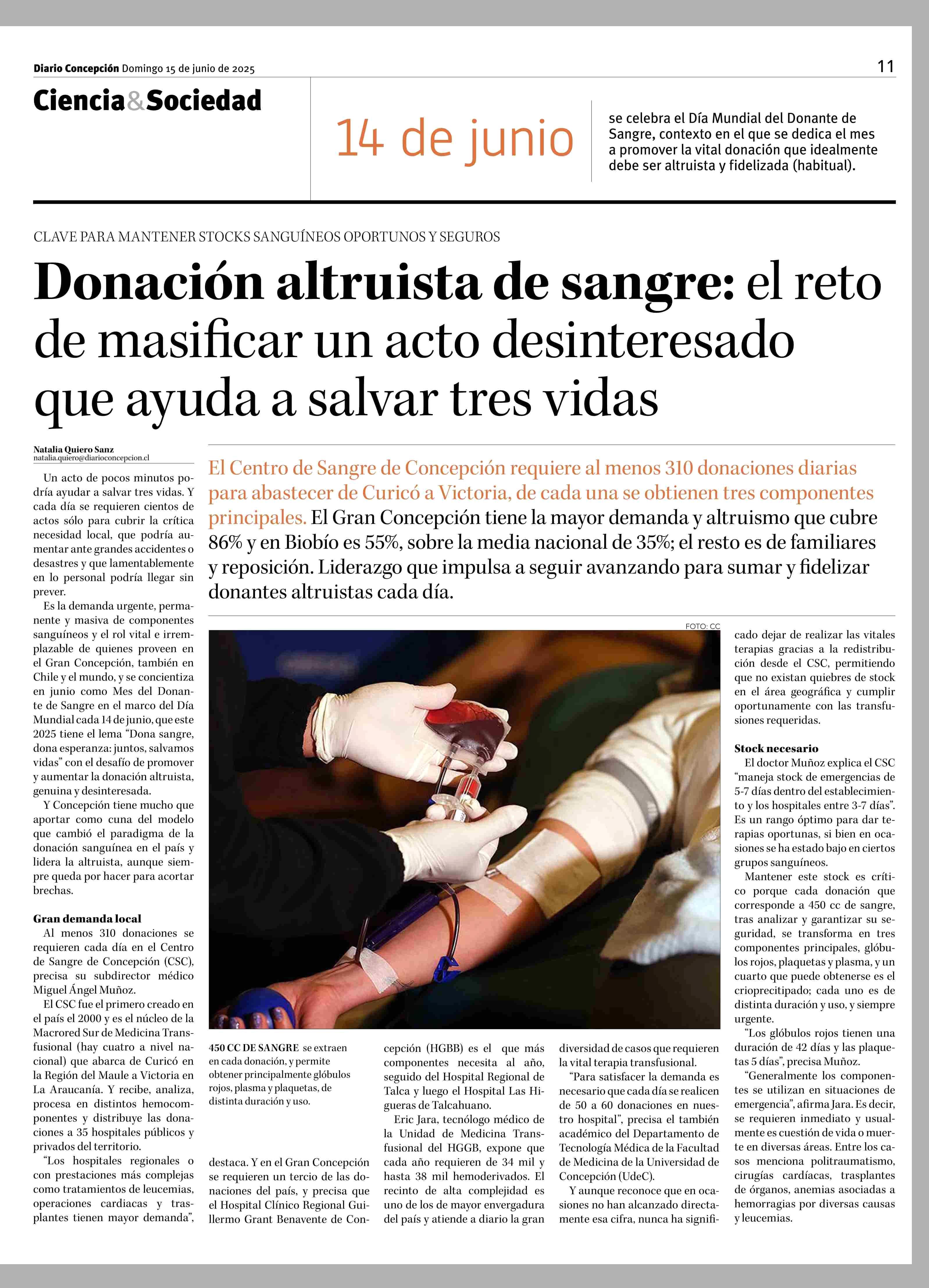 Donación altruista de sangre: el reto de masificar un acto desinteresado que ayuda a salvar tres vidas 15-06-2025 Diario Concepción |