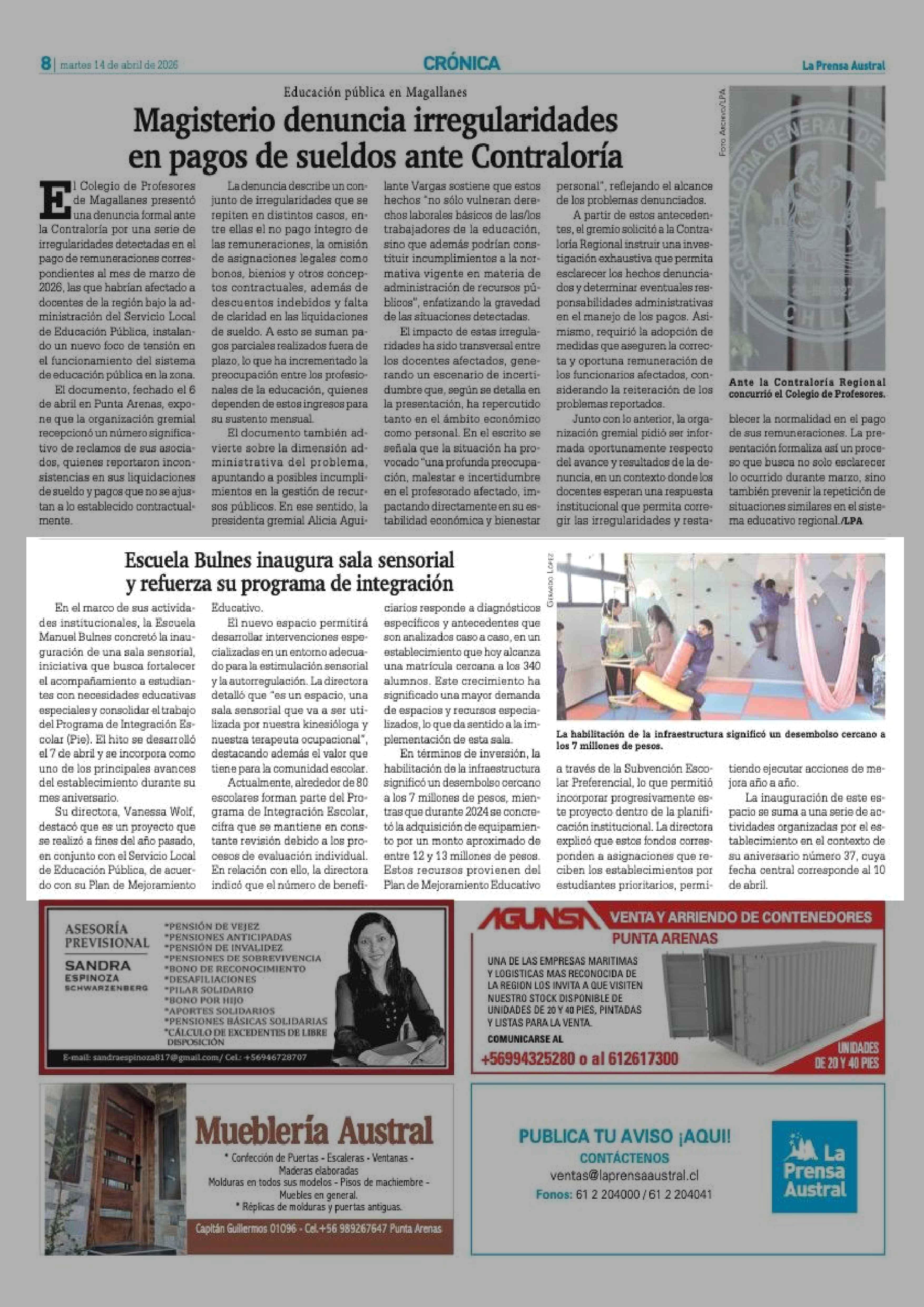 | Fecha: | 14-04-2026 | Sector: | Noticia general | Región: | Región de Magallanes y de la Antártica Chilena |