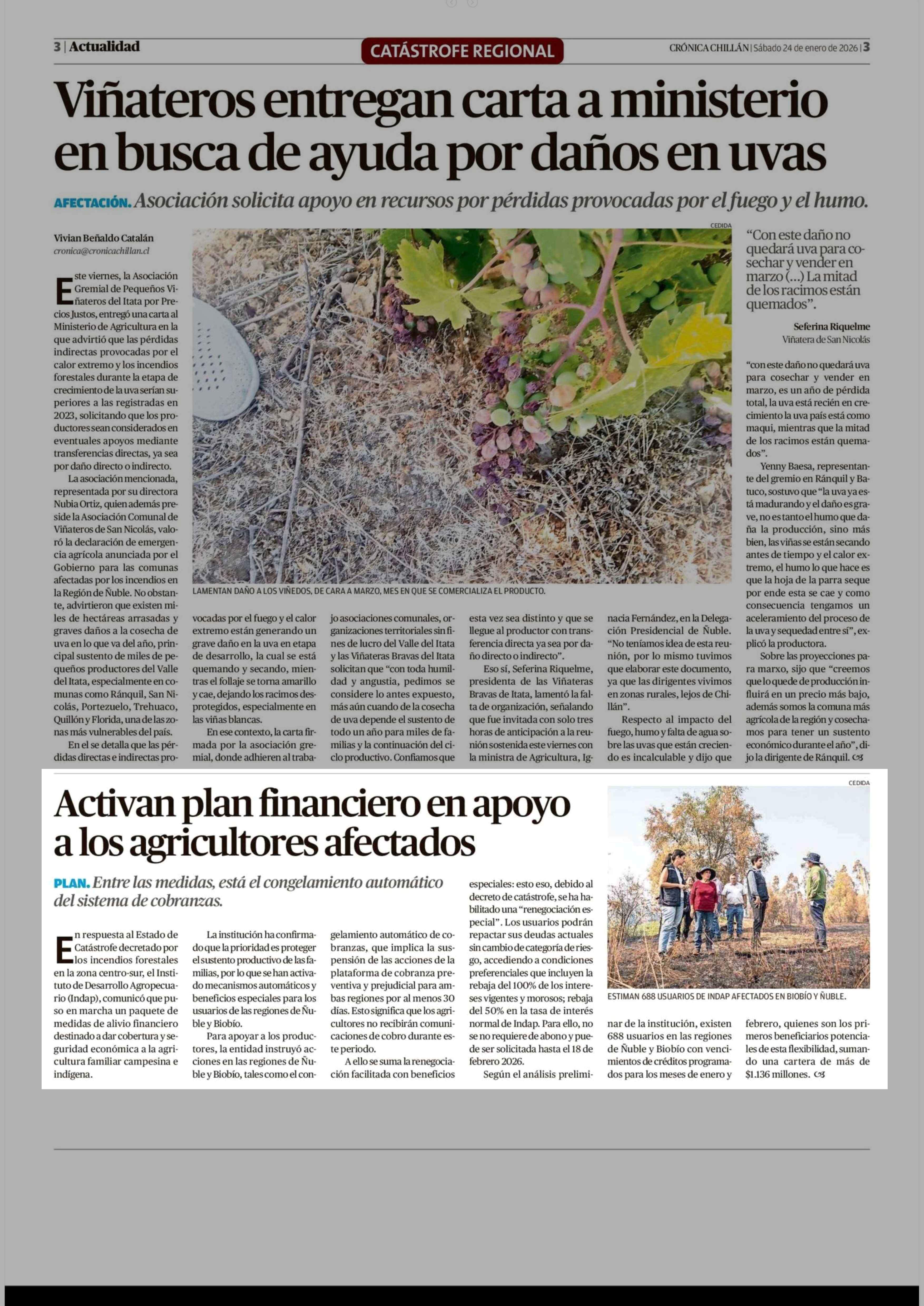 Activan plan financiero en apoyo a los agricultores afectados 24-01-2026 Crónica de Chillán |