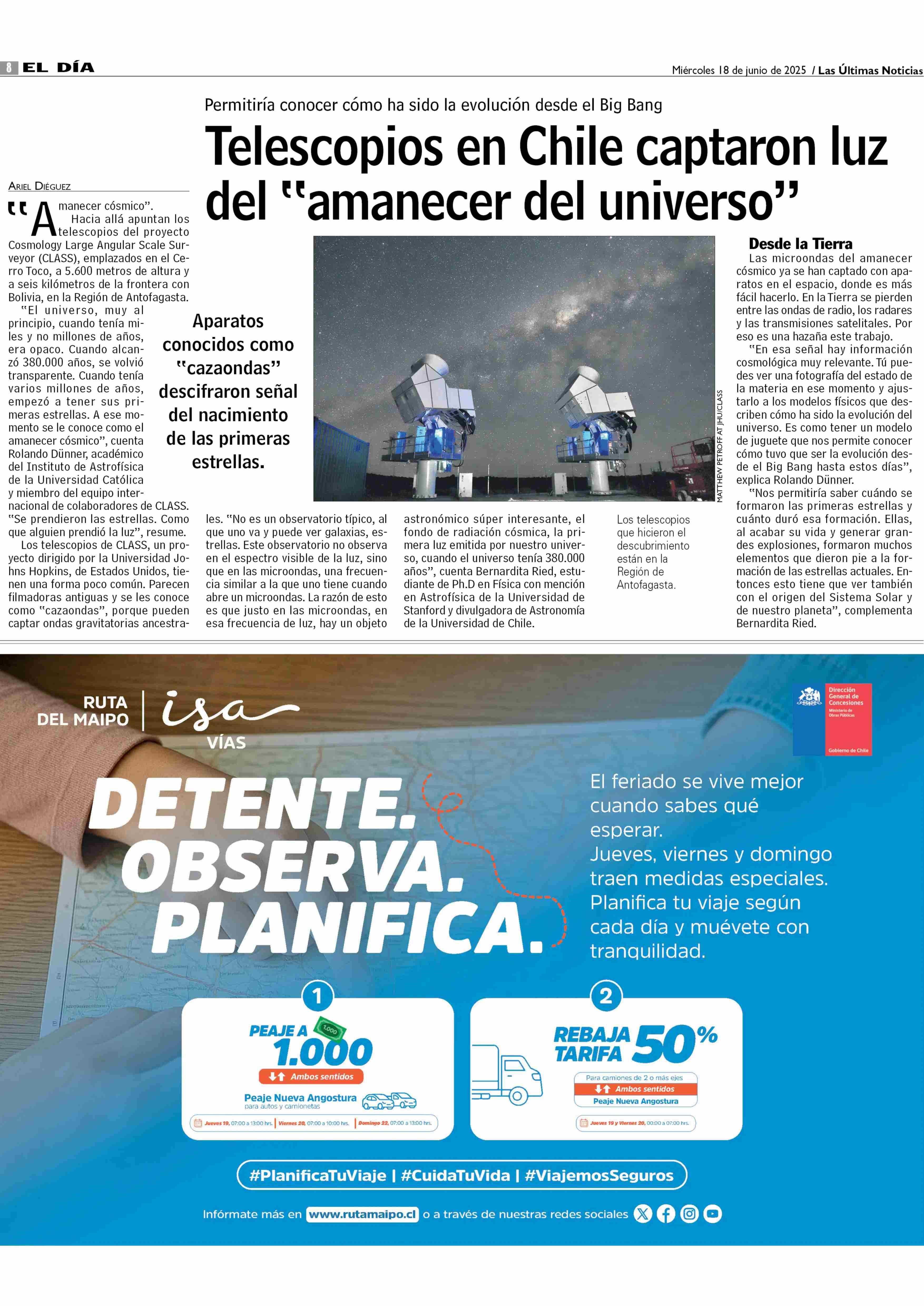 Telescopios en Chile captaron luz - del “amanecer del universo” 18-06-2025 Las Últimas Noticias |