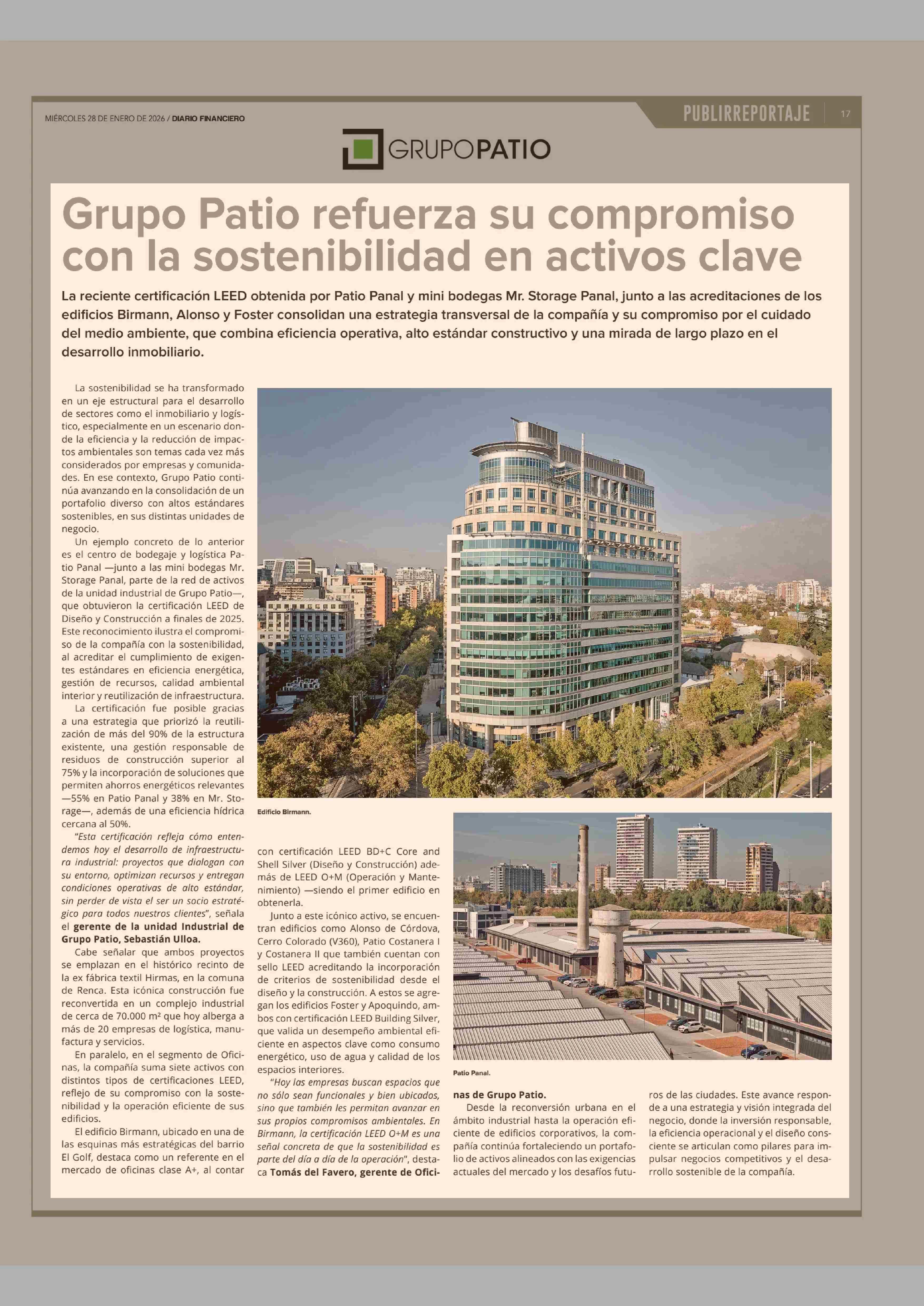 Grupo Patio refuerza su compromiso con la sostenibilidad en activos clave 28-01-2026 Diario Financiero |