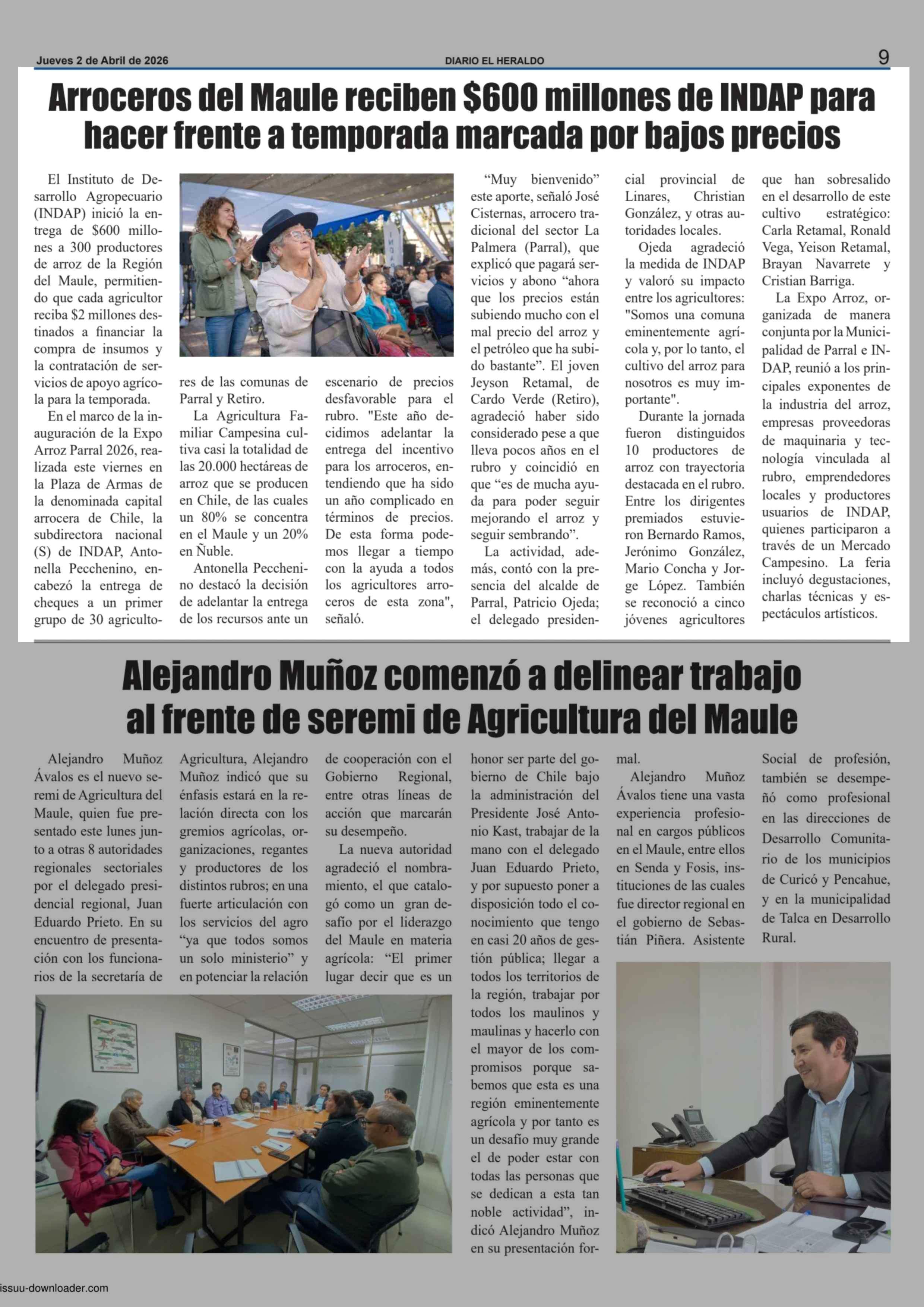 Arroceros del Maule reciben $600 millones de INDAP para hacer frente a temporada marcada por bajos precios 02-04-2026 El Heraldo |