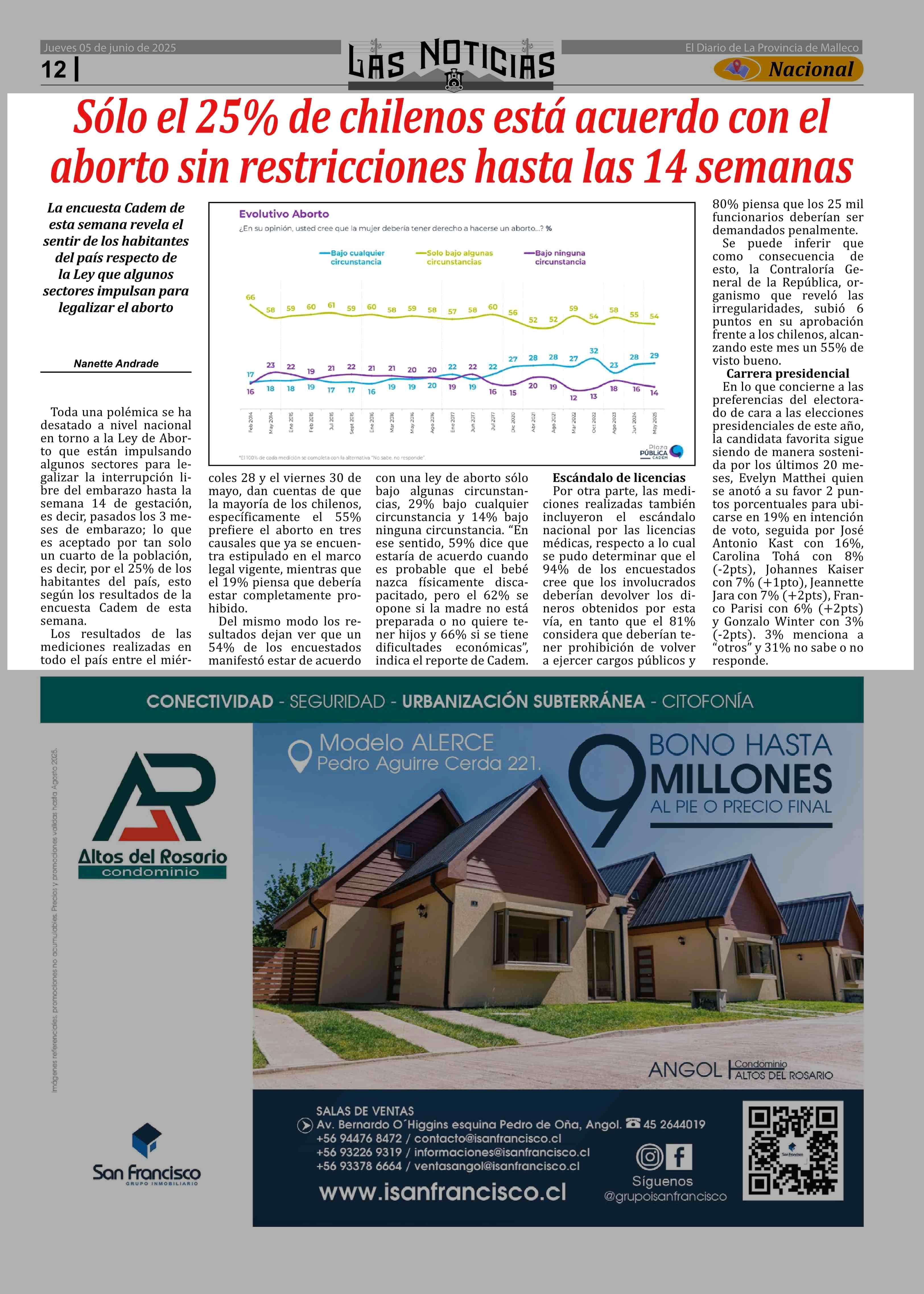 Sólo el 25% de chilenos está acuerdo con el aborto sin restricciones hasta las 14 semanas 05-06-2025 Las Noticias |