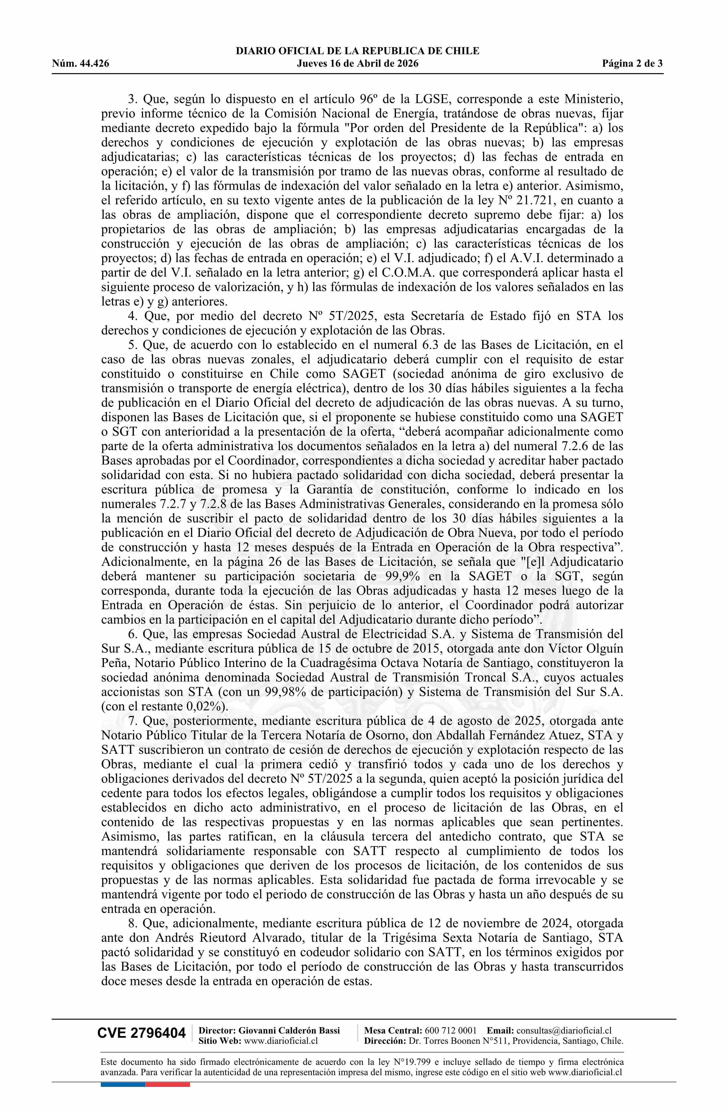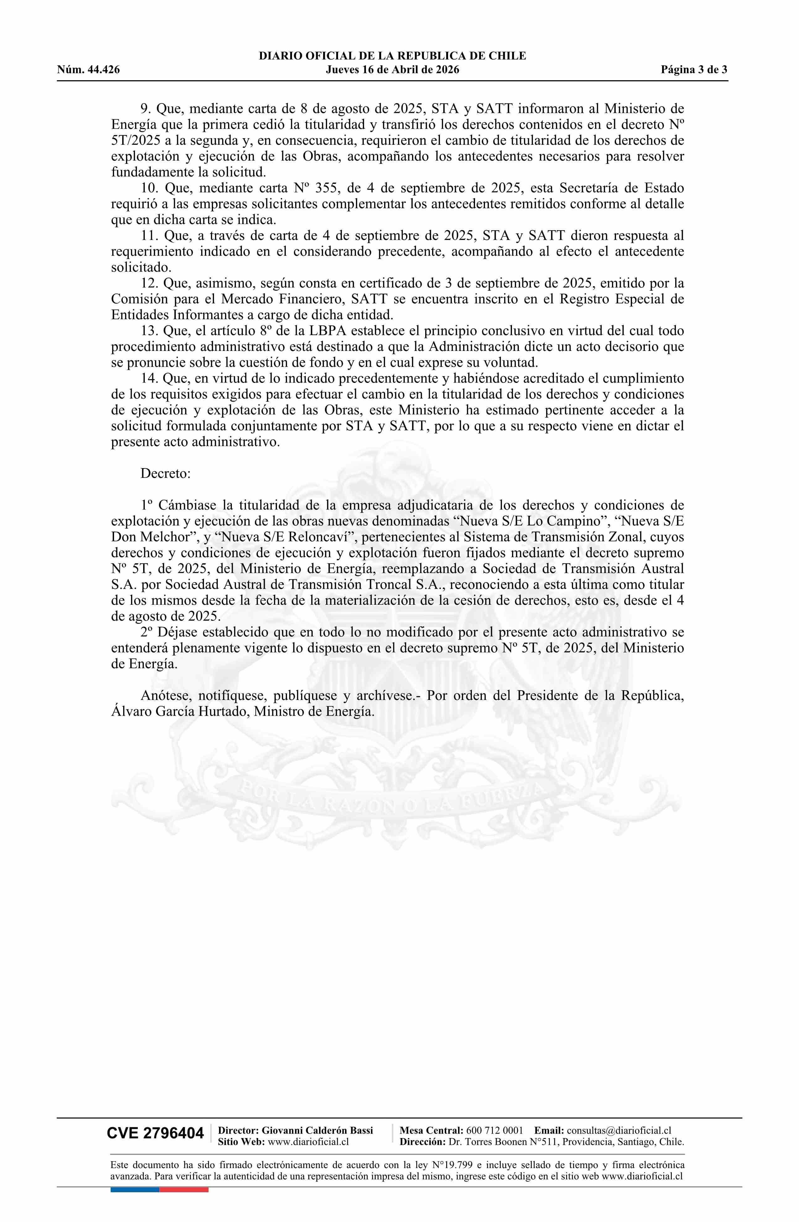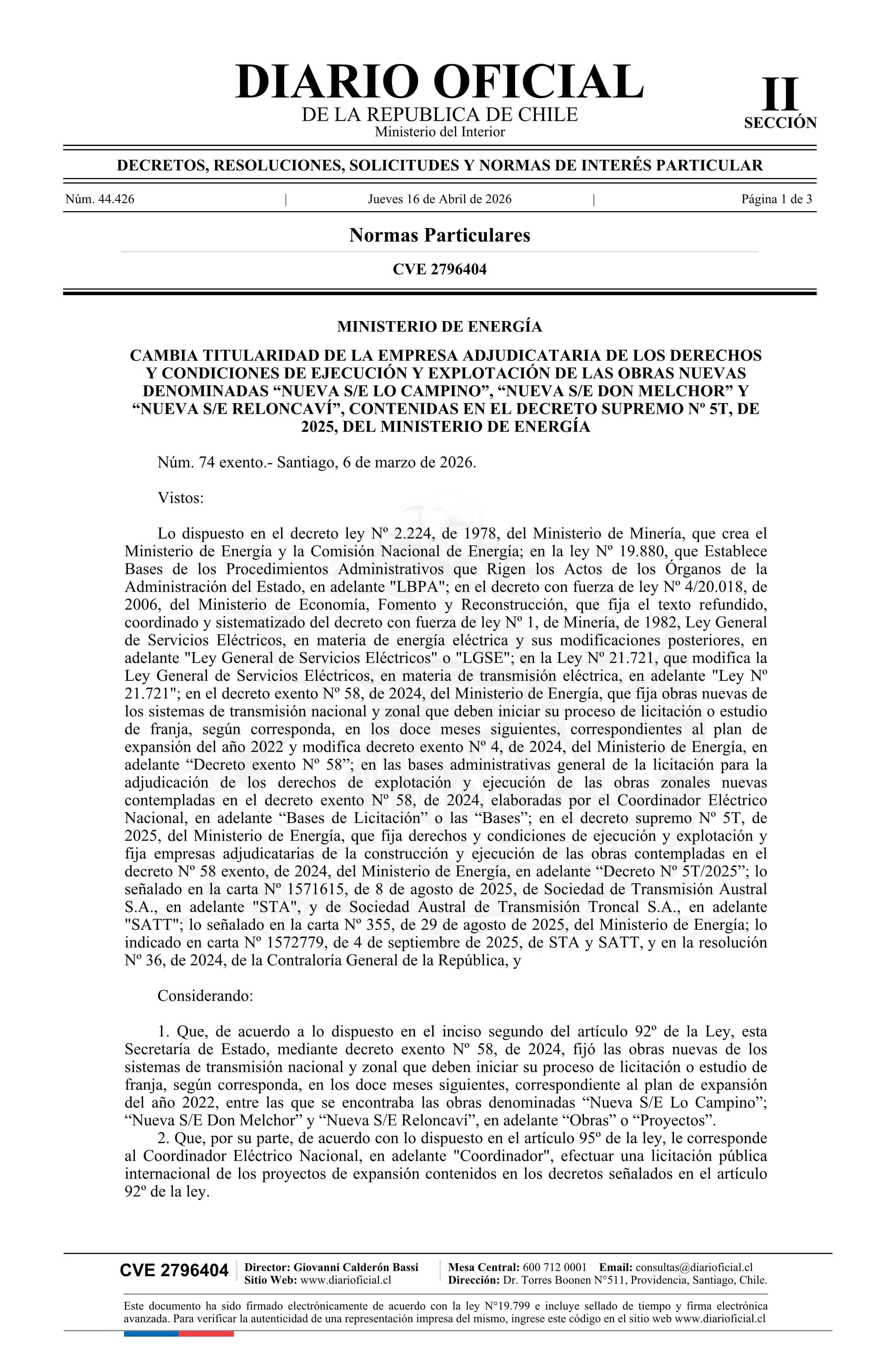 | Título: | Decreto exento número 74, de 2026.- Cambia titularidad de la empresa adjudicataria de los derechos y condiciones de ejecución y explotación de las obras nuevas denominadas Nueva S/E Lo Campino, Nueva S/E Don Melchor y Nueva S/E Reloncaví, contenidas en el decreto Nº 5T, de 2025 |