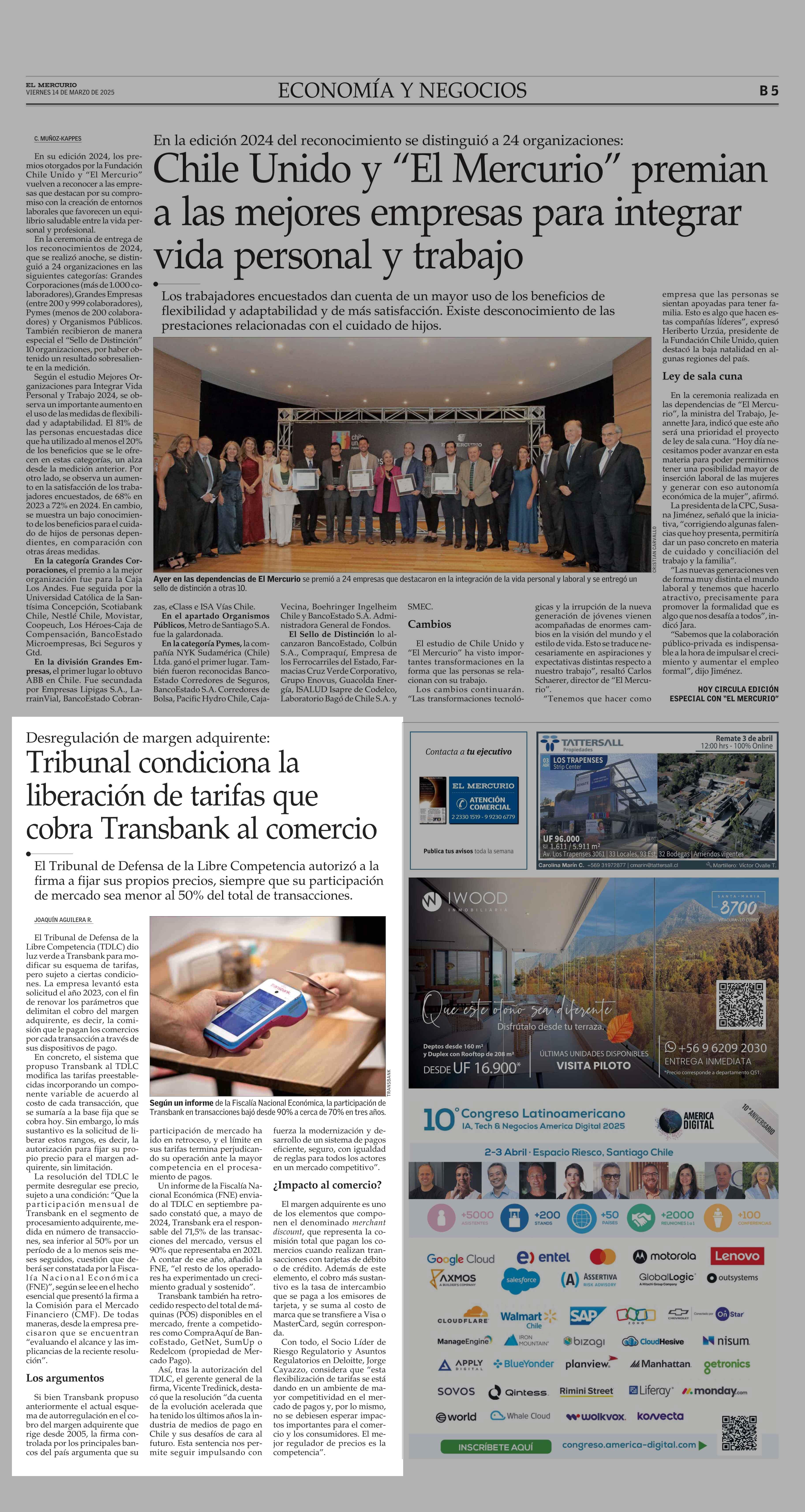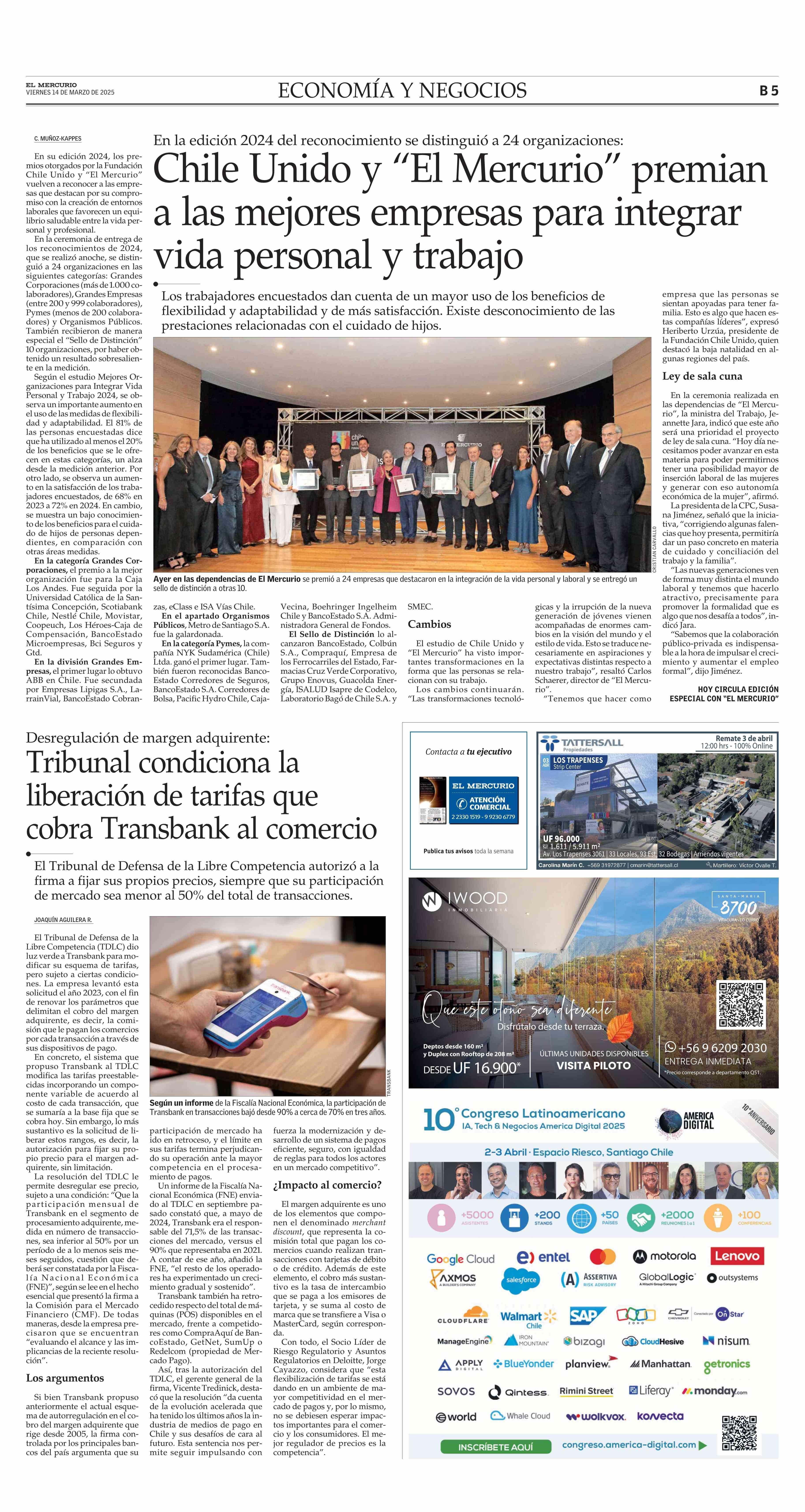 Tribunal condiciona la liberación de tarifas que cobra Transbank al comercio 14-03-2025 El Mercurio |