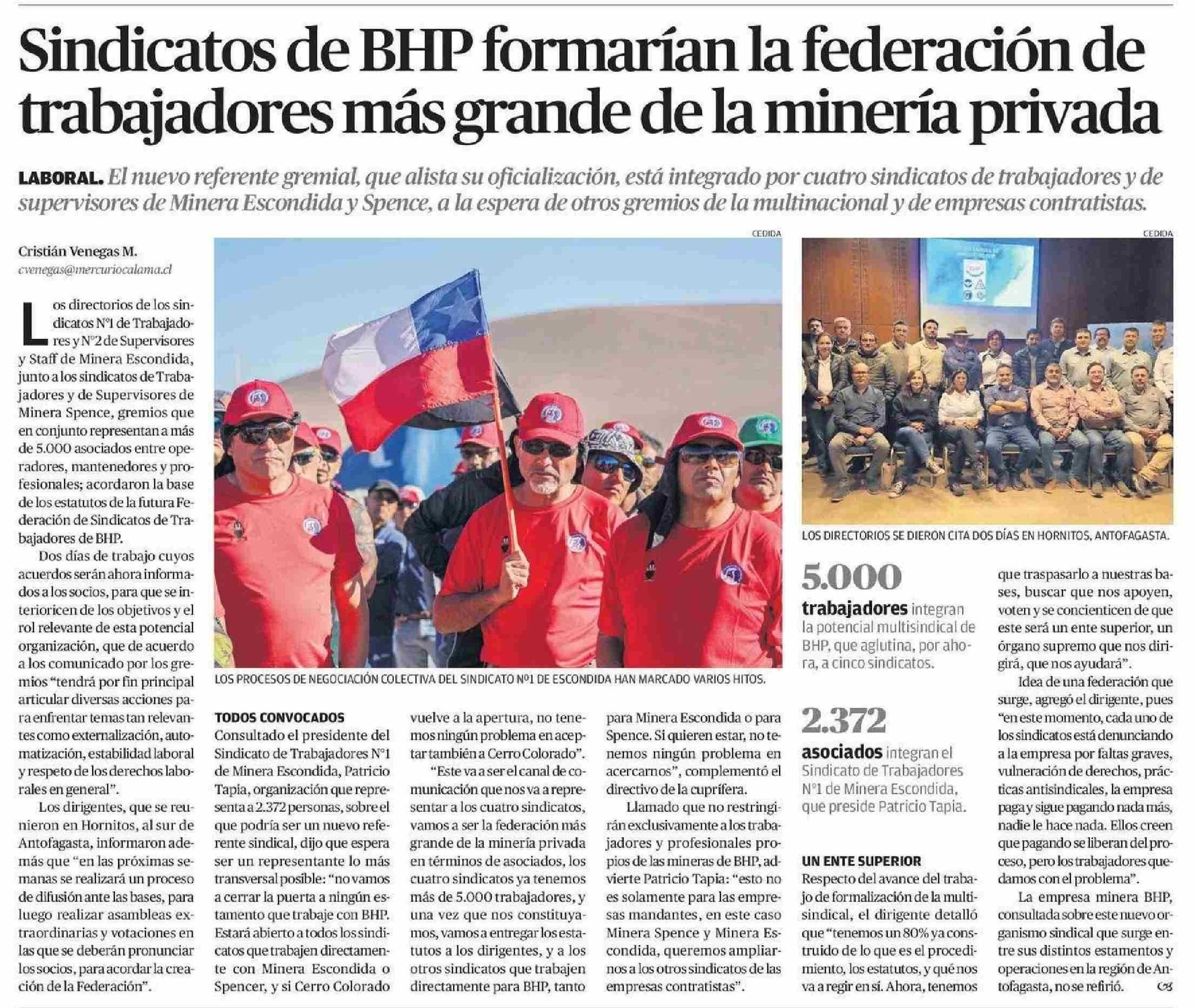 Sindicatos de BHP formarían la federación de trabajadores más grande de la minería privada 30-05-2025 El Mercurio de Calama |