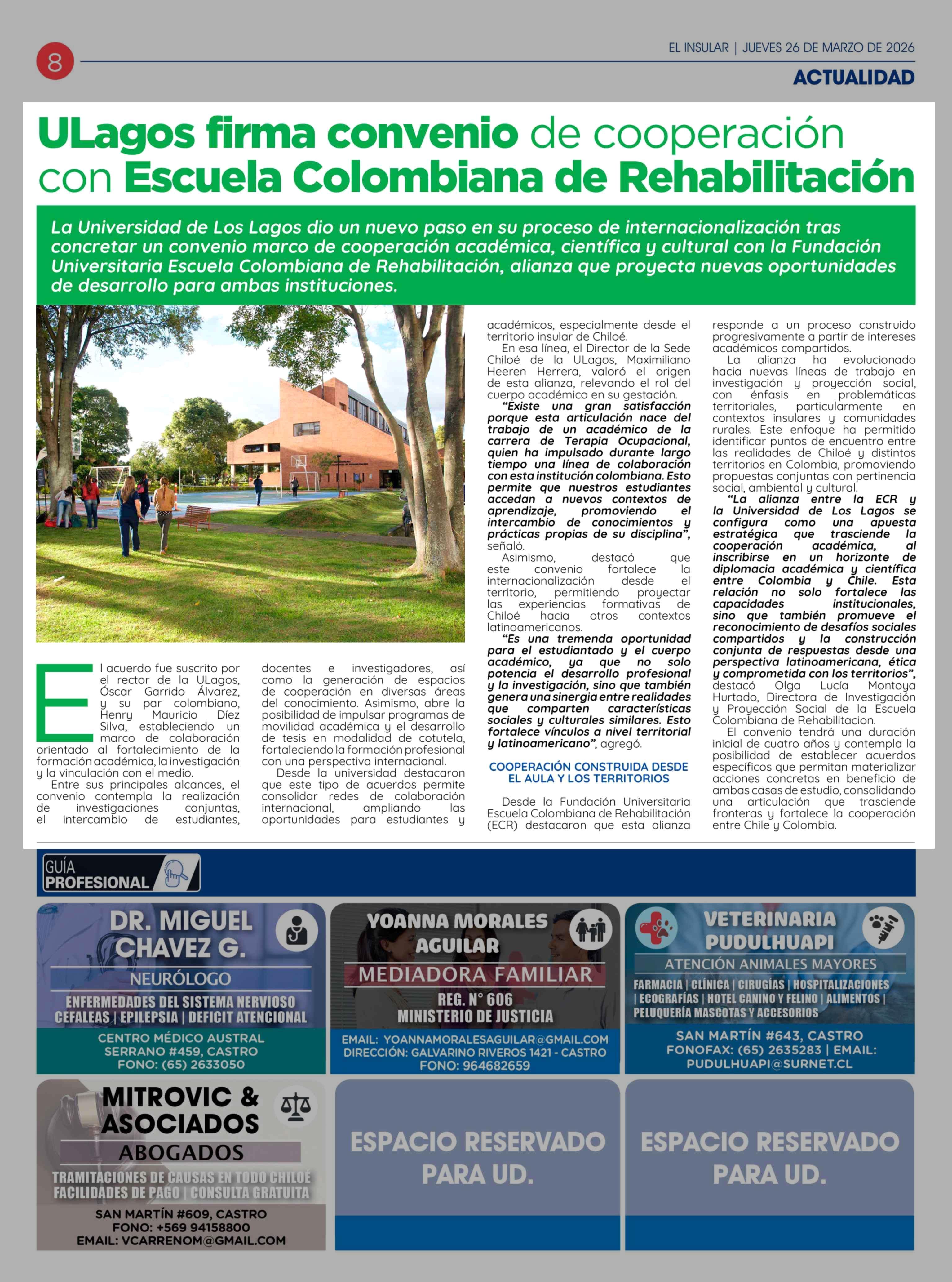 ULagos firma convenio de cooperación con Escuela Colombiana de Rehabilitación 26-03-2026 El Insular |