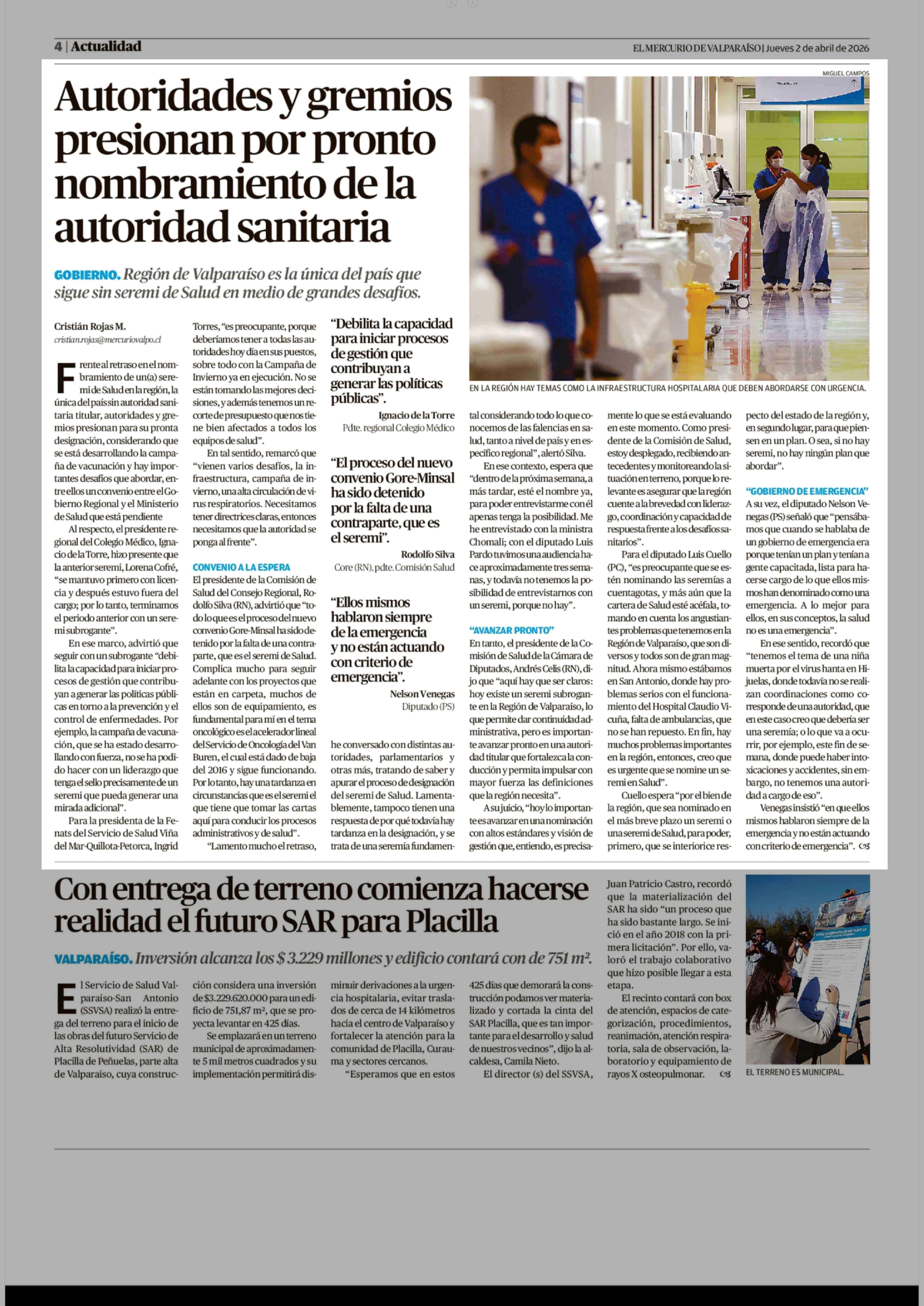Autoridades y gremios presionan por pronto nombramiento de la autoridad sanitaria 02-04-2026 El Mercurio de Valparaíso |