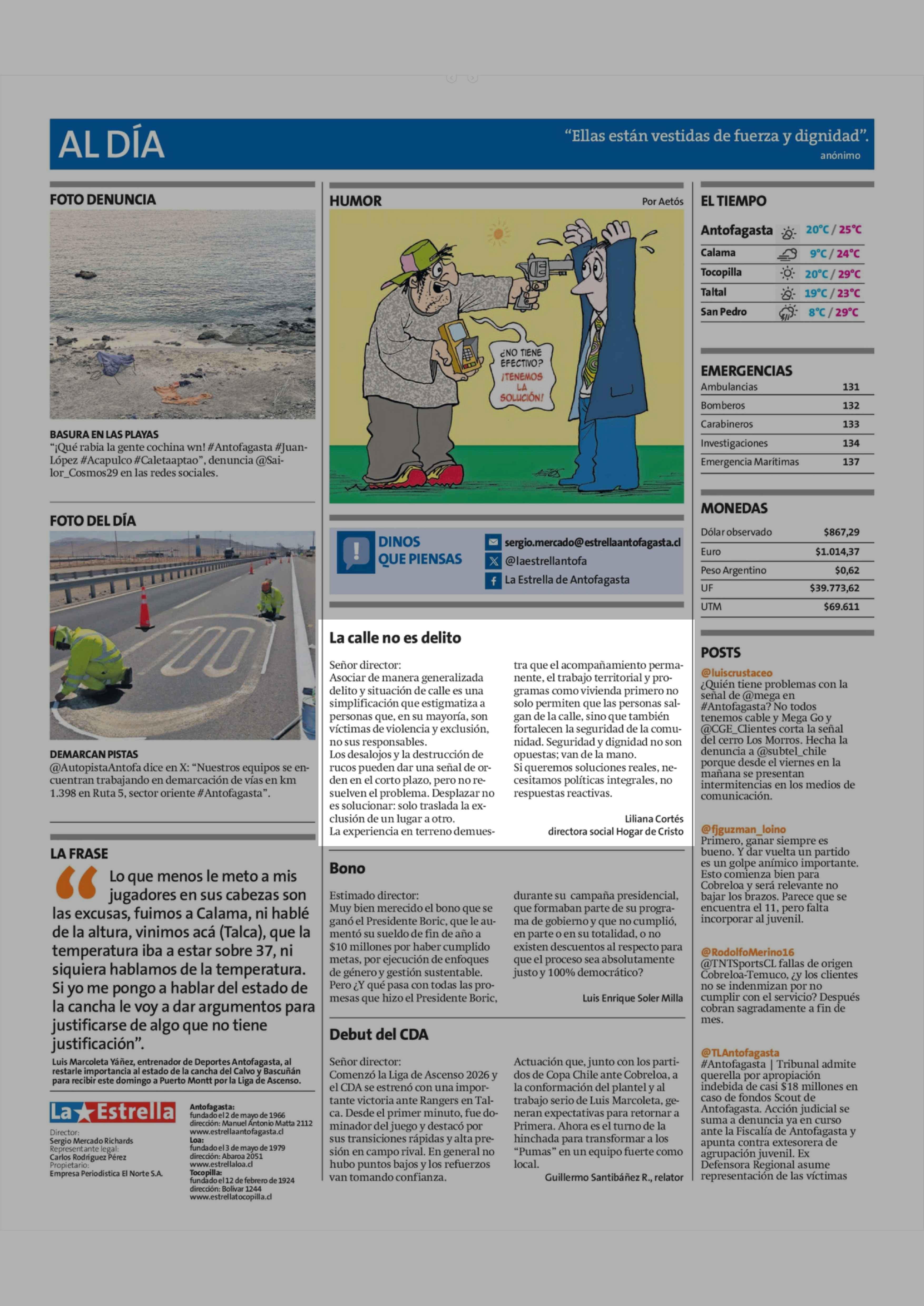 Columnas de Opinión: La calle no es delito 25-02-2026 La Estrella de Antofagasta |