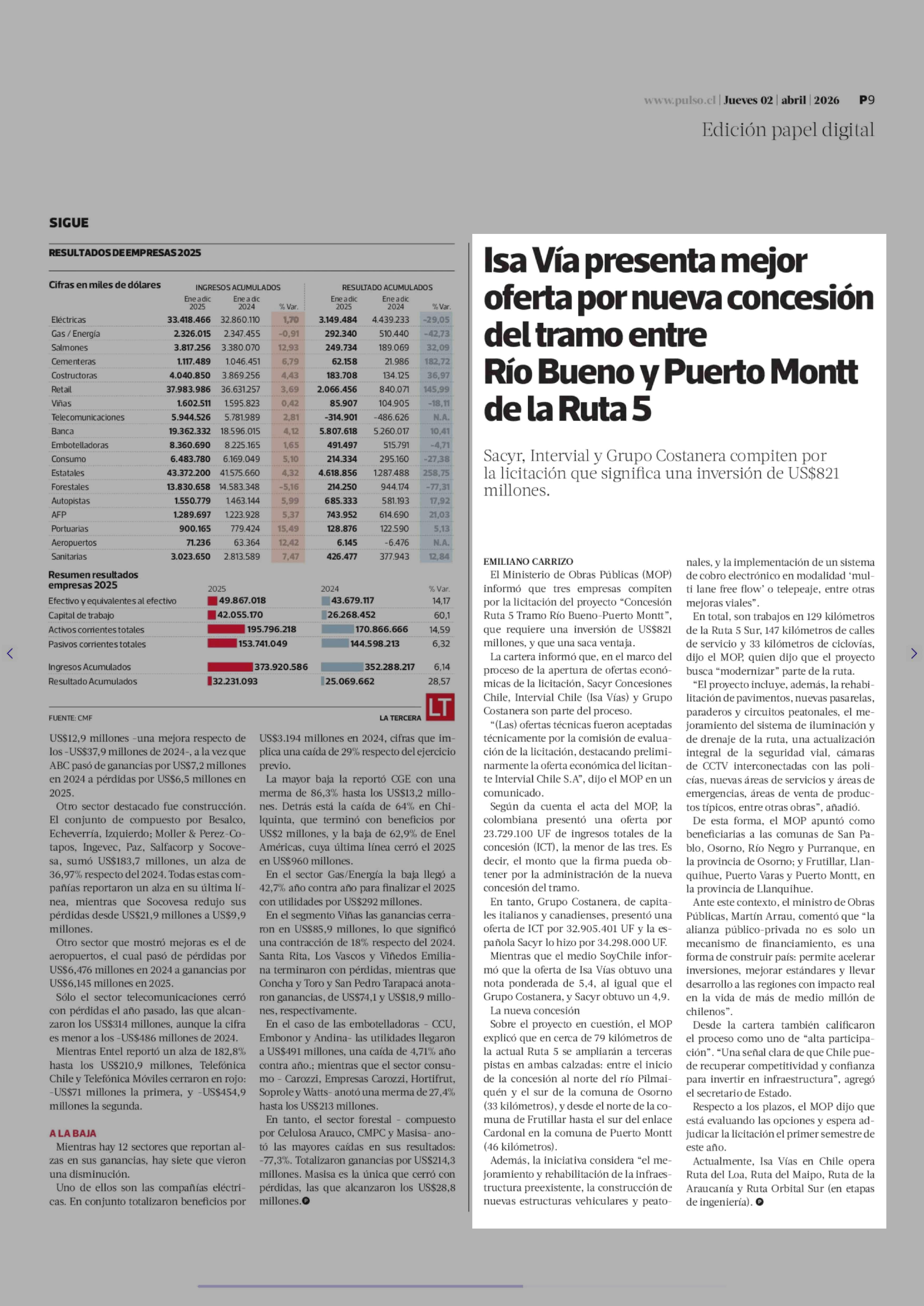 Isa Vía presenta mejor oferta por nueva concesión del tramo entre Río Bueno y Puerto Montt de la Ruta 5 02-04-2026 La Tercera |