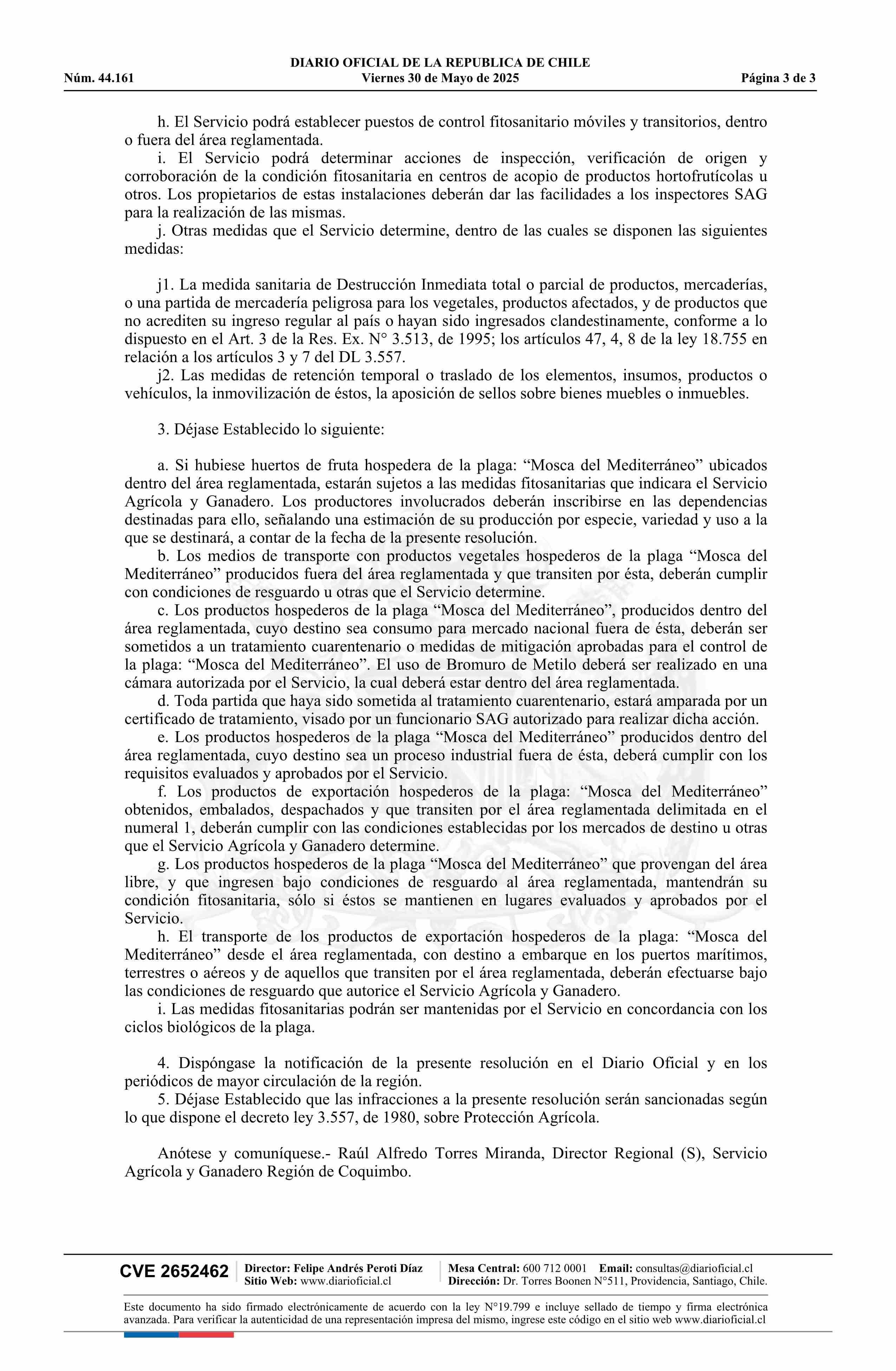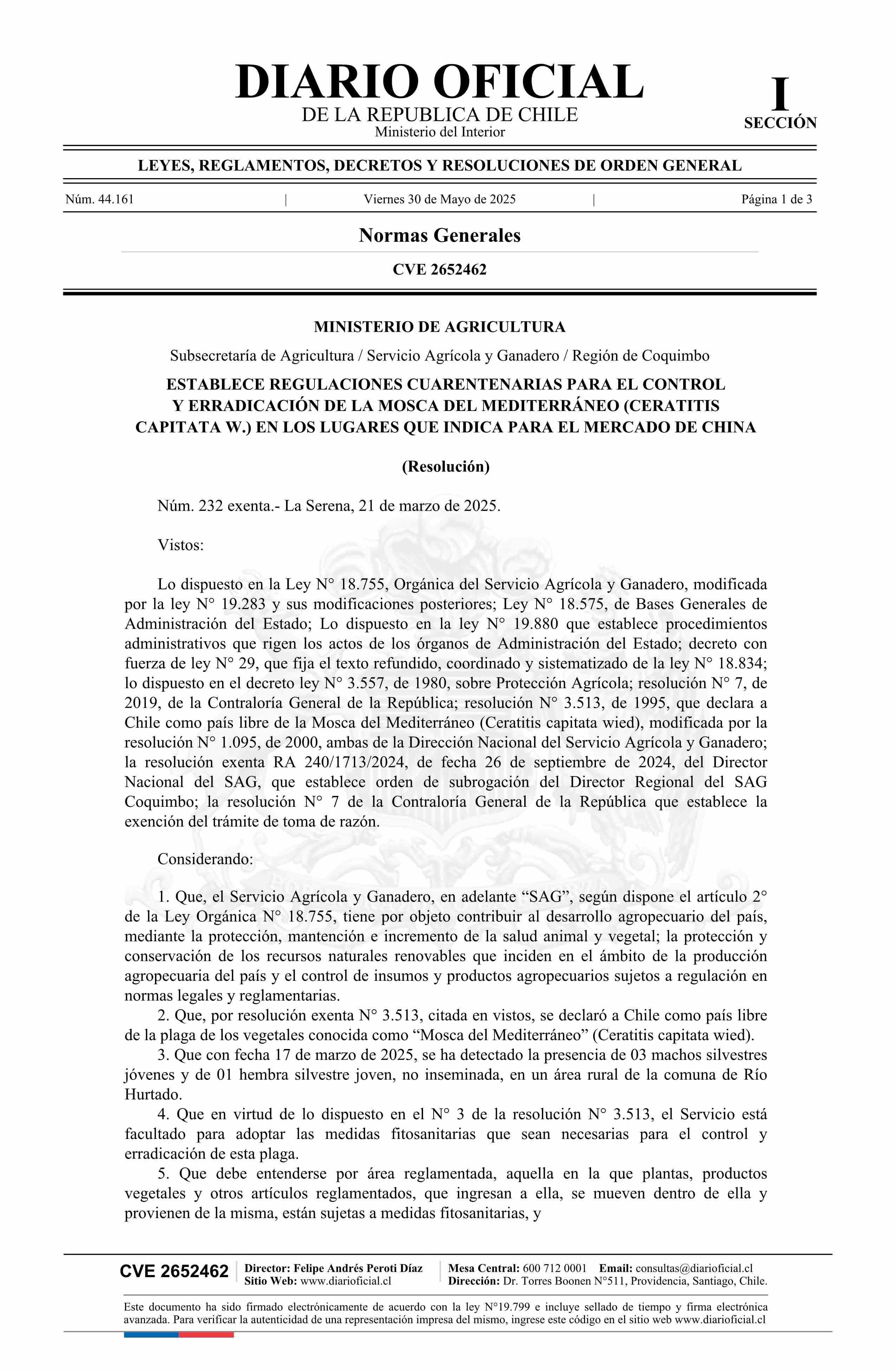 Título: Resolución exenta número 232, de 2025.- Establece regulaciones cuarentenarias para el control y erradicación de la Mosca del Mediterráneo (Ceratitis capitata W.) en los lugares que indica para el mercado de China