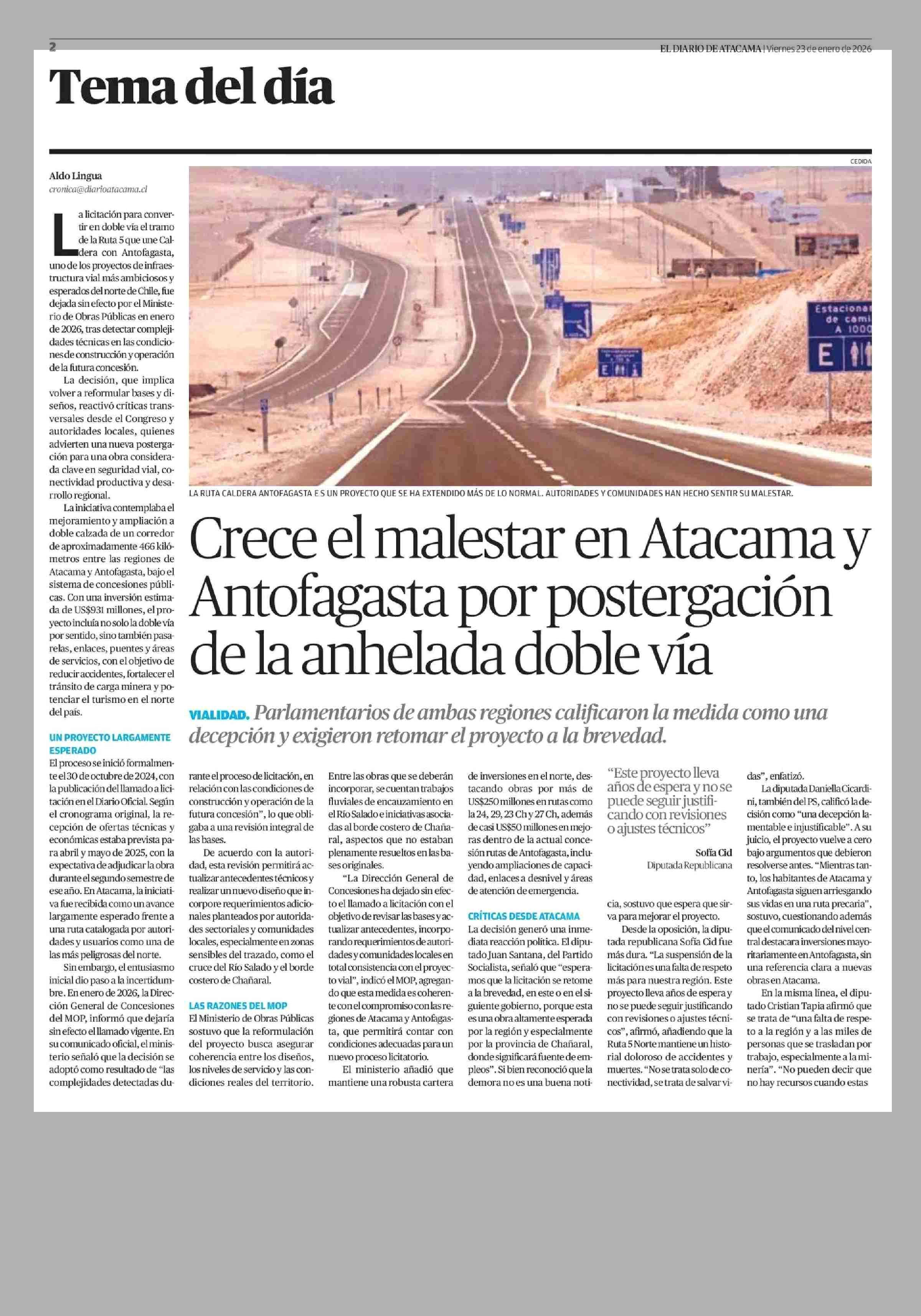 Crece el malestar en Atacama y Antofagasta por postergación de la anhelada doble vía 23-01-2026 El Diario de Atacama |