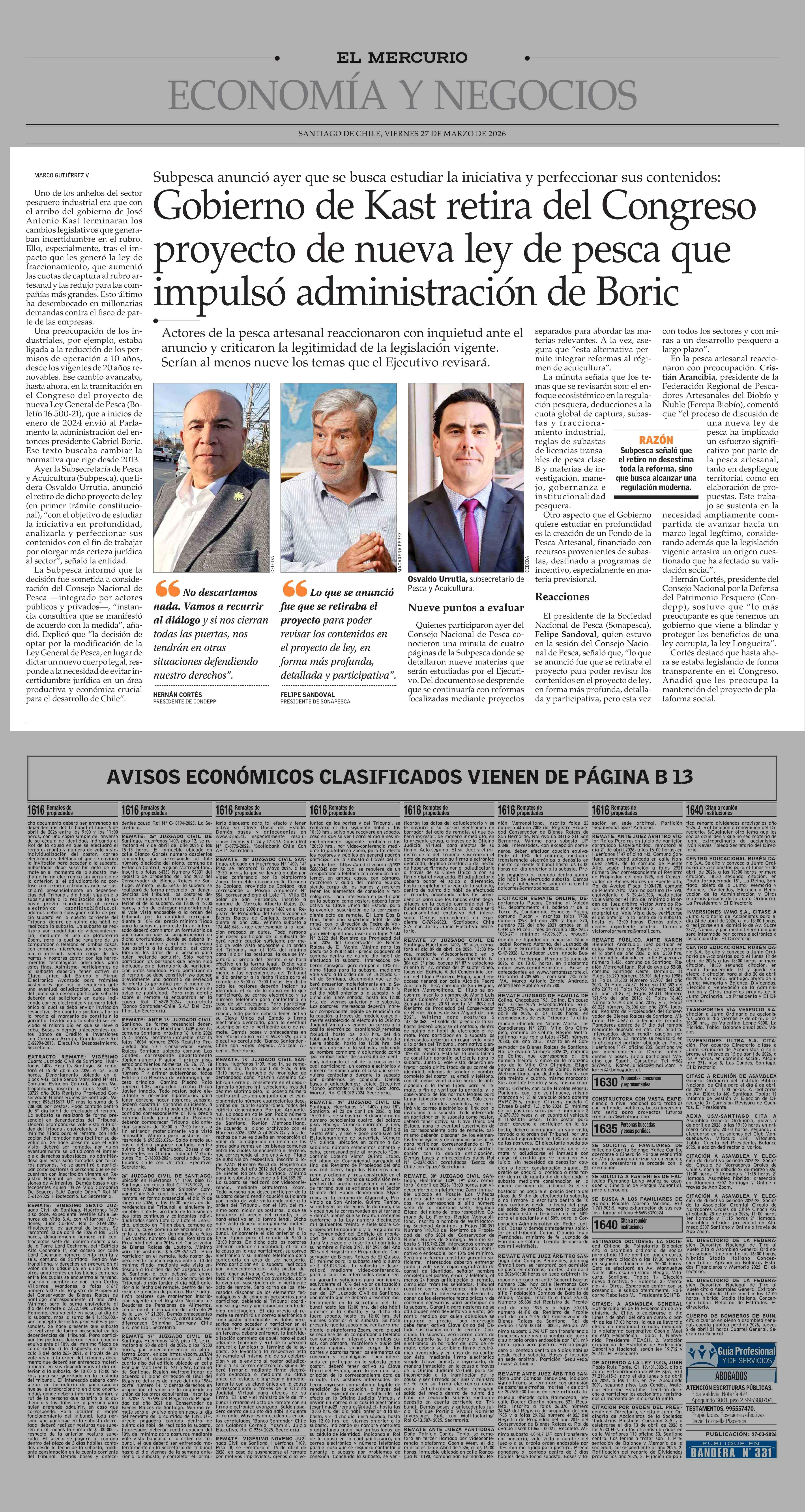 Gobierno de Kast retira del Congreso proyecto de nueva ley de pesca que impulsó administración de Boric 27-03-2026 El Mercurio |