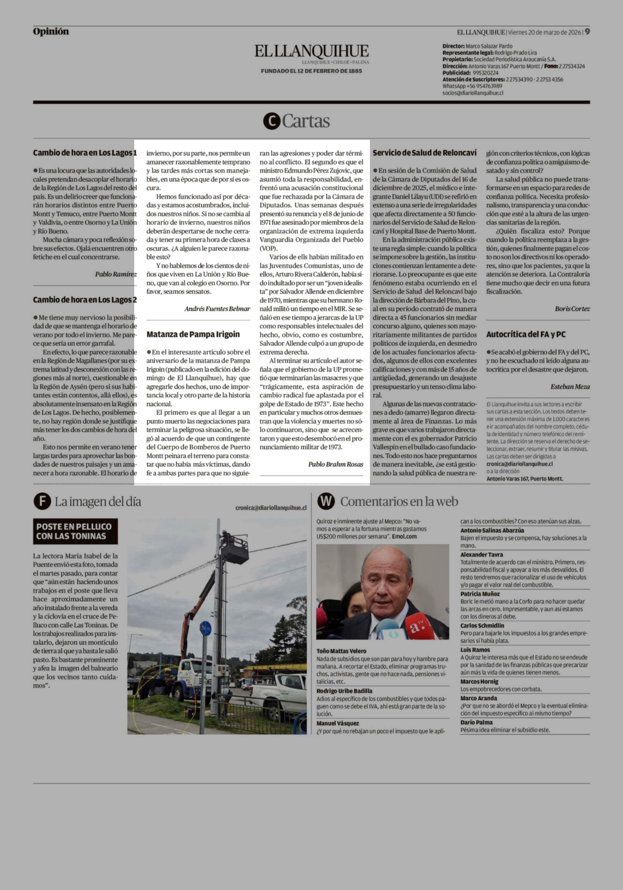 Cartas: Matanza de Pampa Irigoin 20-03-2026 El Llanquihue |