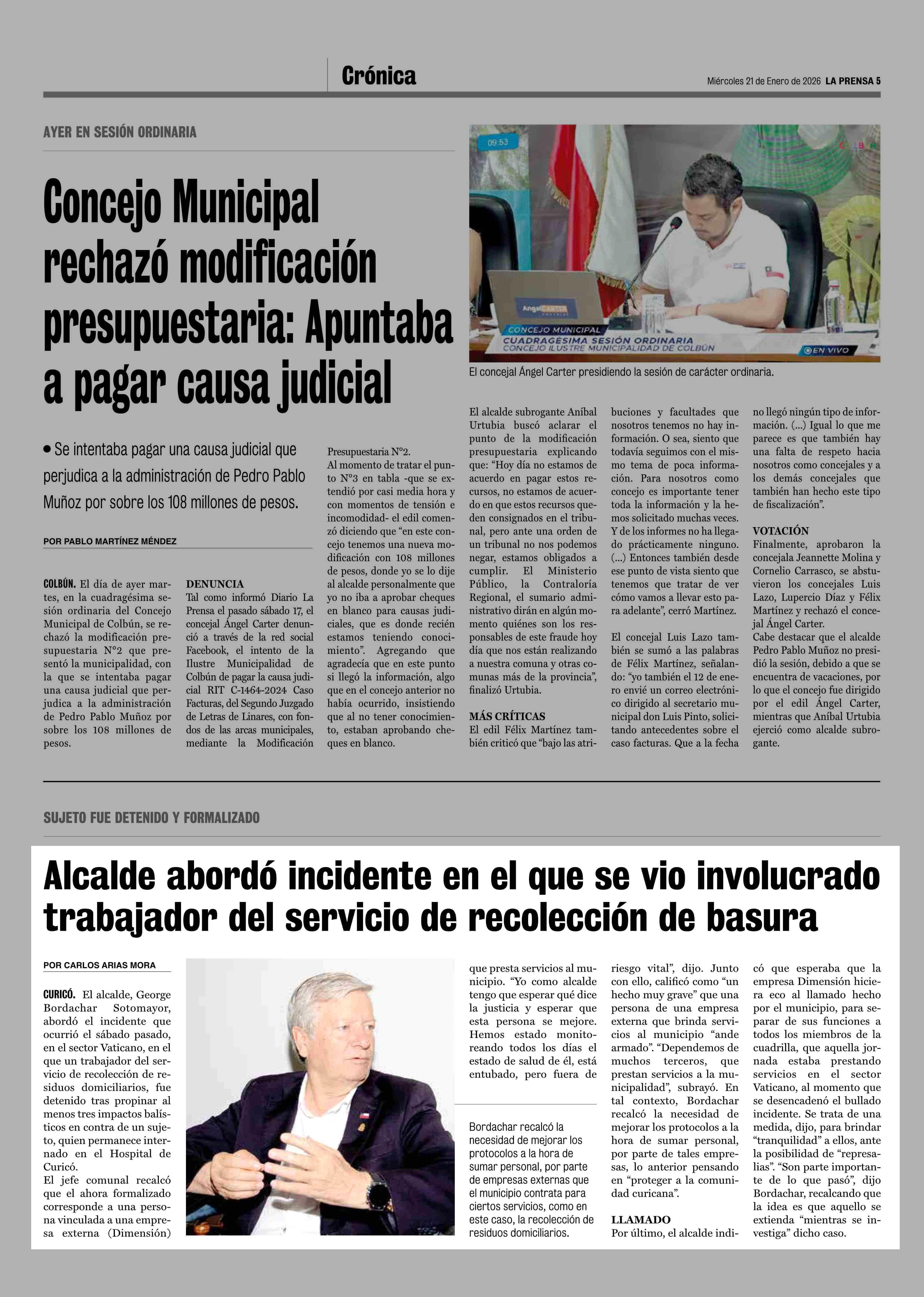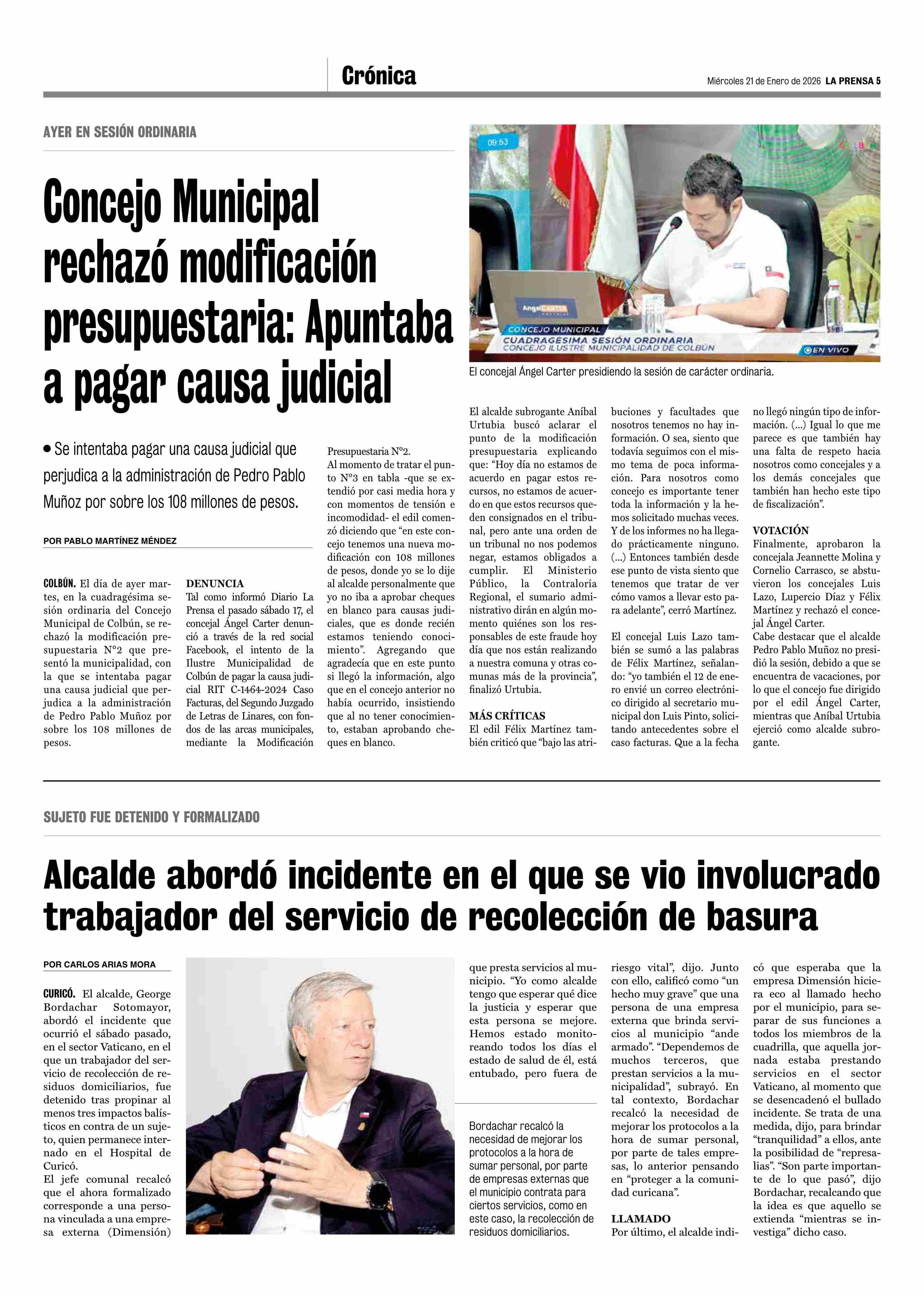 Alcalde abordó incidente en el que se vio involucrado trabajador del servicio de recolección de basura 21-01-2026 La Prensa de Curicó |