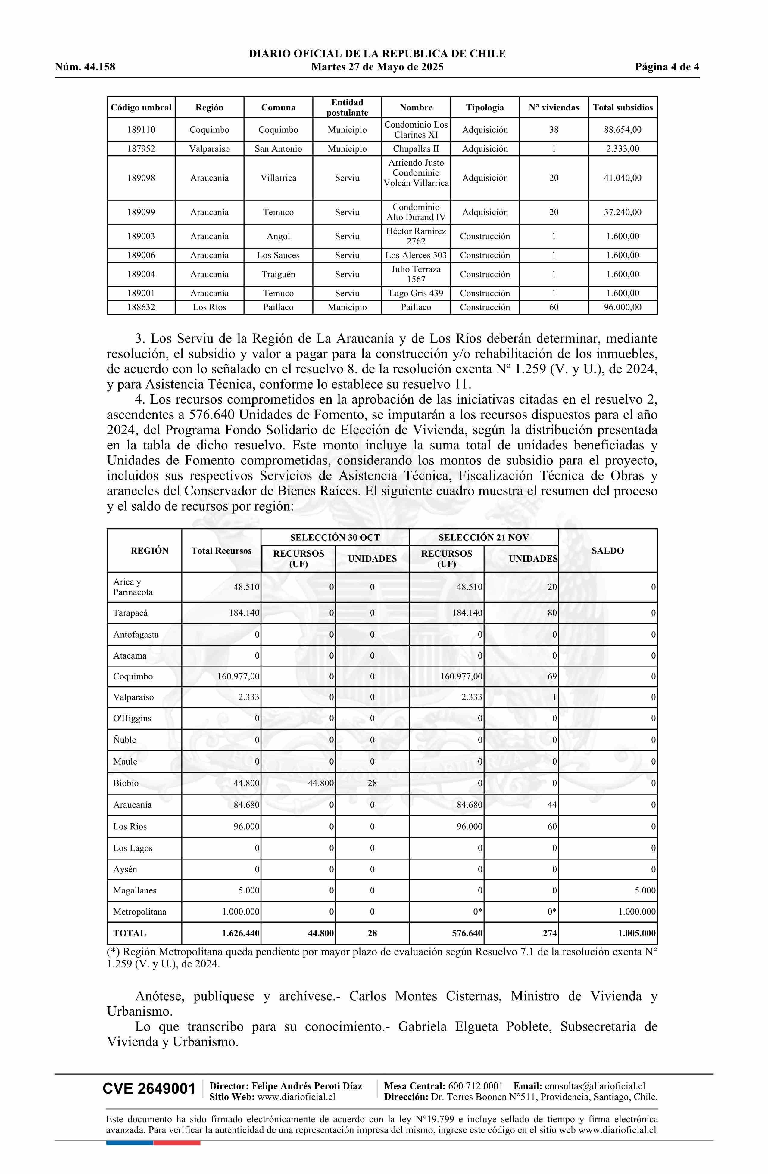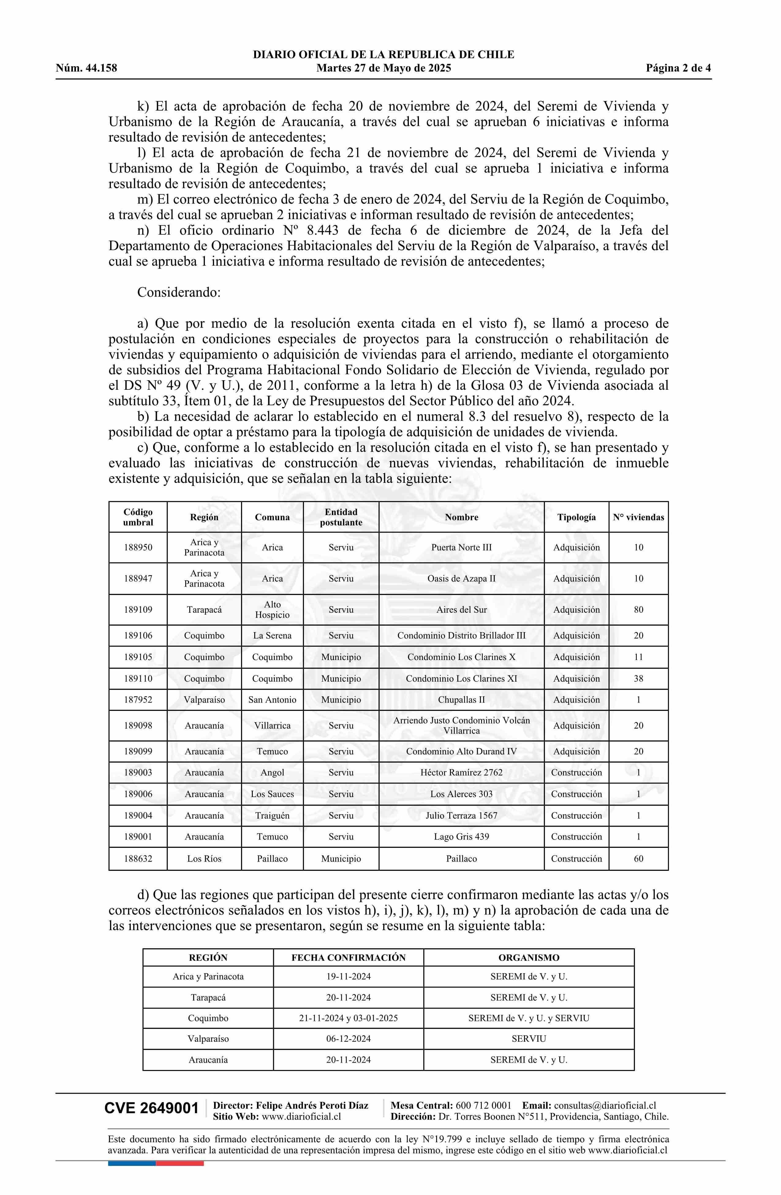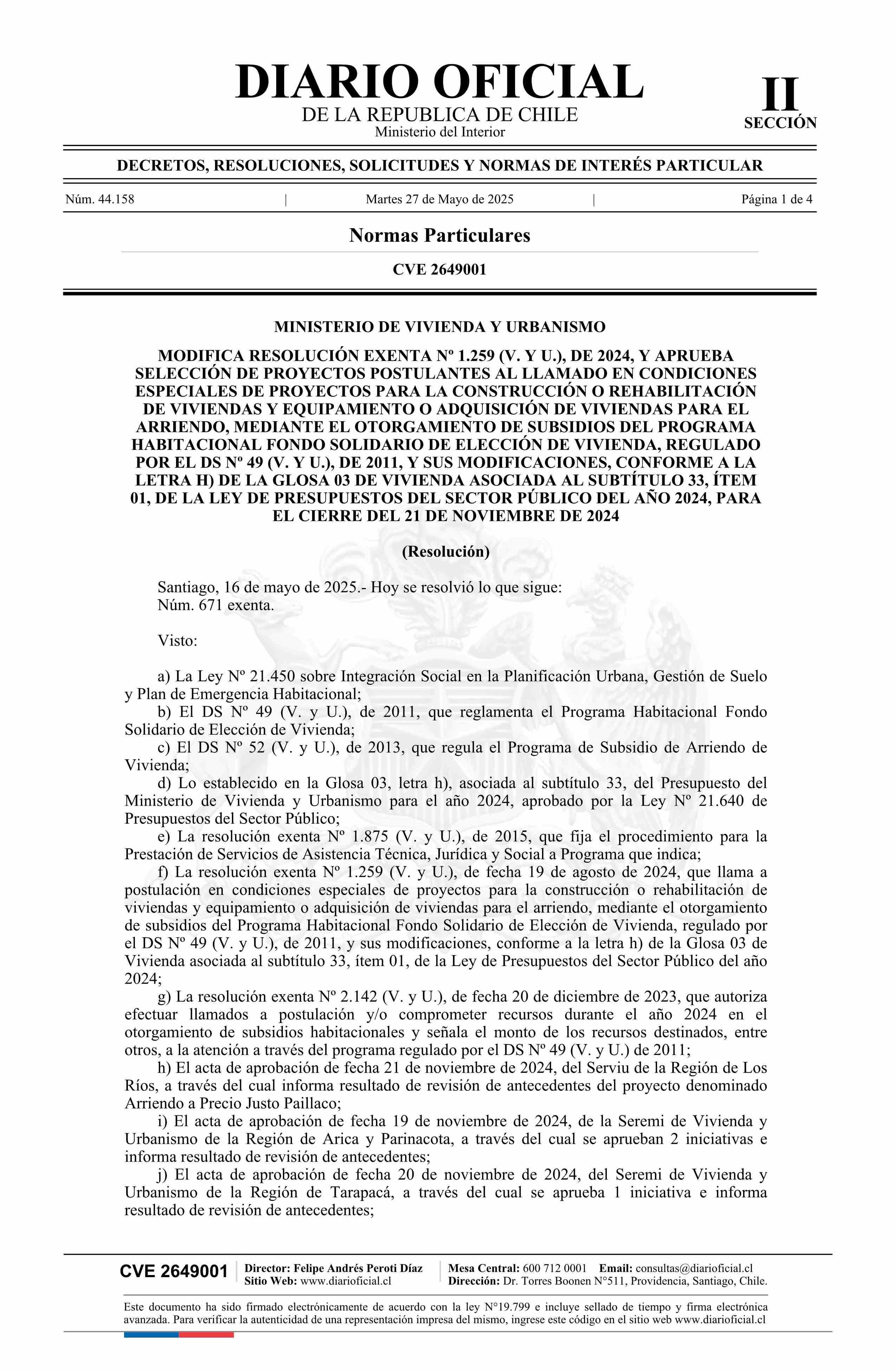 | Título: | Resolución exenta número 671, de 2025.- Modifica resolución Nº 1.259 exenta de 2024, y aprueba selección de proyectos postulantes al llamado en condiciones especiales de proyectos para la construcción o rehabilitación de viviendas y equipamiento o adquisición de viviendas para el arriendo, mediante |