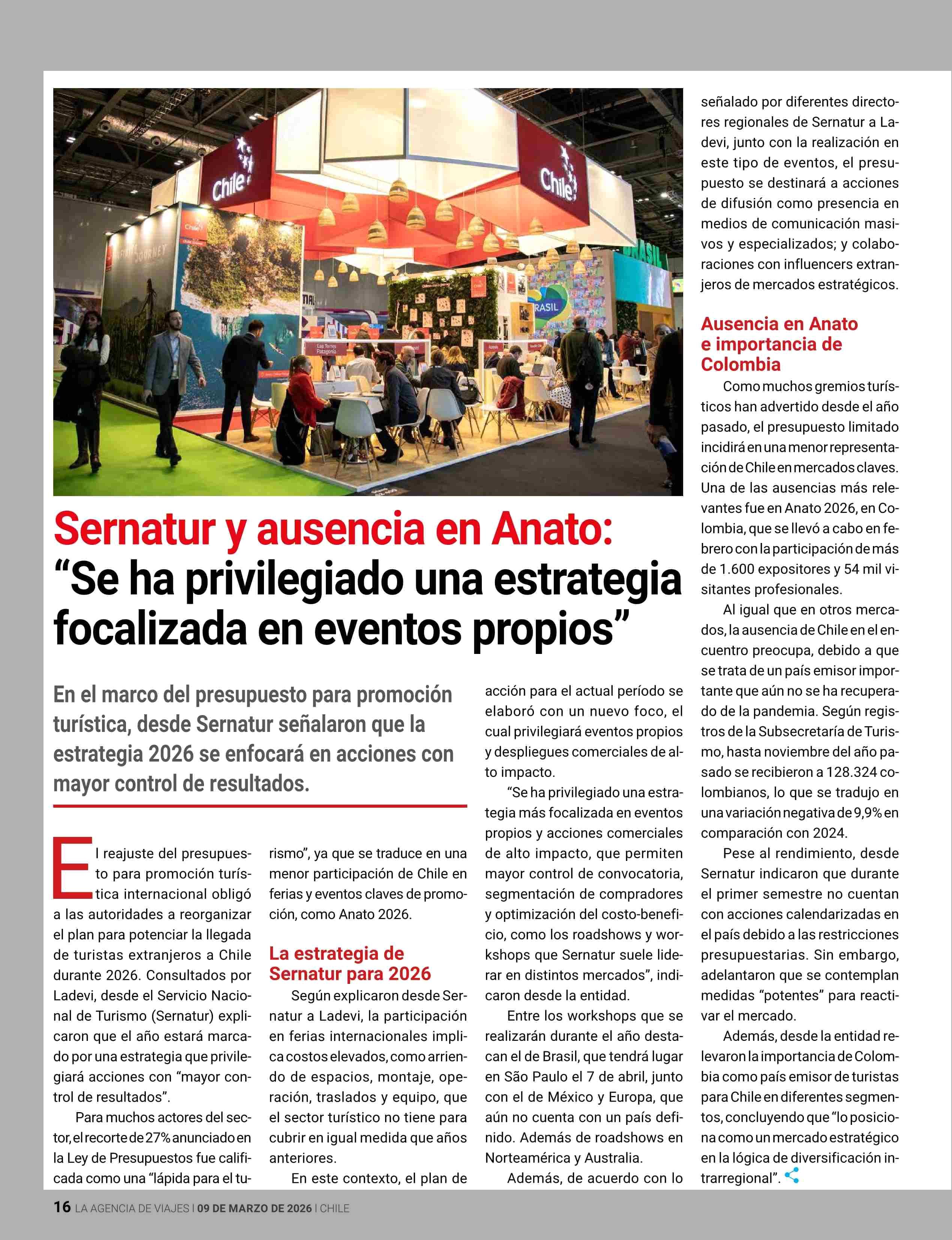 Sernatur y ausencia en Anato: “Se ha privilegiado una estrategia focalizada en eventos propios” 09-03-2026 Revista La Agencia de Viajes |