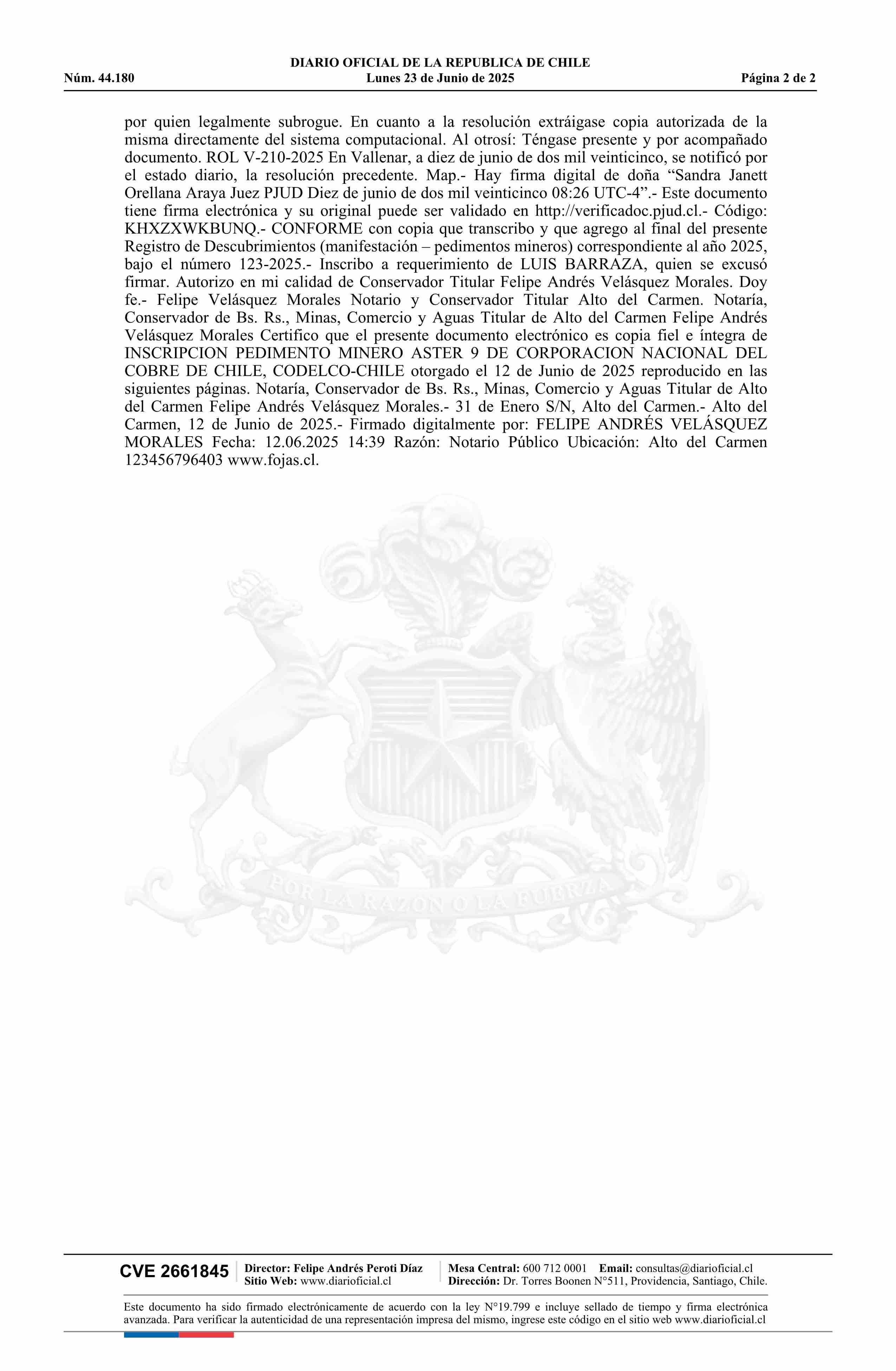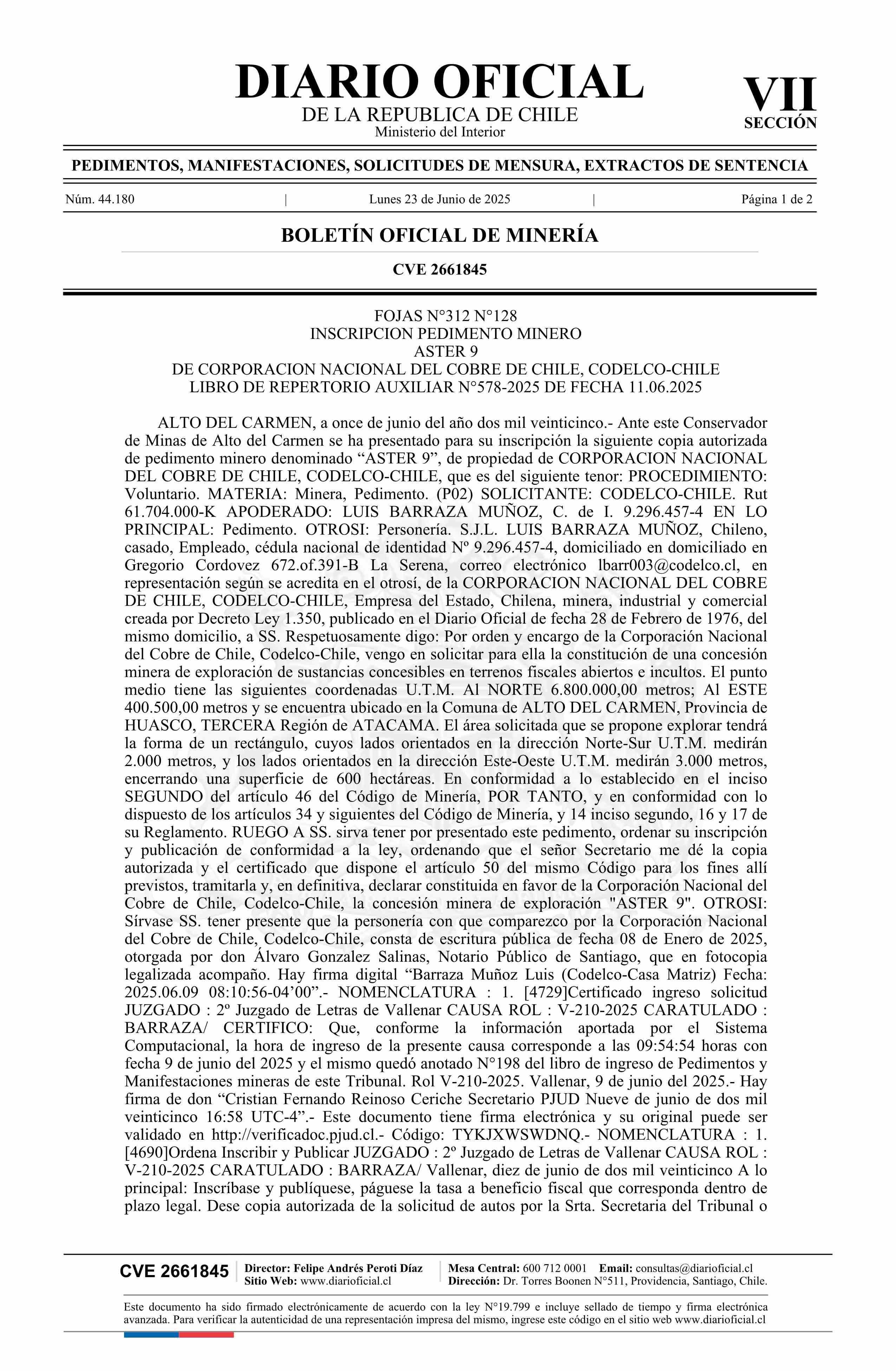 ASTER 9 / Corporación Nacional del Cobre de Chile 23-06-2025 DIARIO OFICIAL CHILE - BOLETÍN OFICIAL DE MINERÍA |
