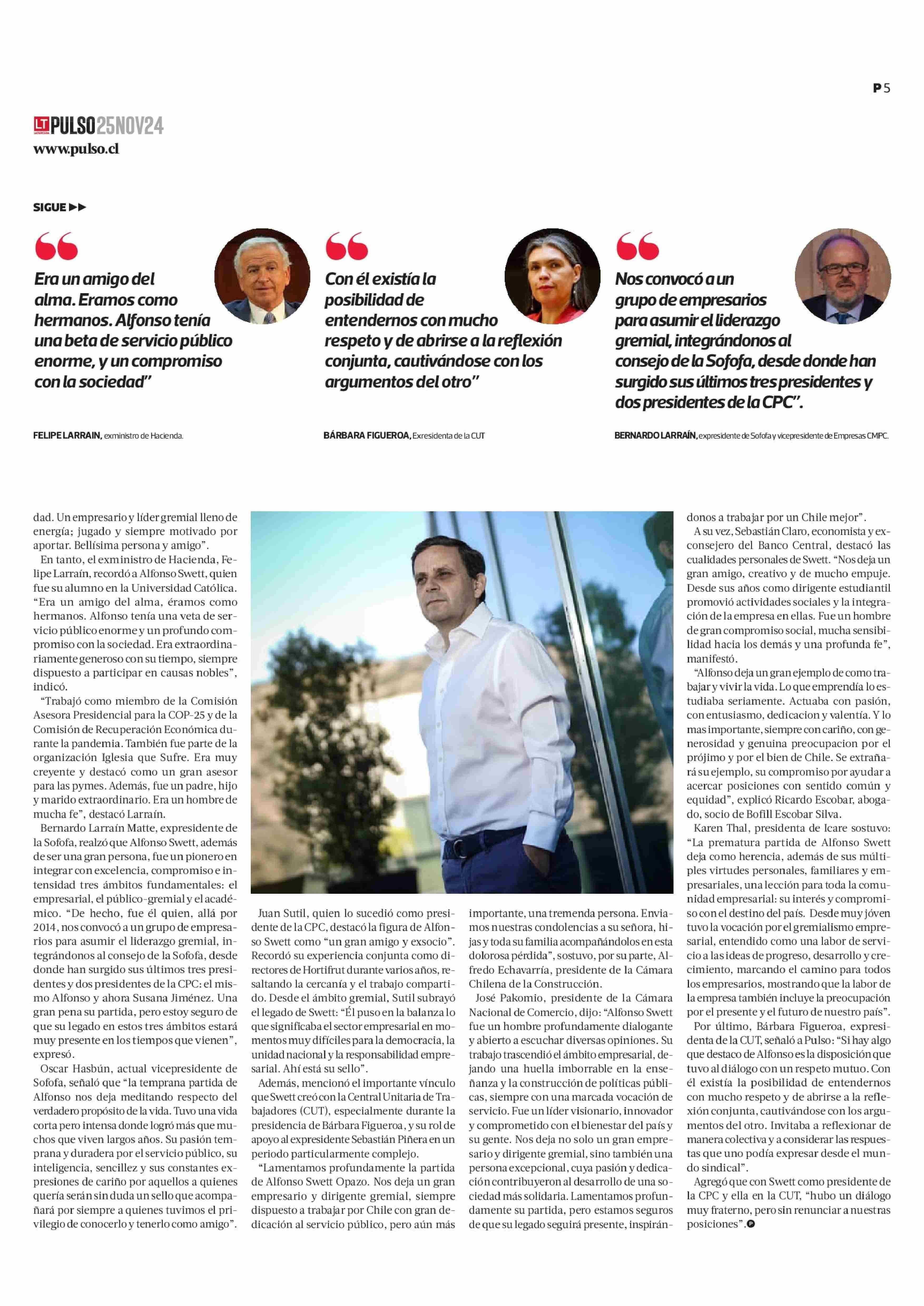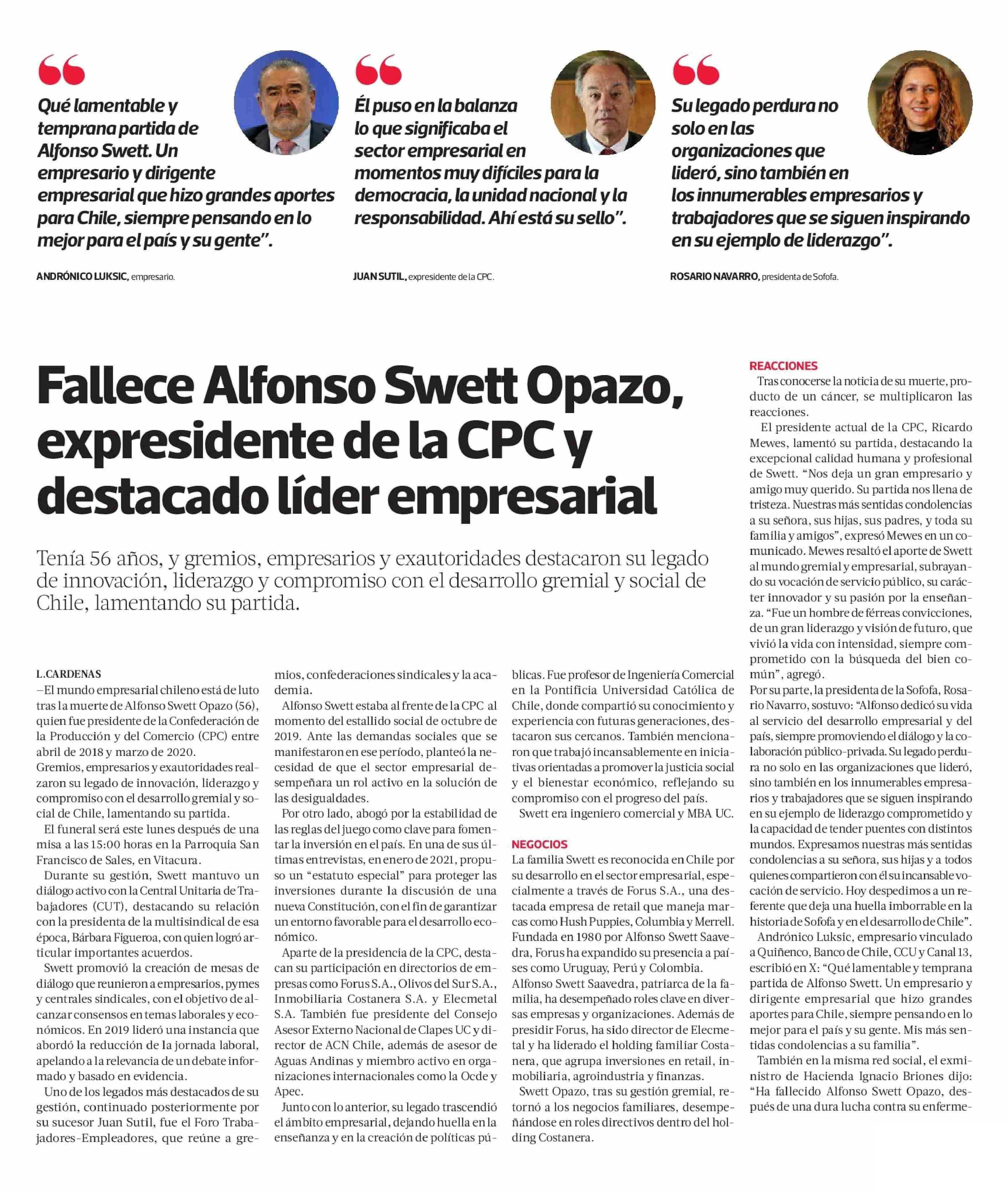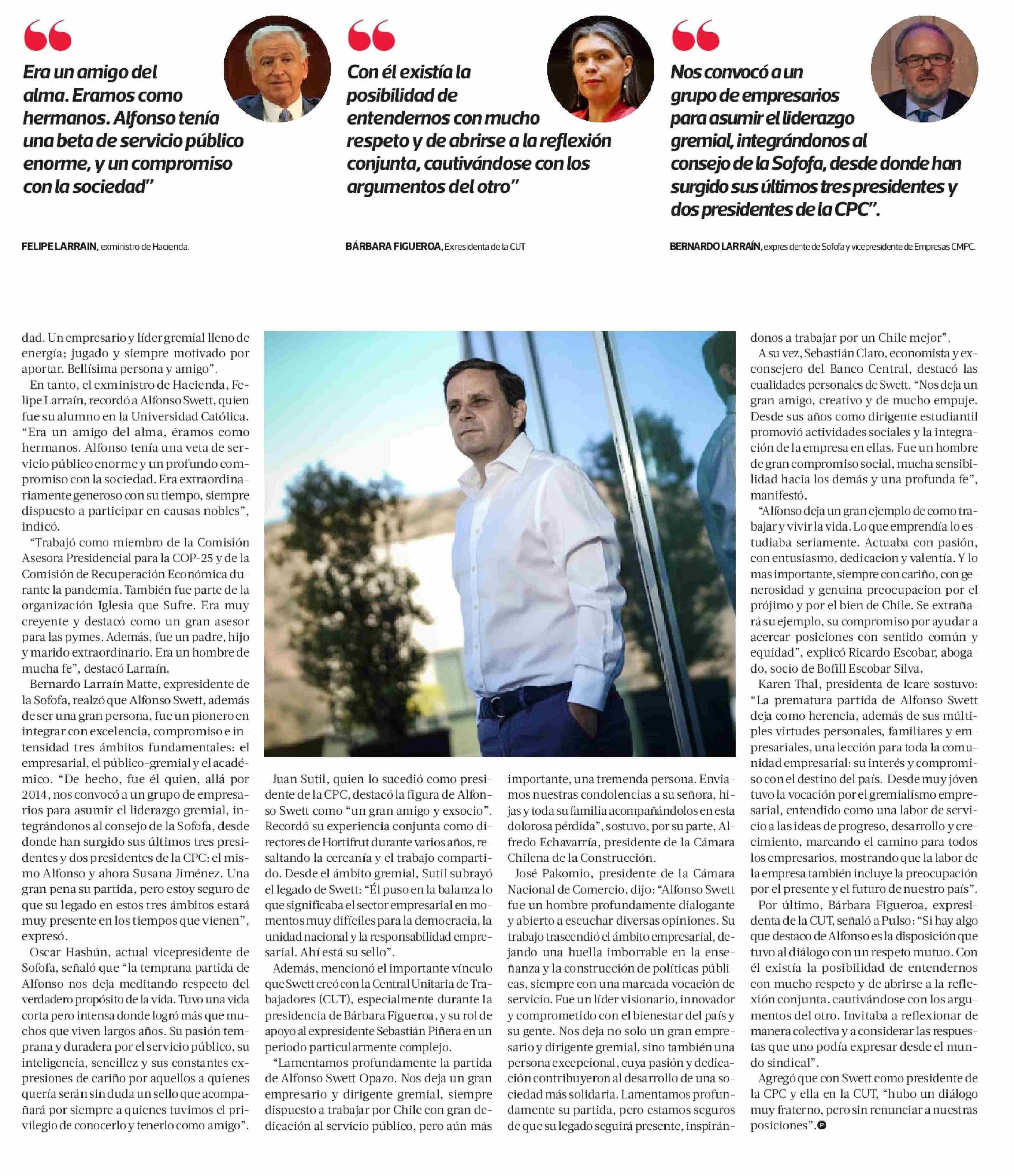 Fallece Alfonso Swett Opazo, expresidente de la CPC y destacado lider empresarial 25-11-2024 La Tercera |