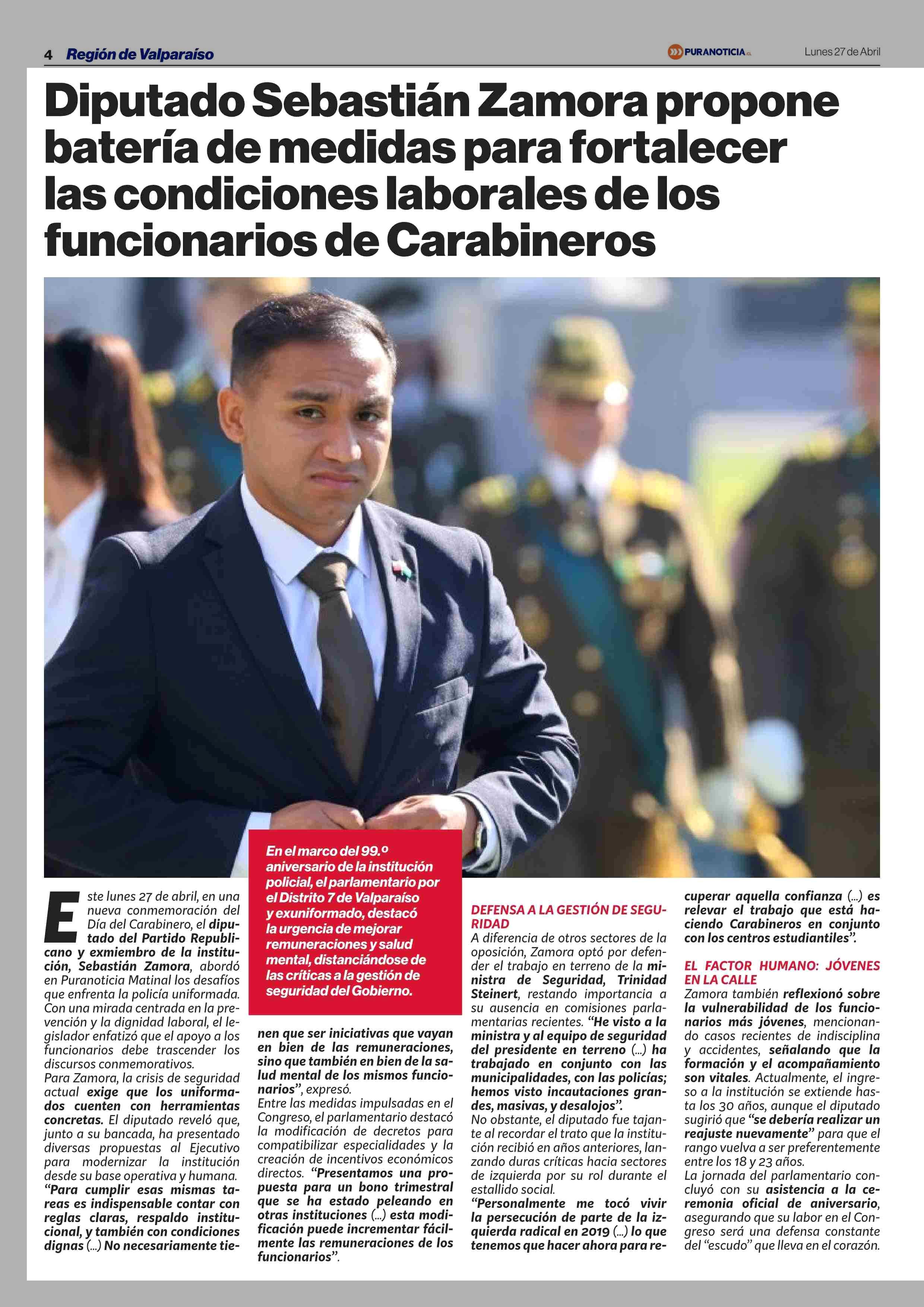 Diputado Sebastián Zamora propone batería de medidas para fortalecer las condiciones laborales de los funcionarios de Carabineros 27-04-2026 Puranoticia.cl |