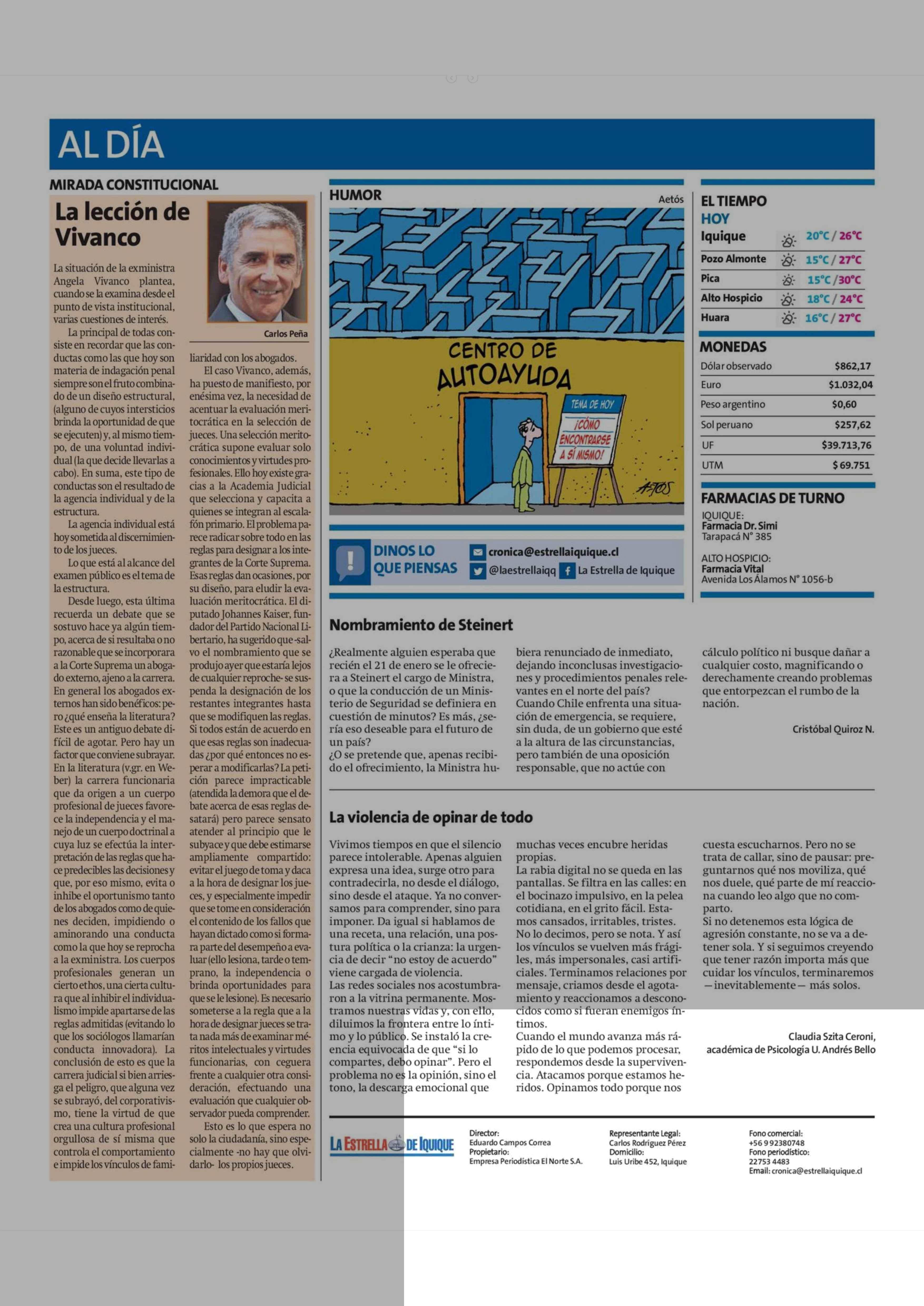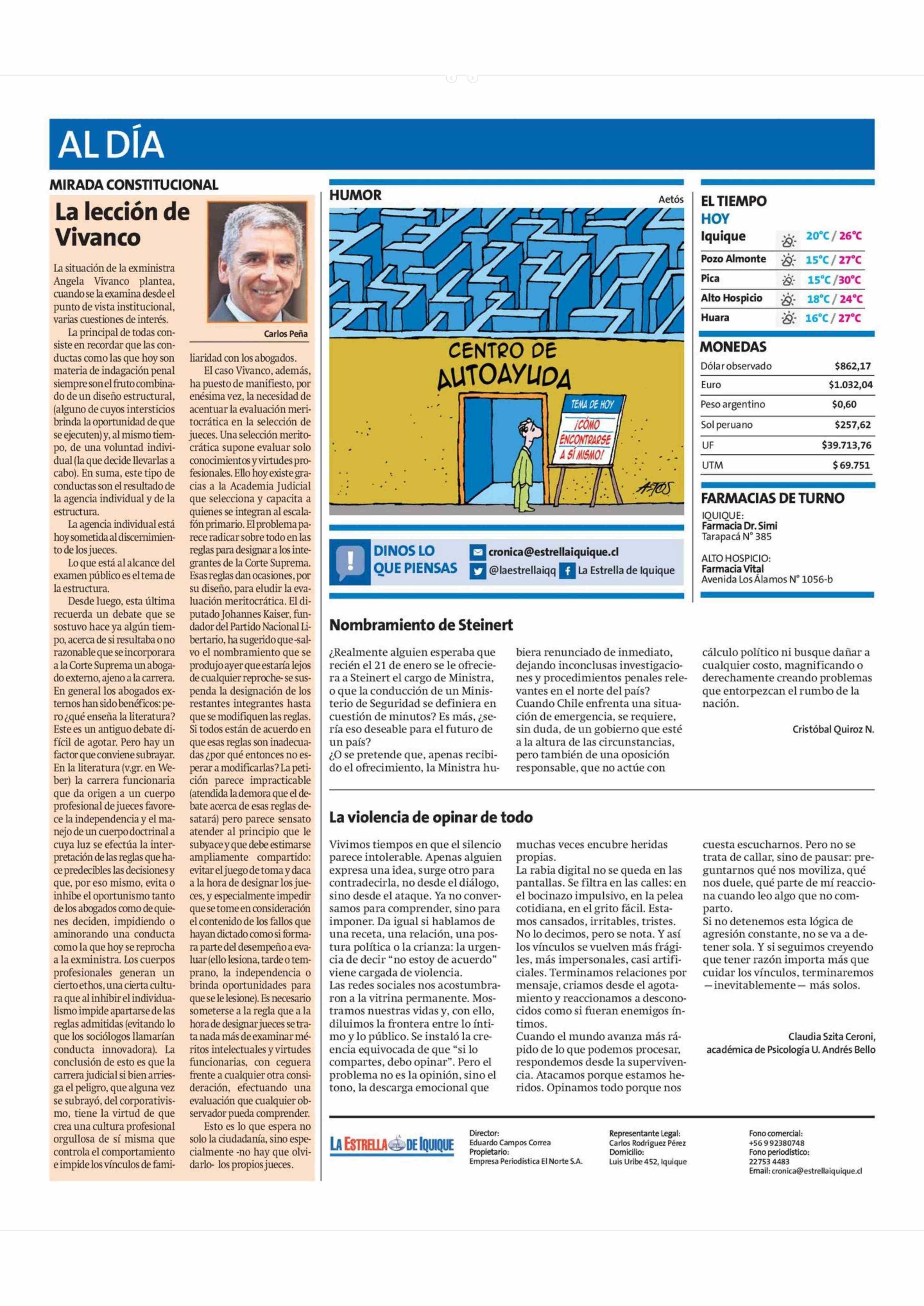 Cartas: La violencia de opinar de todo 28-01-2026 La Estrella de Iquique |