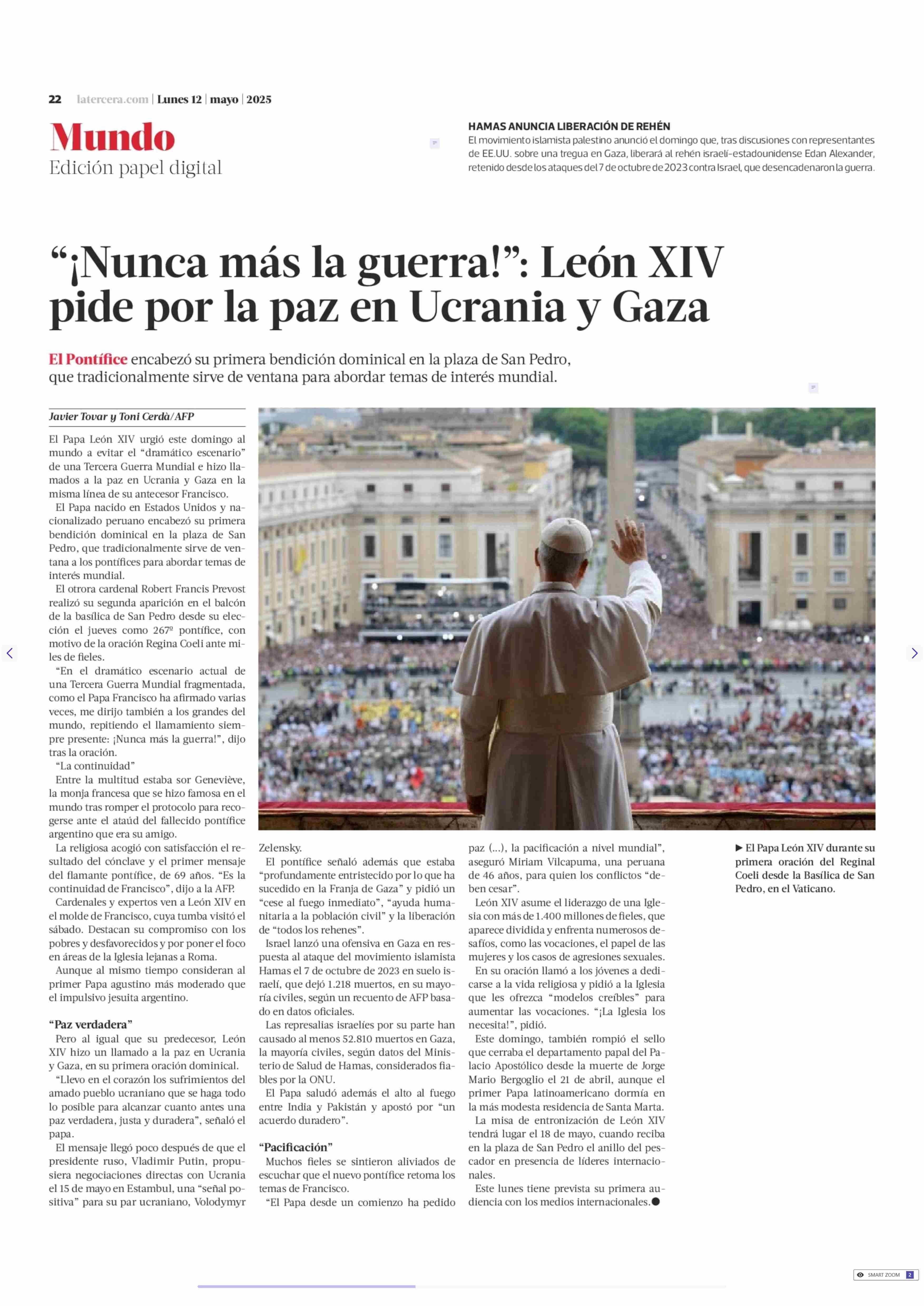 “¡Nunca más la guerra!”: León XIV pide por la paz en Ucrania y Gaza 12-05-2025 La Tercera |
