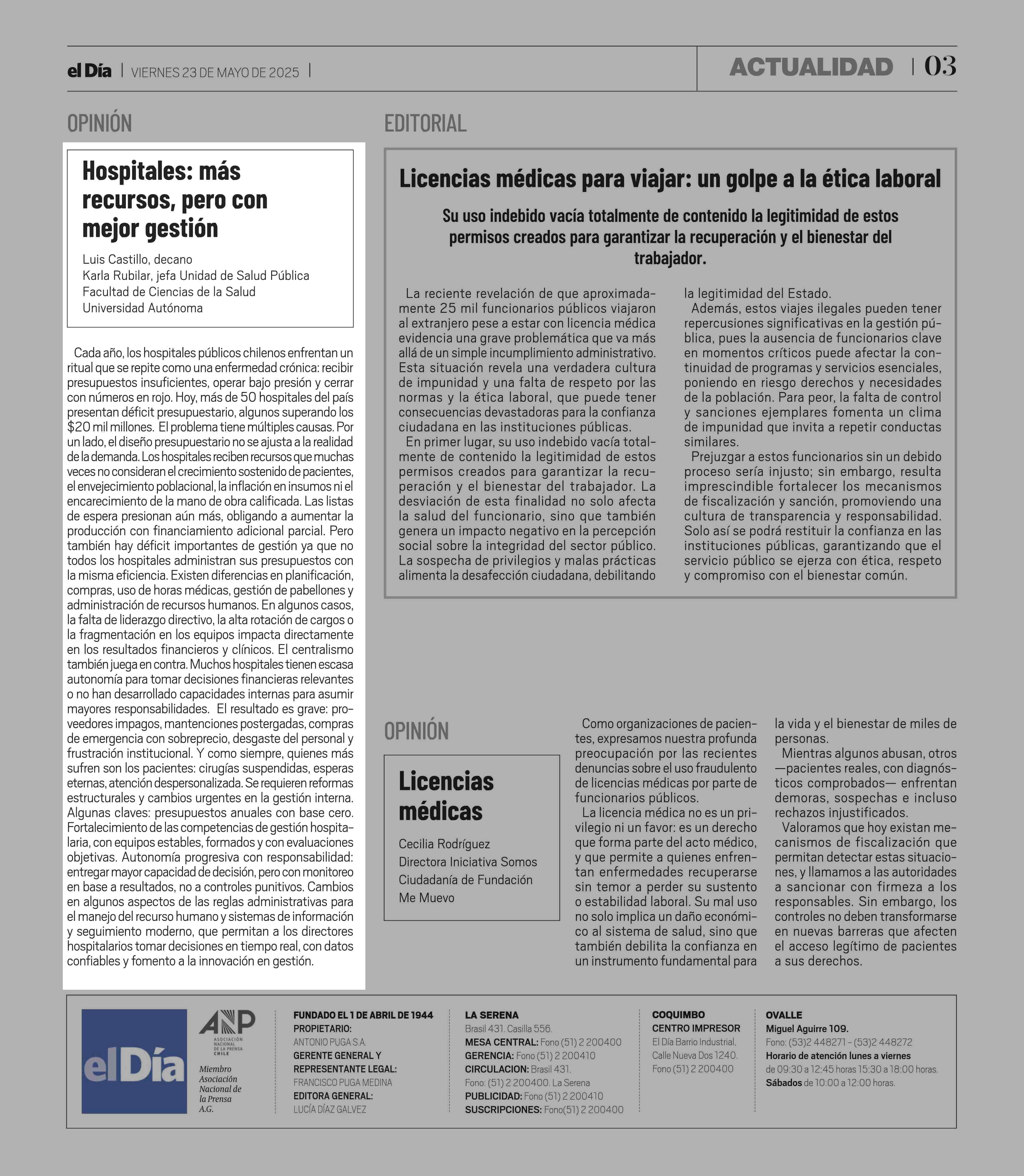 COLUMNAS DE OPINIÓN: Hospitales: más recursos, pero con mejor gestión 23-05-2025 El Día |