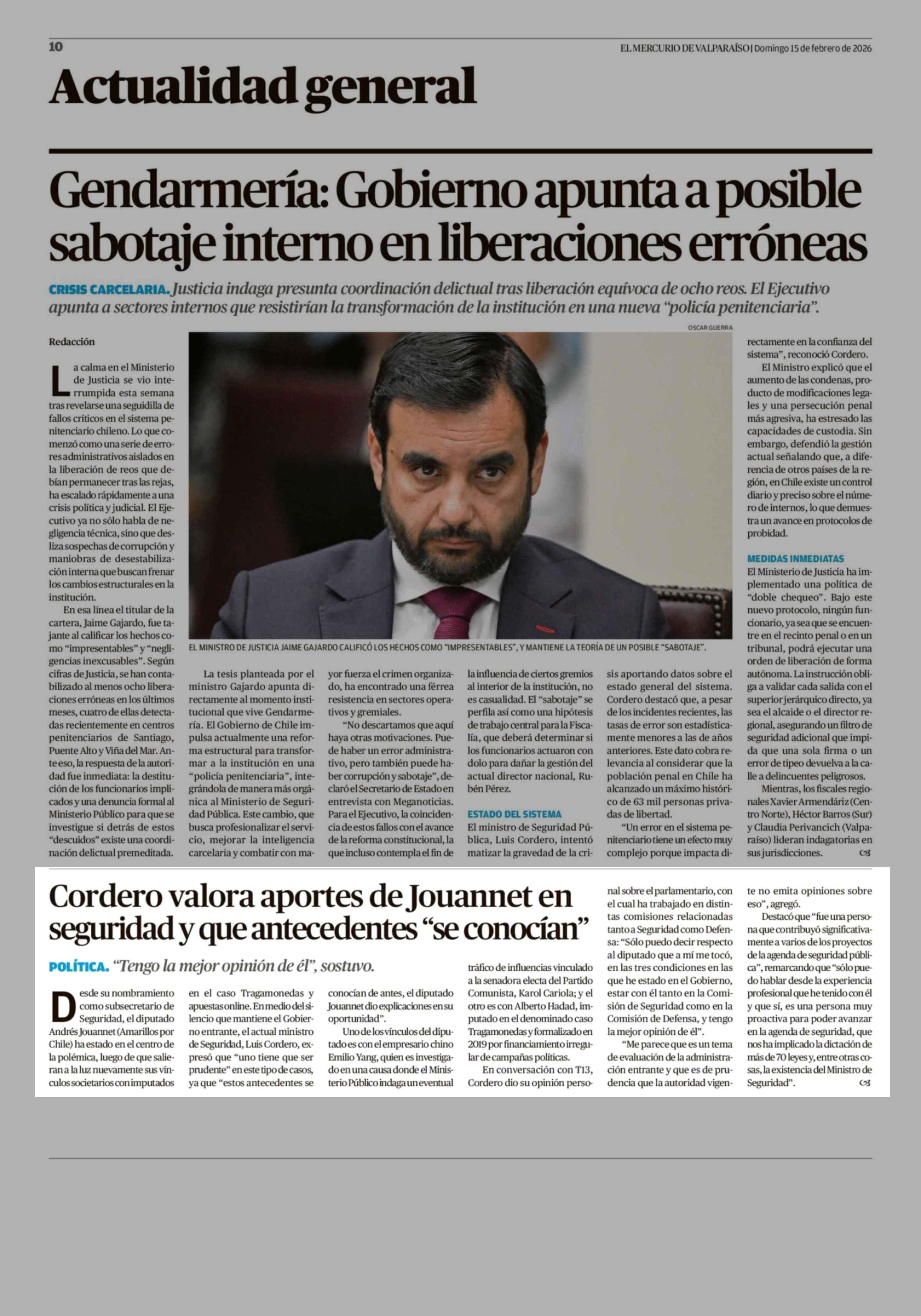 Cordero valora aportes de Jouannet en seguridad y que antecedentes "se conocían" 15-02-2026 El Mercurio de Valparaíso |