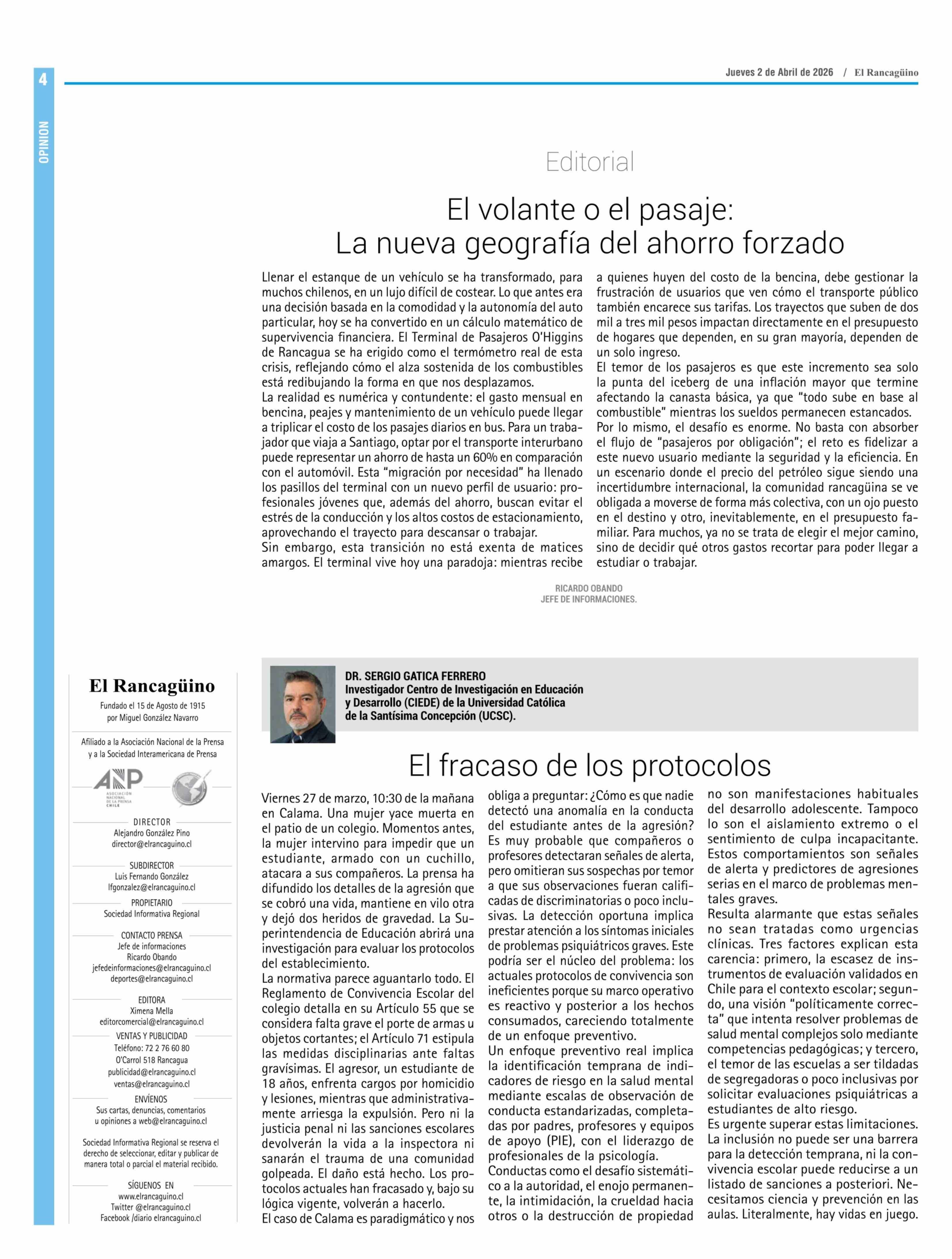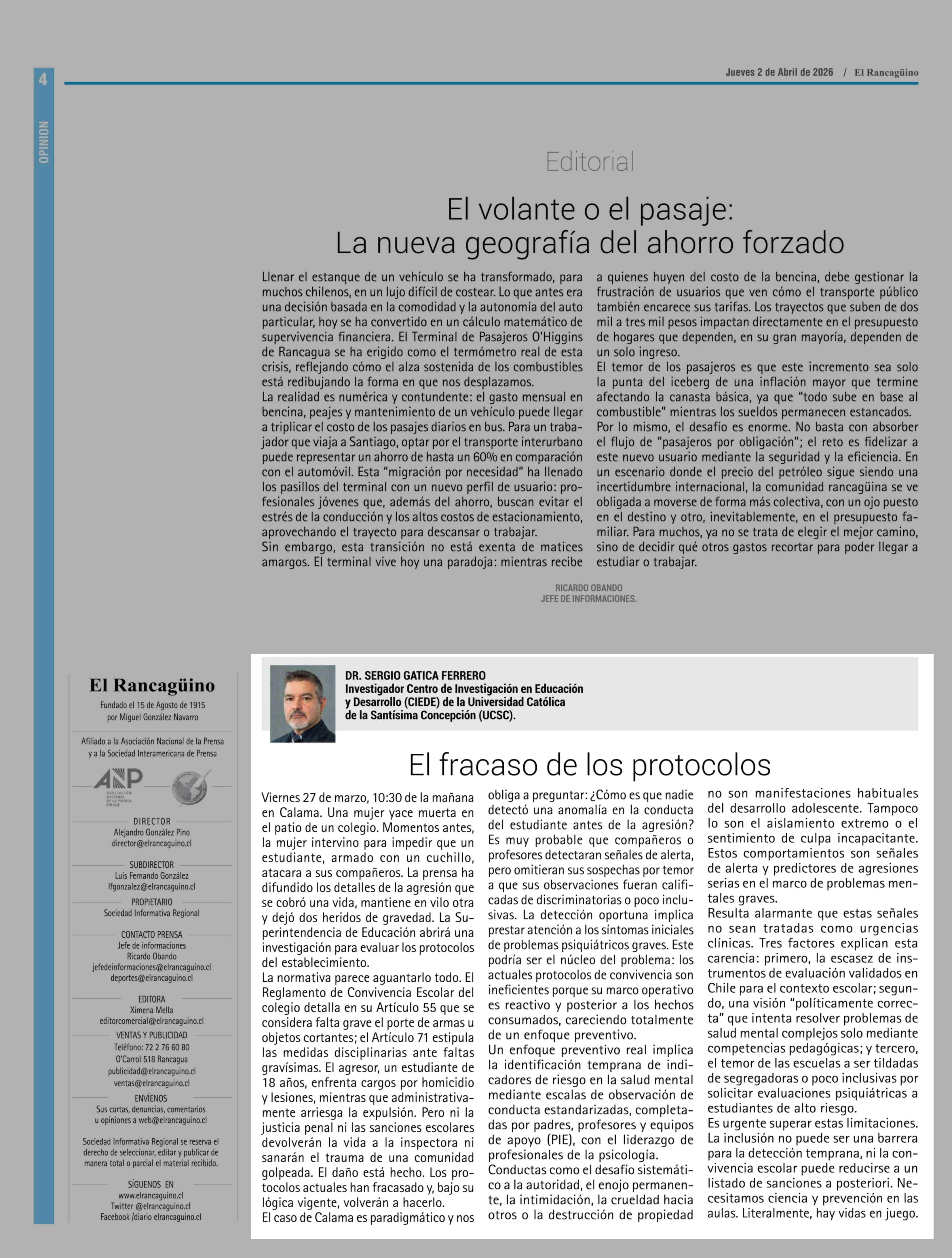 Columnas de Opinión: El fracaso de los protocolos 02-04-2026 El Rancagüino |
