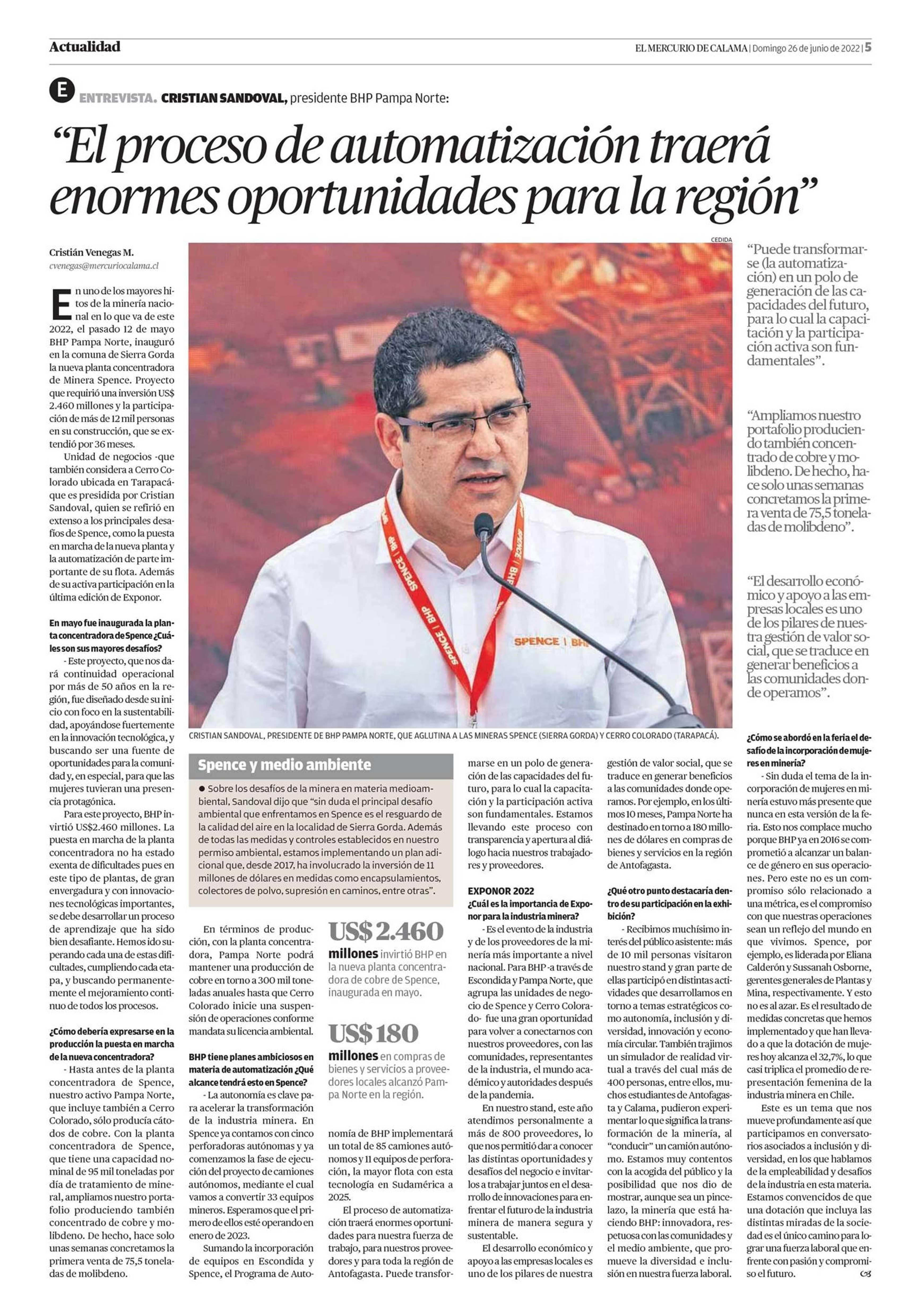 “El proceso de automatización traerá enormes oportunidades para la región” 26-06-2022 El Mercurio de Calama |