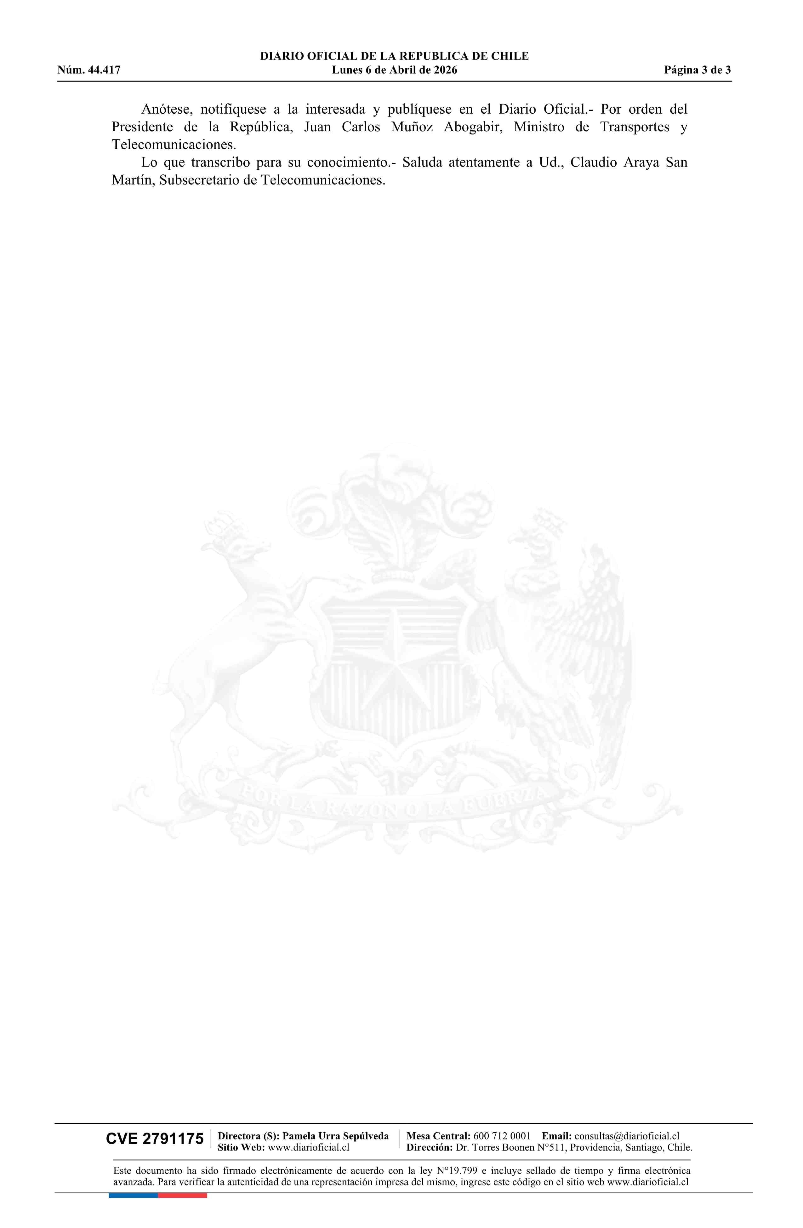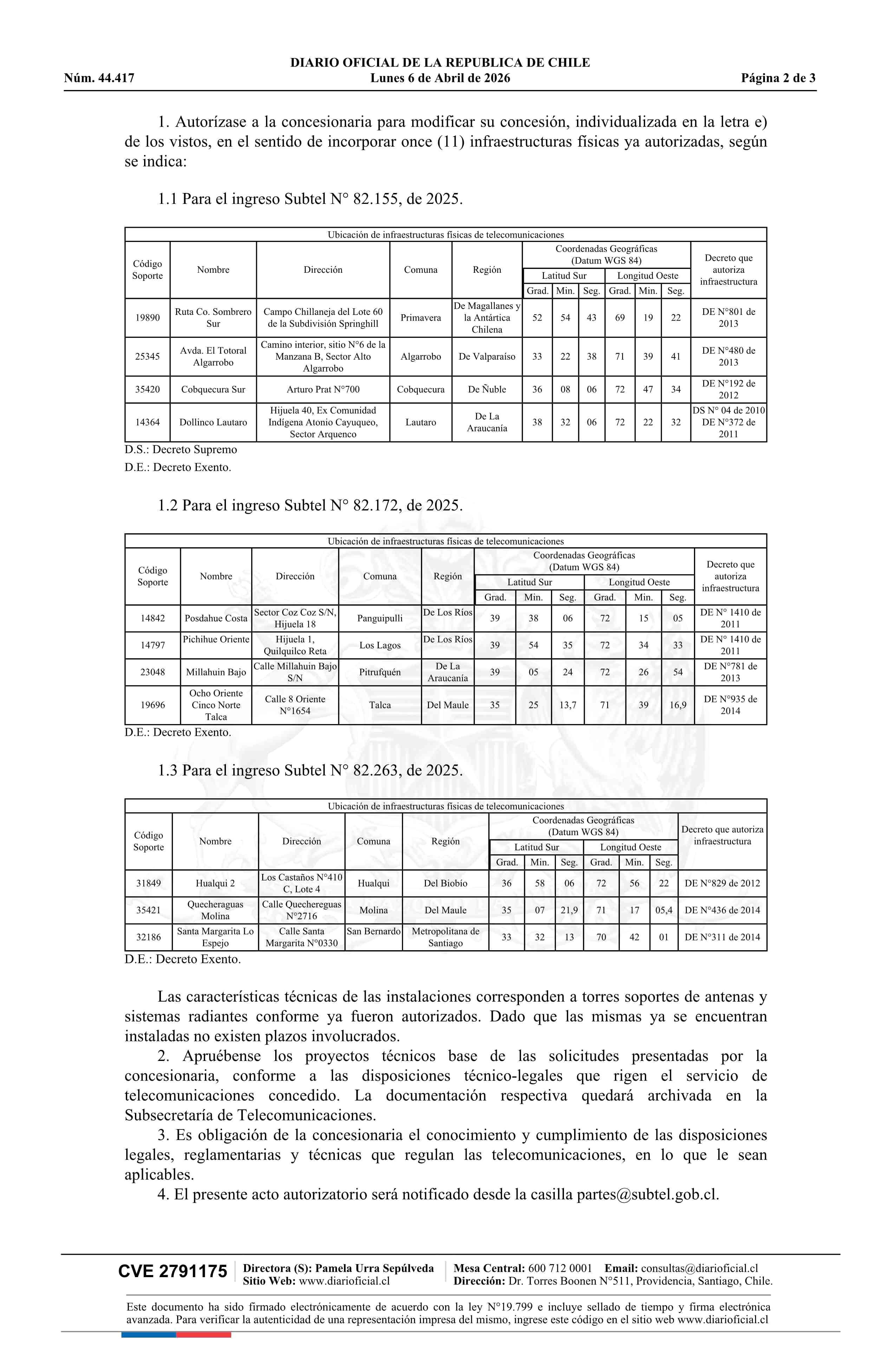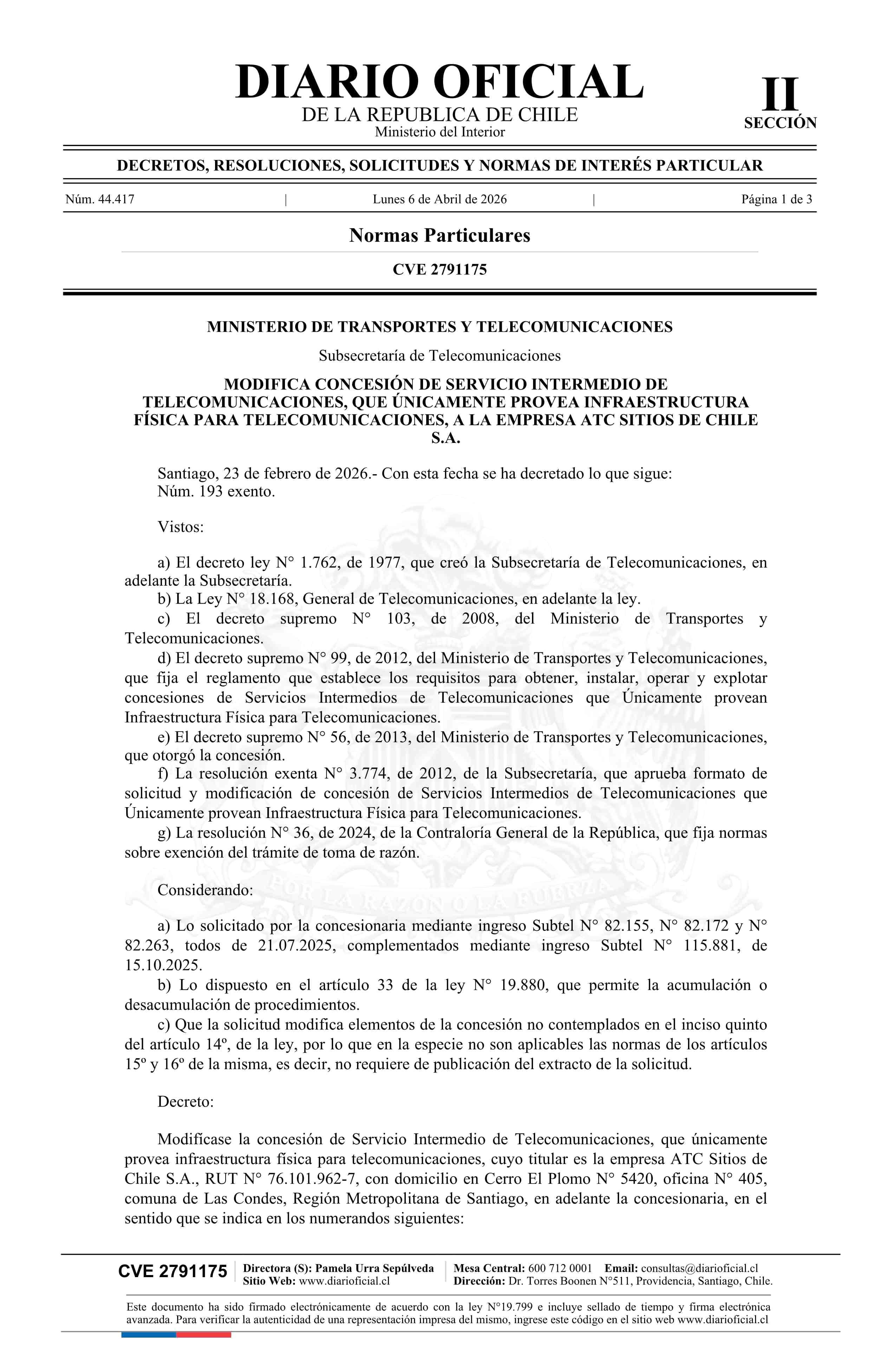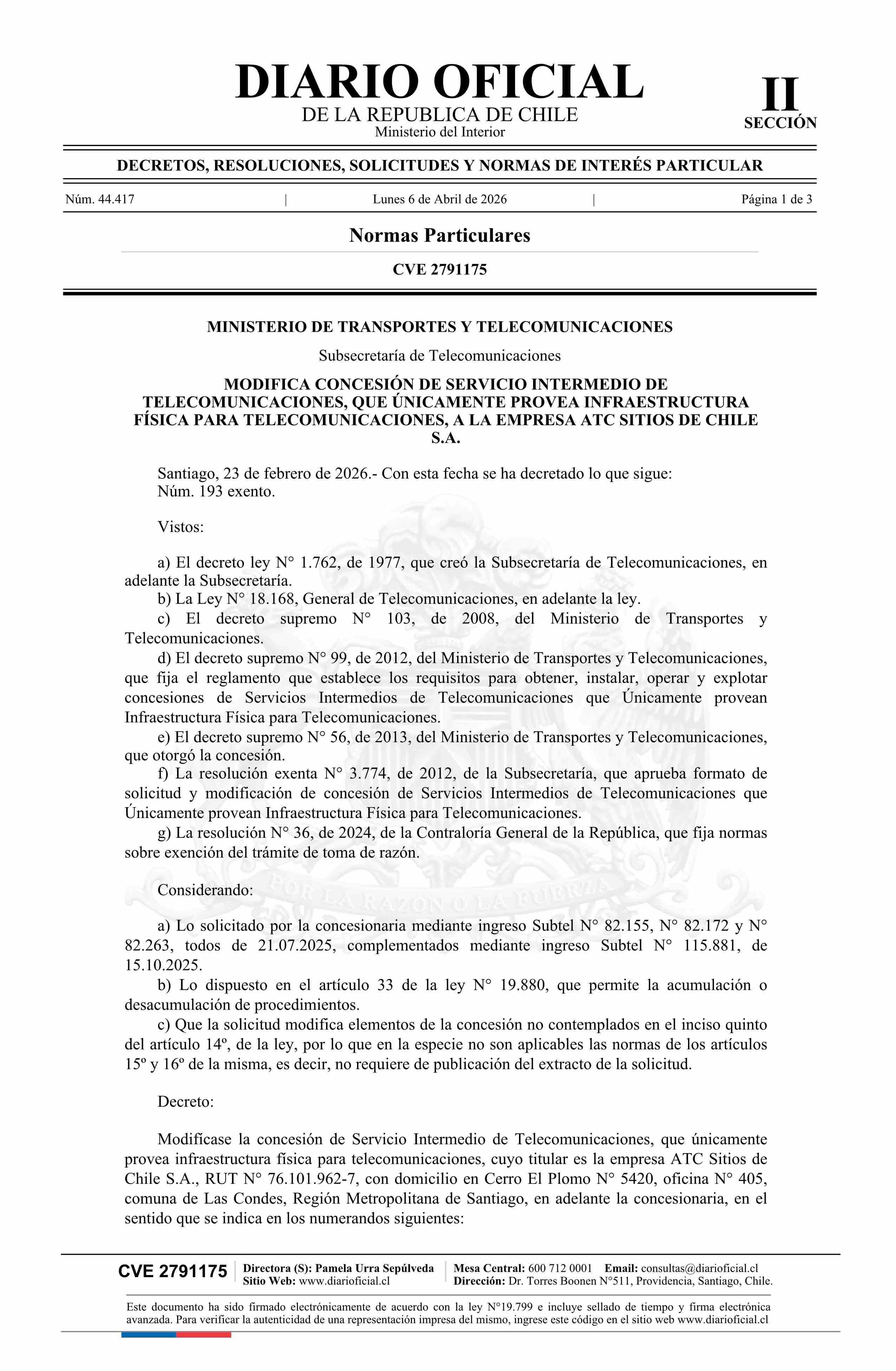 | Título: | Decreto exento número 193, de 2026.- Modifica concesión de servicio intermedio de telecomunicaciones, que únicamente provea infraestructura física para telecomunicaciones, a la empresa ATC Sitios de Chile S.A. |