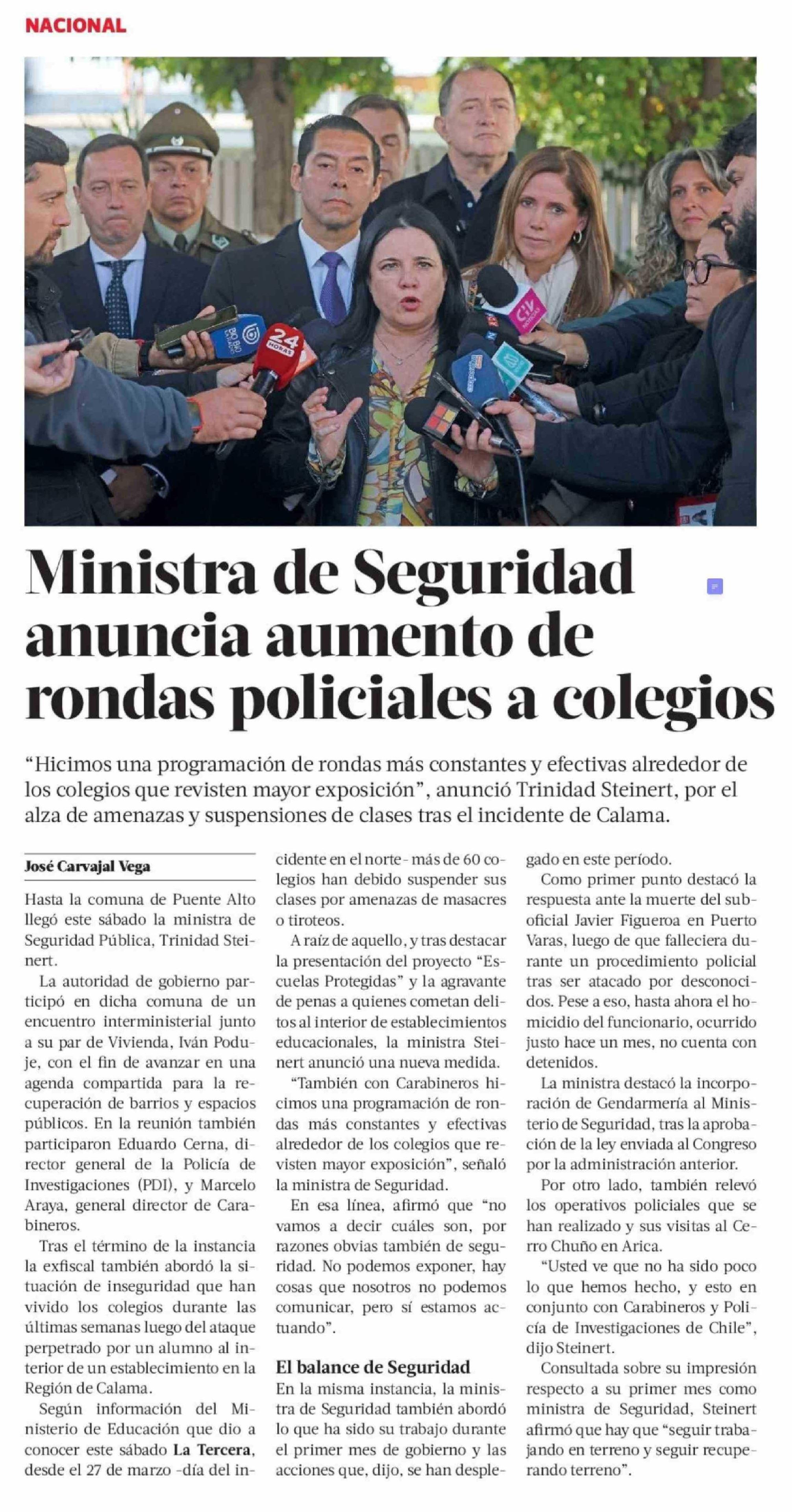 Ministra de Seguridad anuncia aumento de rondas policiales a colegios 12-04-2026 La Tercera |