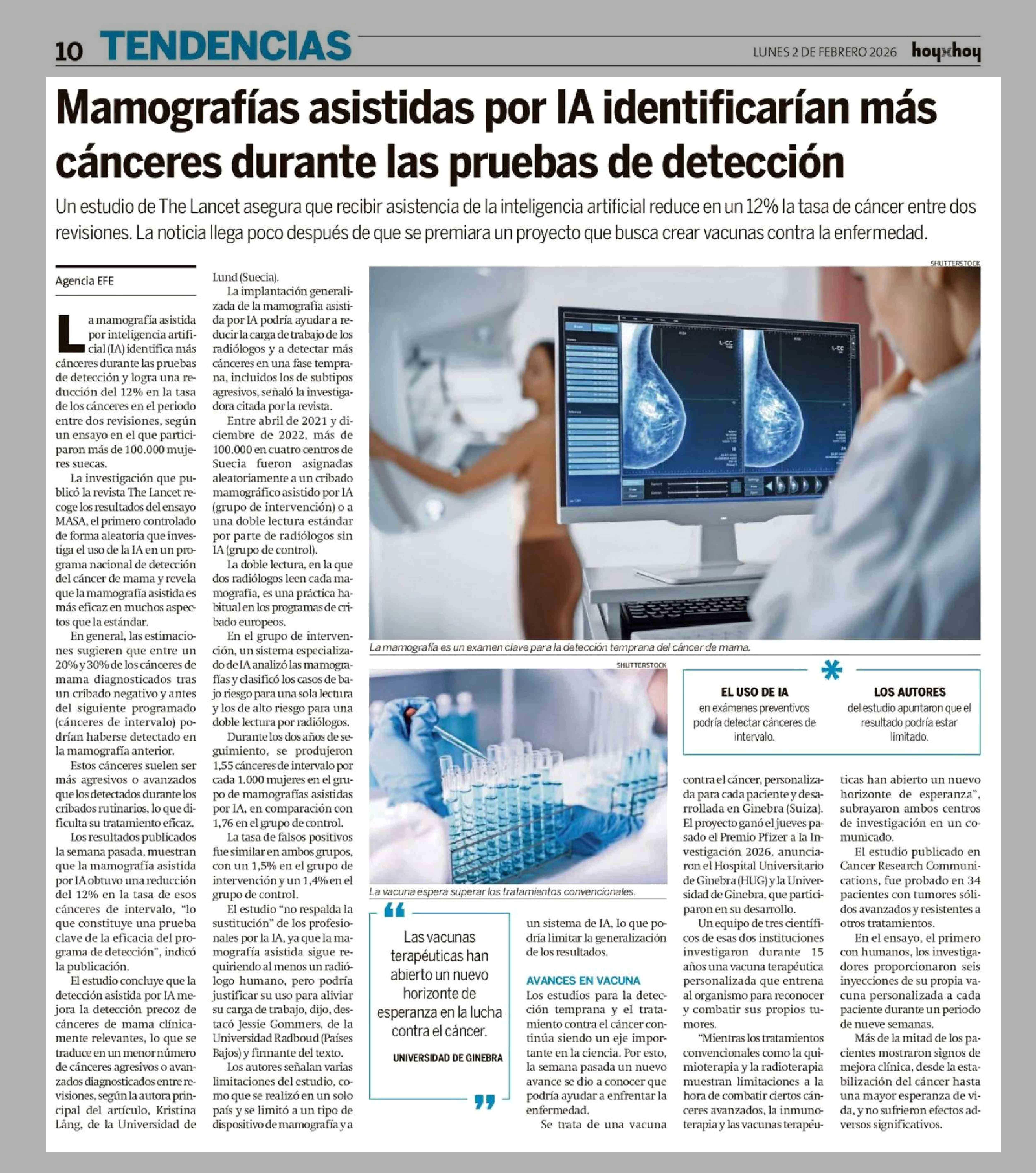 Mamografías asistidas por IA identificarían más cánceres durante las pruebas de detección 02-02-2026 Hoy x Hoy Concepción |