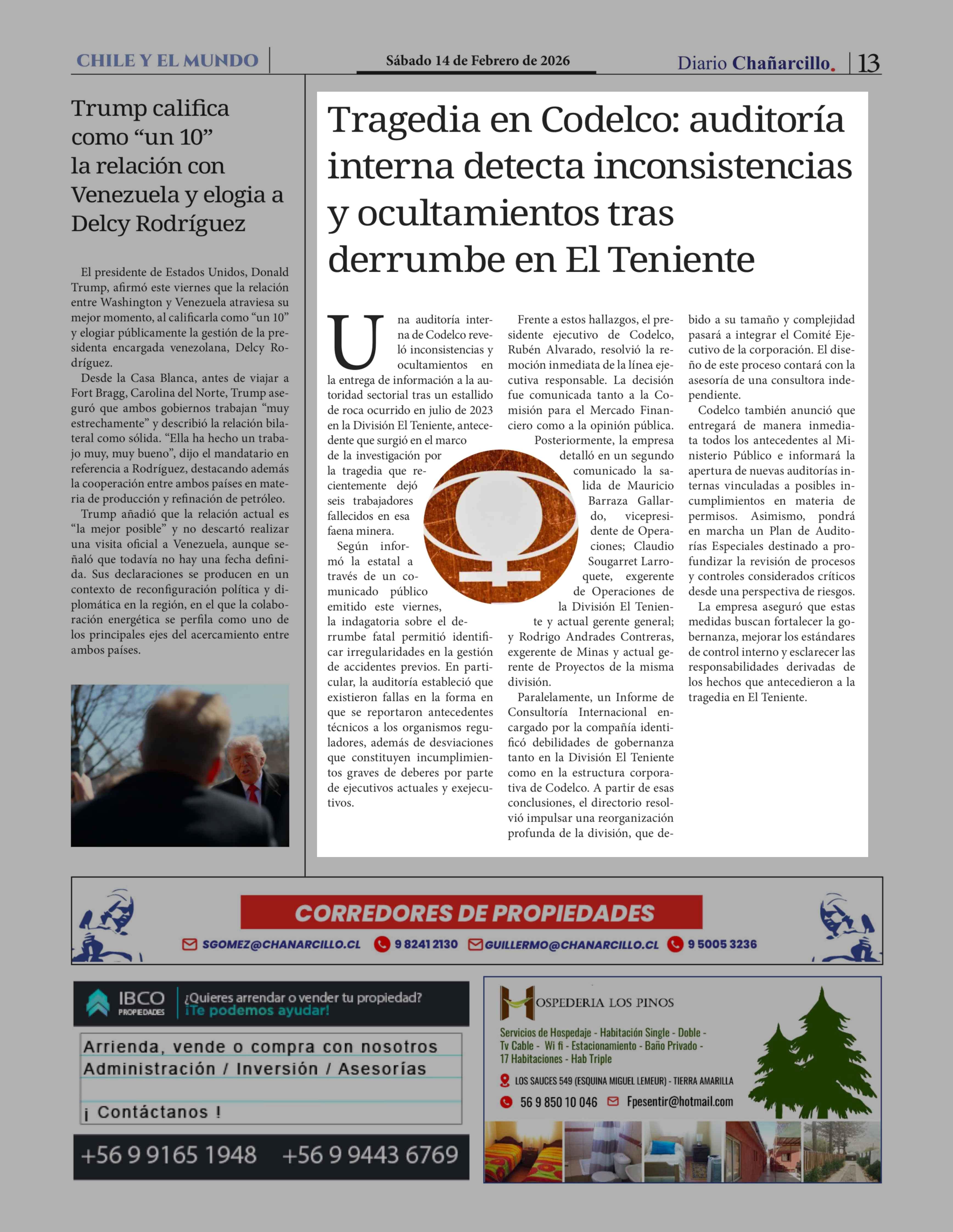 Tragedia en Codelco: auditoría interna detecta inconsistencias y ocultamientos tras derrumbe en El Teniente 14-02-2026 Diario Chañarcillo |