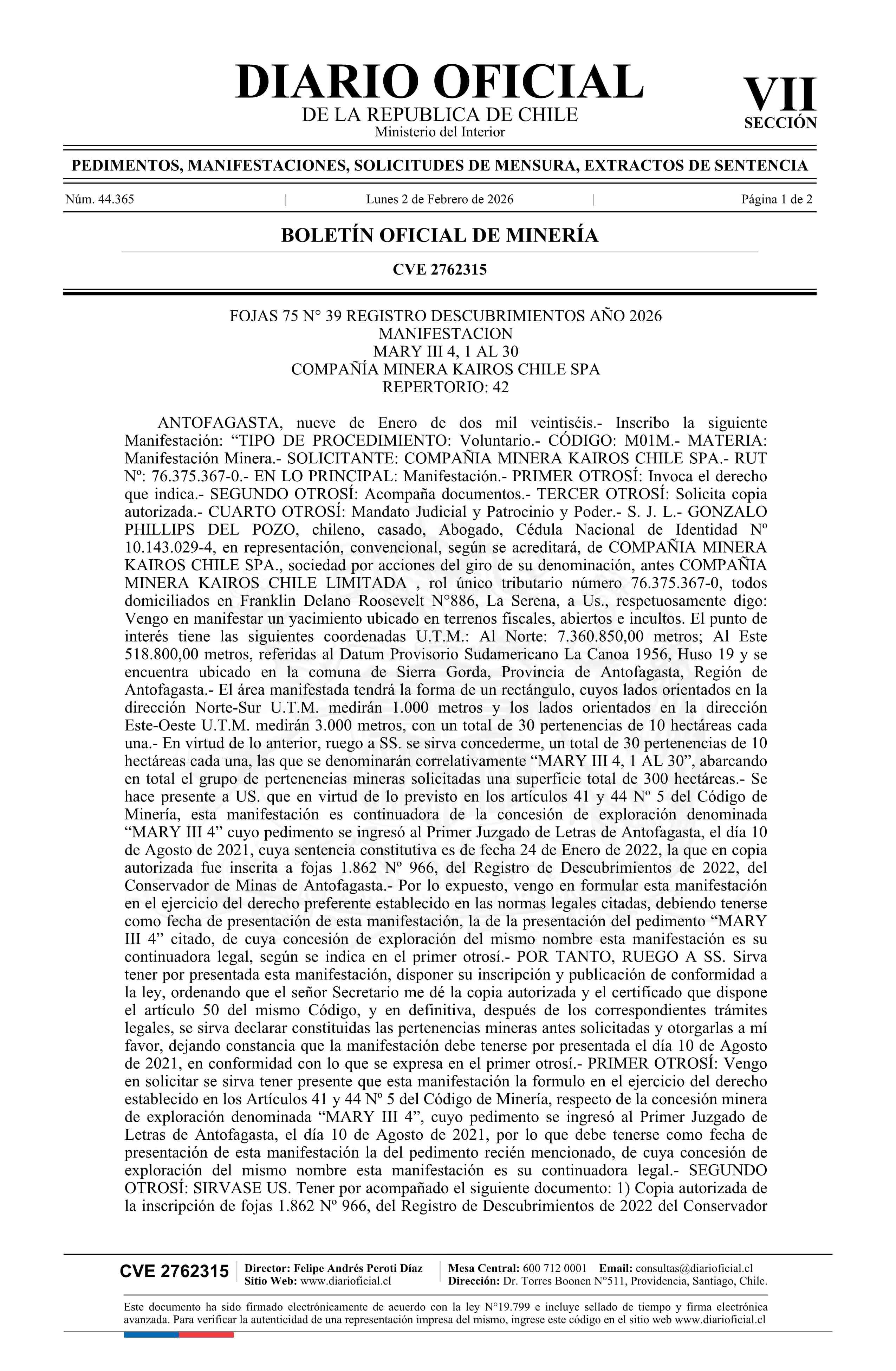 MARY III 4, 1 AL 30 / Compañía Minera Kairos Chile SpA 02-02-2026 DIARIO OFICIAL CHILE - BOLETÍN OFICIAL DE MINERÍA |