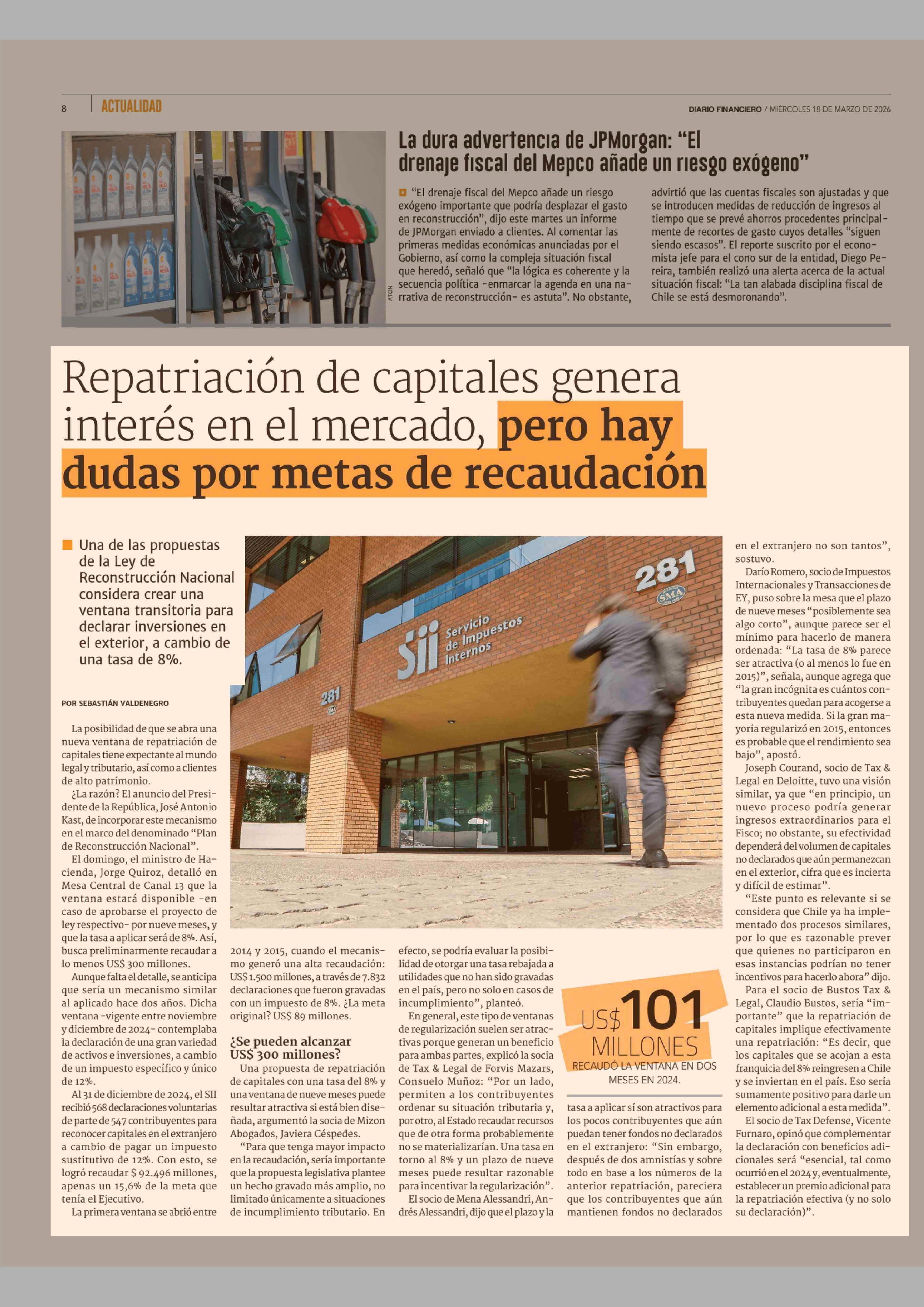 Repatriación de capitales genera interés en el mercado, pero hay dudas por metas de recaudación 18-03-2026 Diario Financiero |