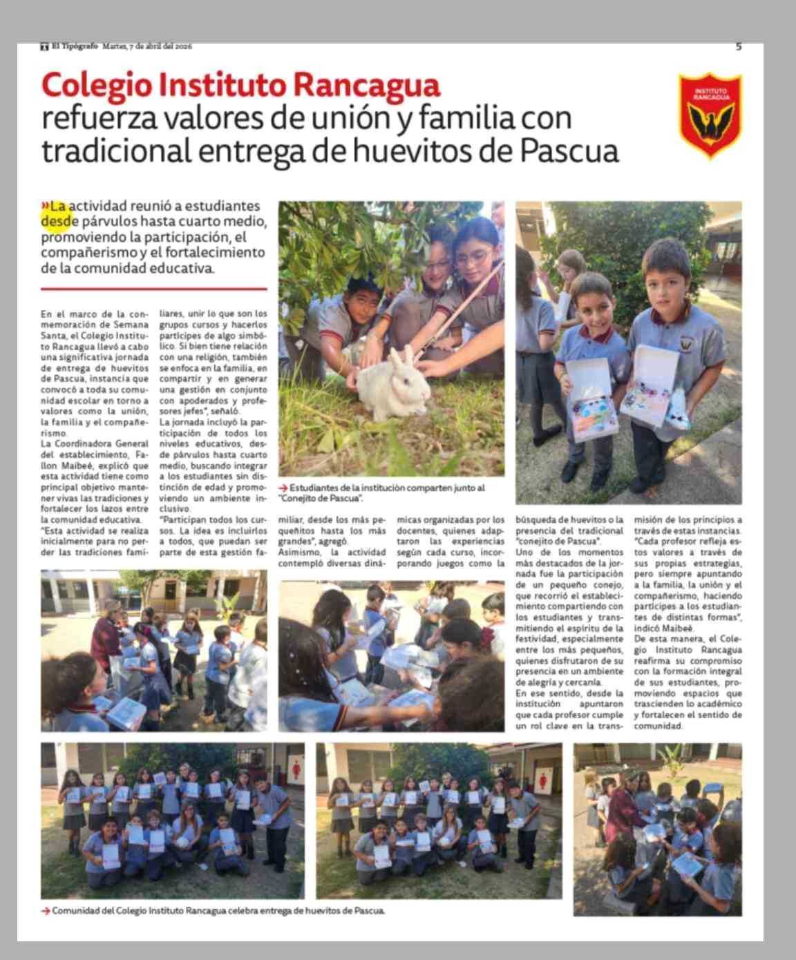 Título: Colegio Instituto Rancagua refuerza valores de unión y familia con tradicional entrega de huevitos de Pascua