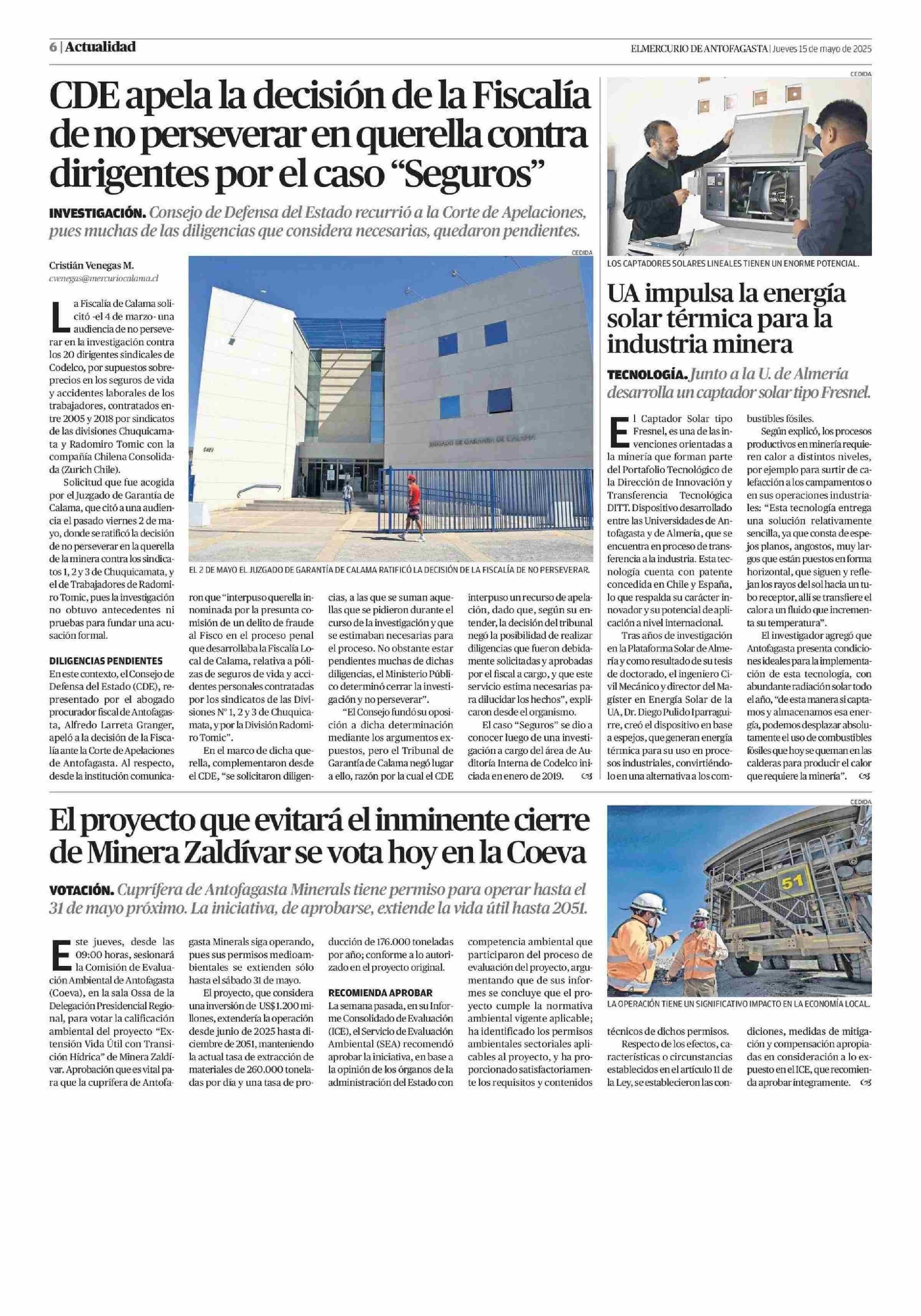 CDE apela la decisión de la Fiscalía de no perseverar en querella contra dirigentes por el caso “Seguros” 15-05-2025 El Mercurio de Antofagasta |