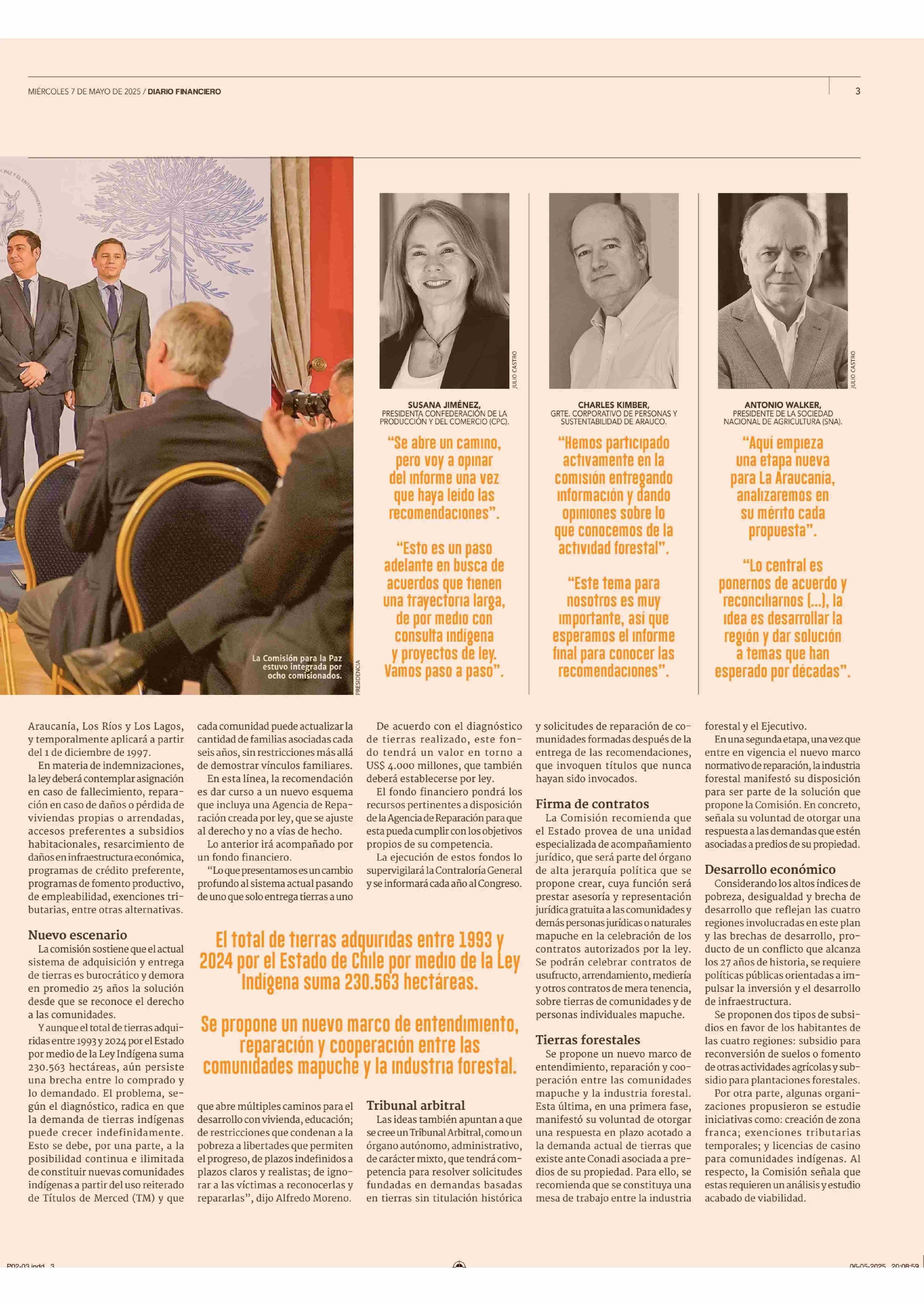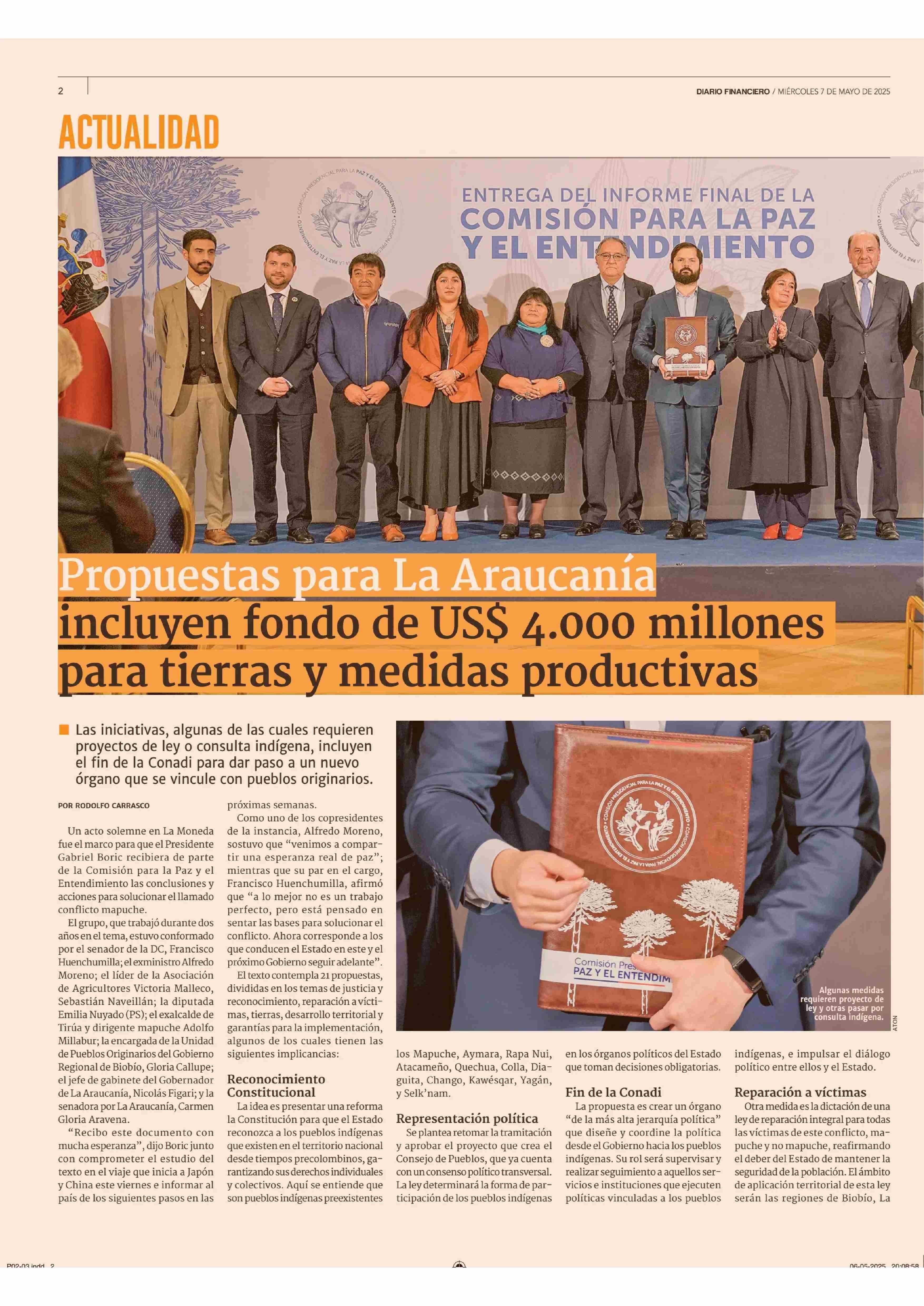 Propuestas para La Araucanía incluyen fondo de US$ 4.000 millones para tierras y medidas productivas 07-05-2025 Diario Financiero |