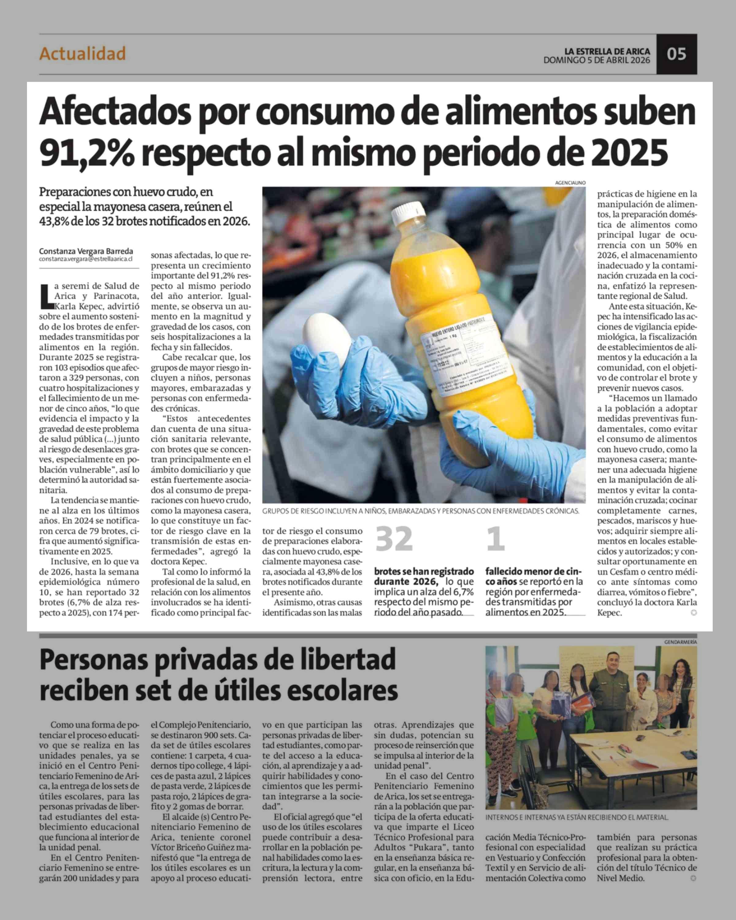Afectados por consumo de alimentos suben 91,2% respecto al mismo periodo de 2025 05-04-2026 La Estrella de Arica |