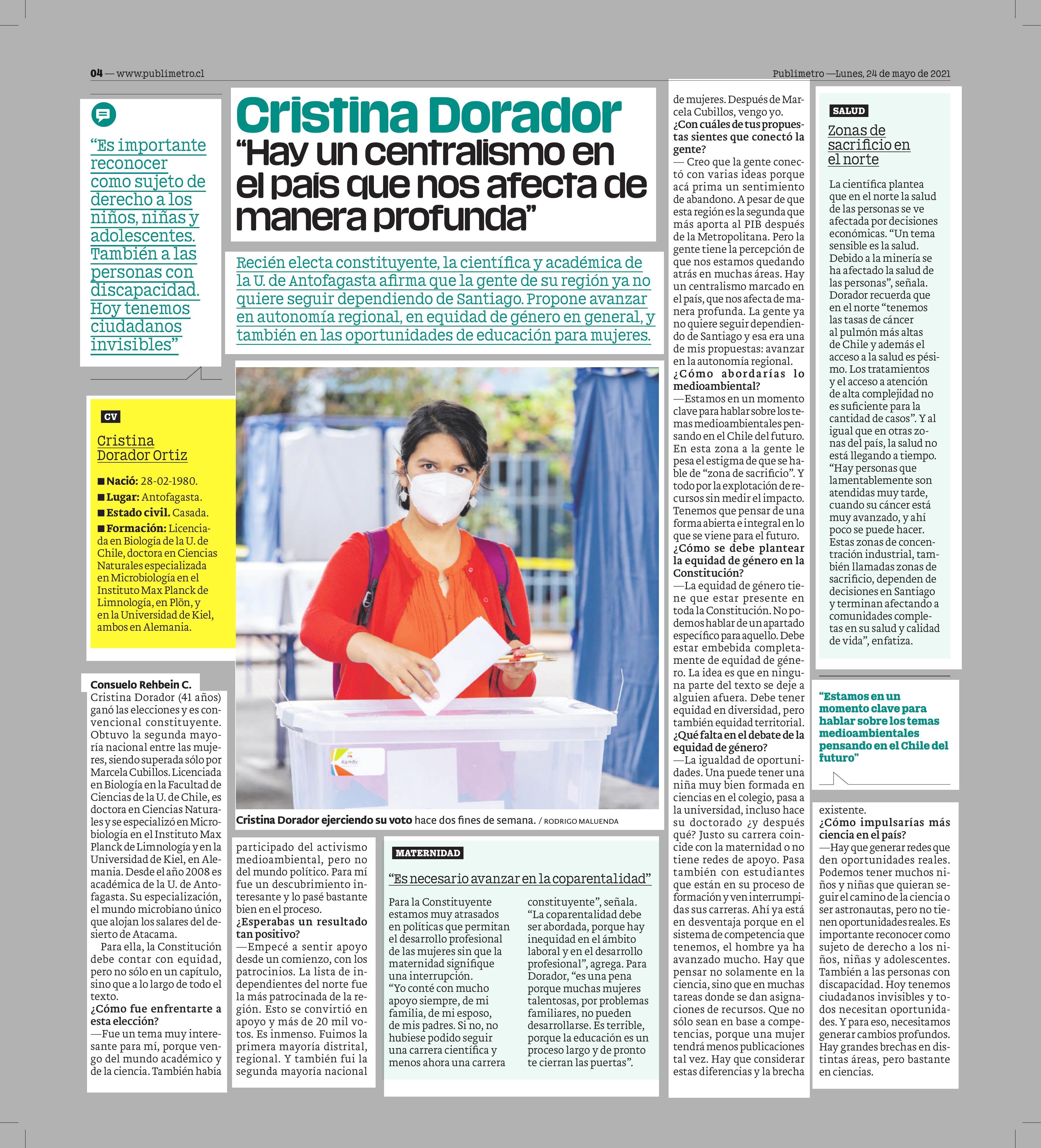 | Cristina Dorador "Hay un centralismo en el país que nos afecta de manera profunda" 24-05-2021 Publimetro |
