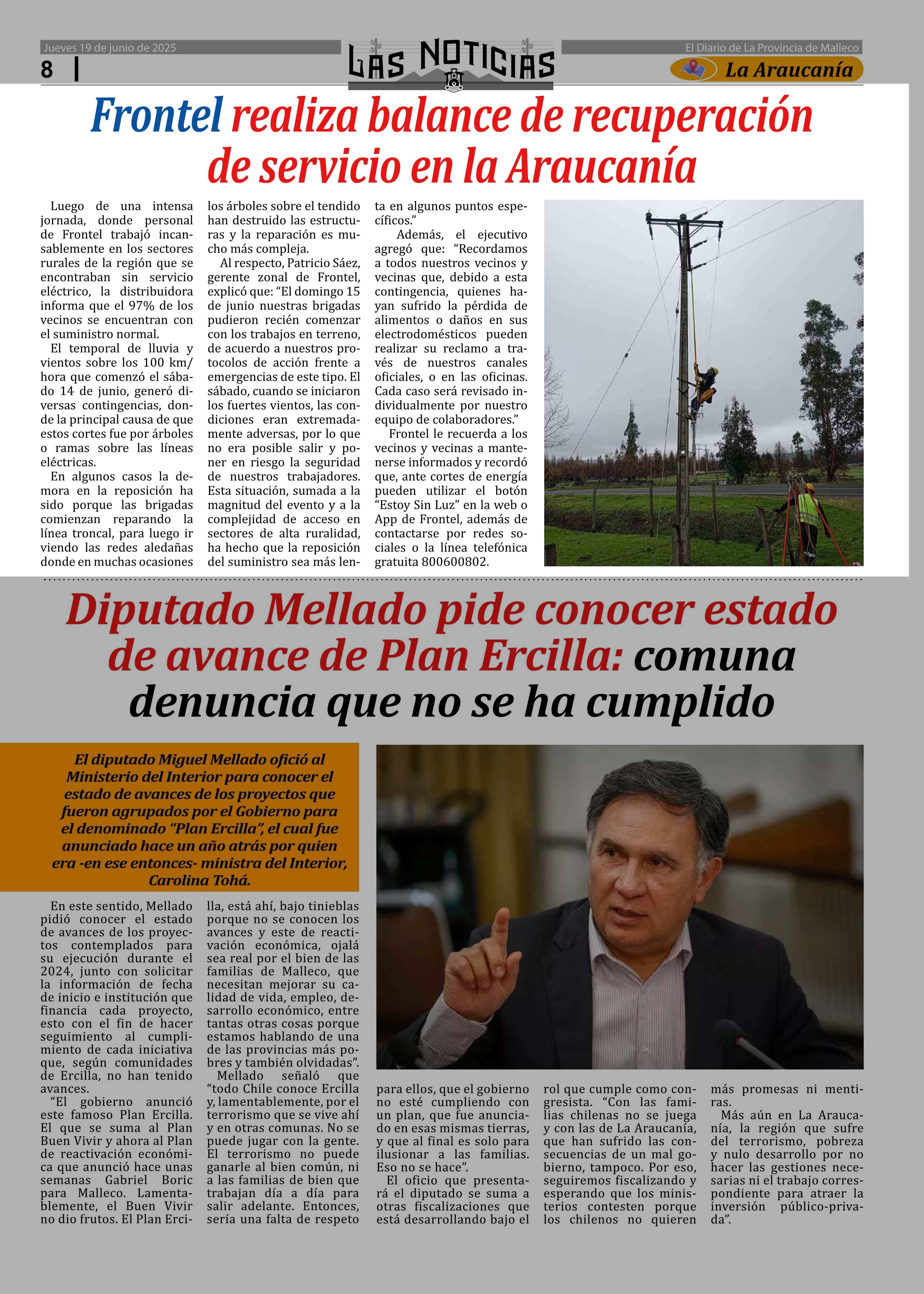 Frontel realiza balance de recuperación de servicio en la Araucanía 19-06-2025 Las Noticias |